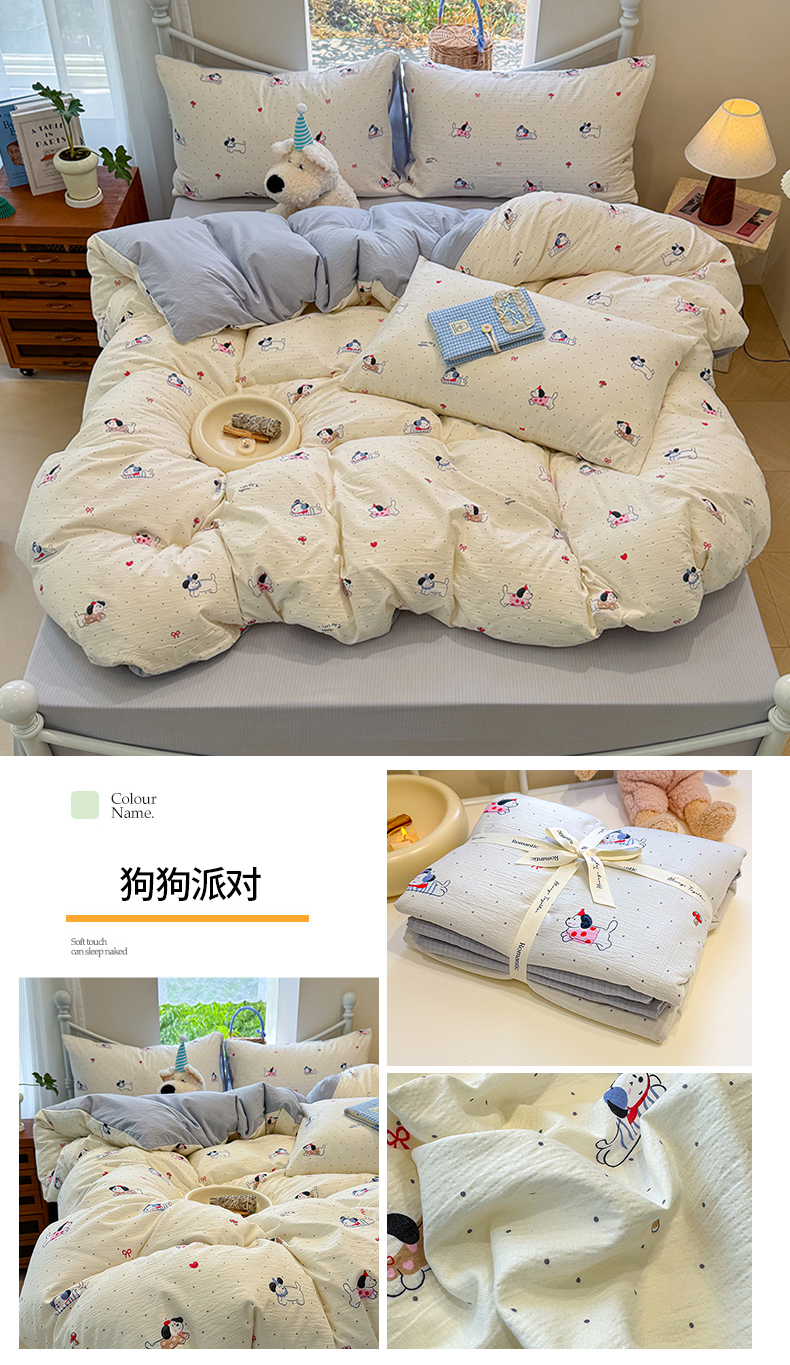 当前位置: 91家纺网 > 商品网购 > 床品套件 > 四件套 > 双层纱四件套 > 颜选 2025春夏新款双层纱印花四件套 狗狗派对