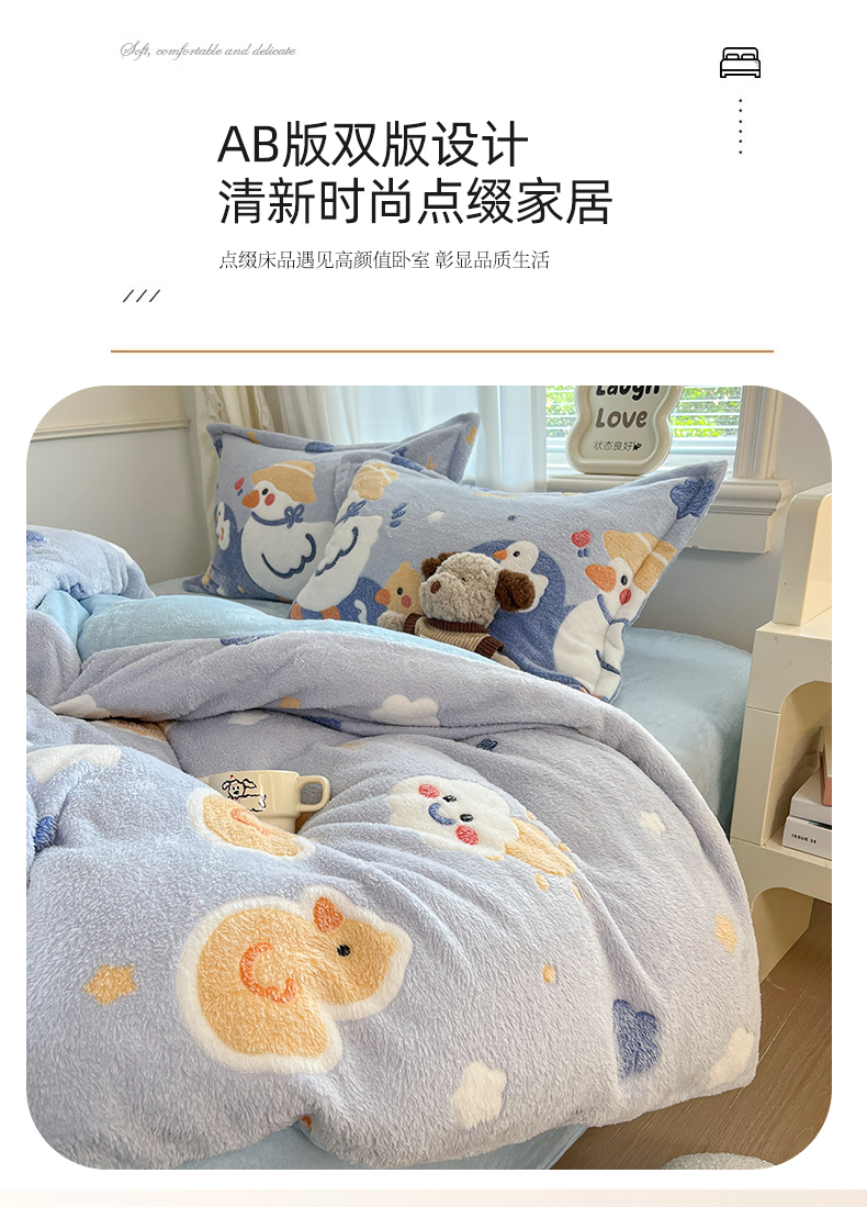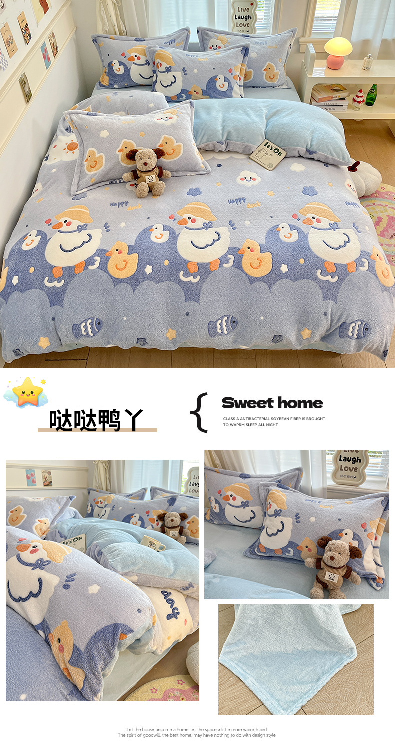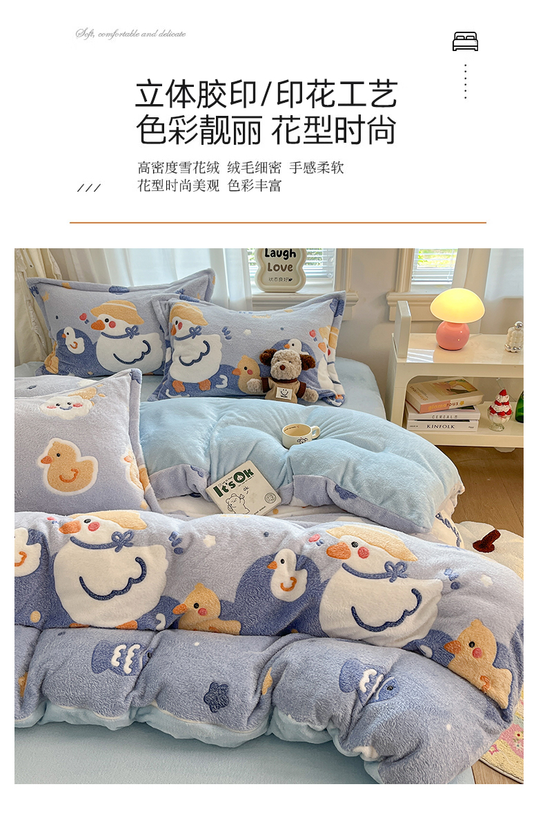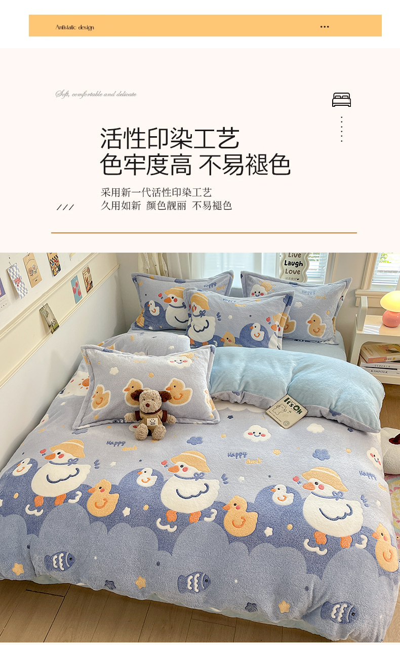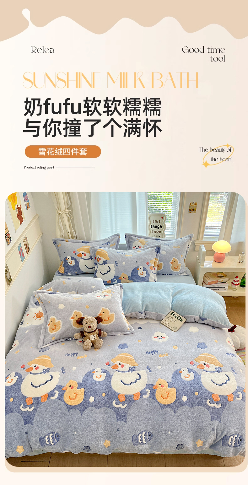 当前位置: 91家纺网 > 商品网购 > 床品套件 > 四件套 > 法莱绒四件套 > 川悦生活 2025新款立体雪花绒印花大床四件套系列一场景二 哒哒鸭丫