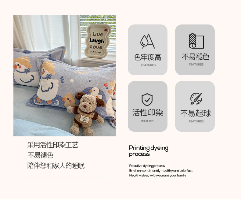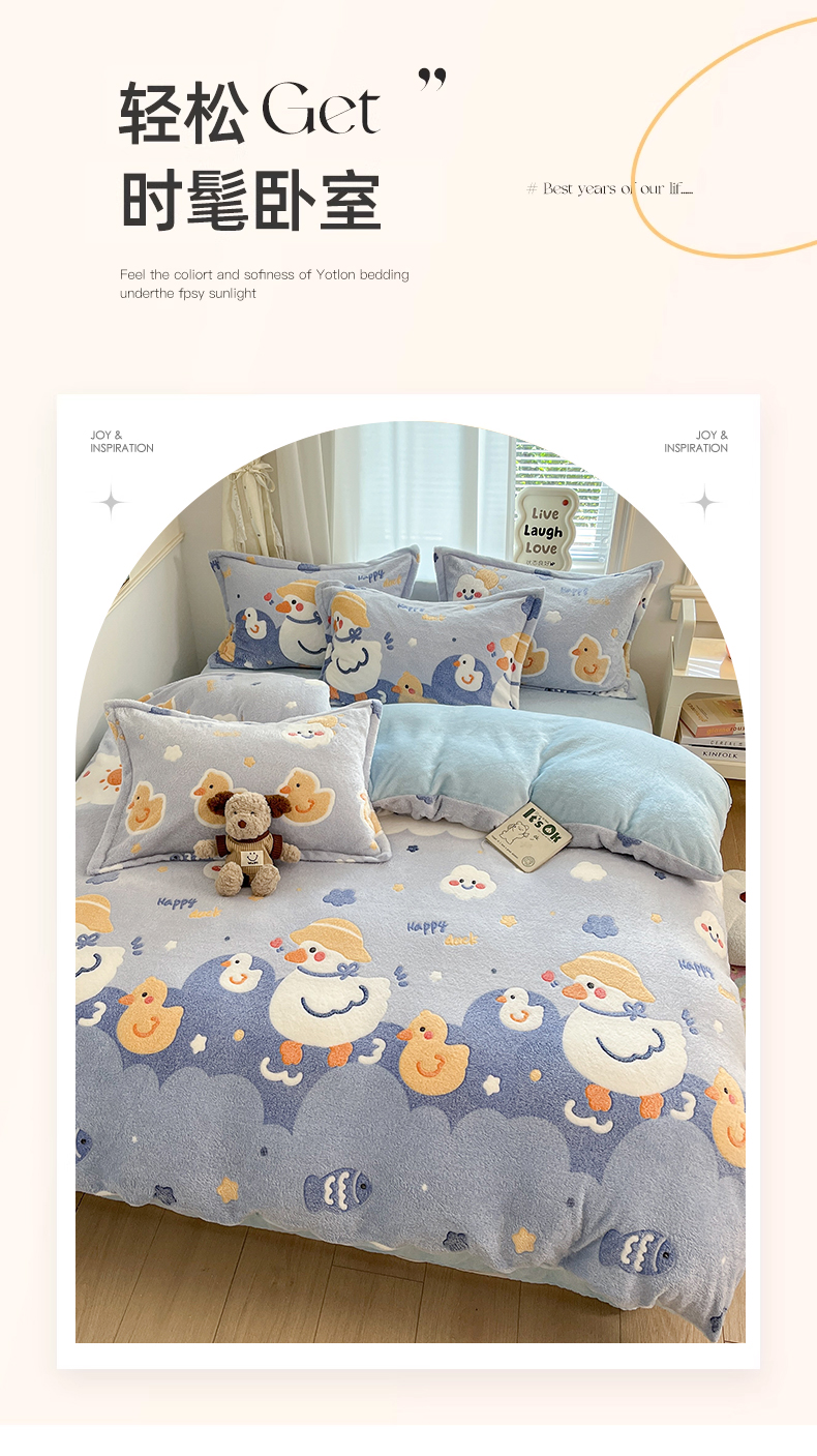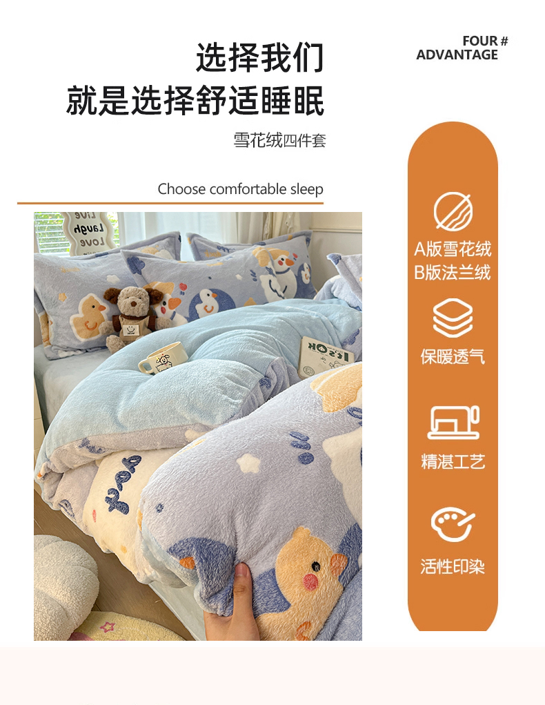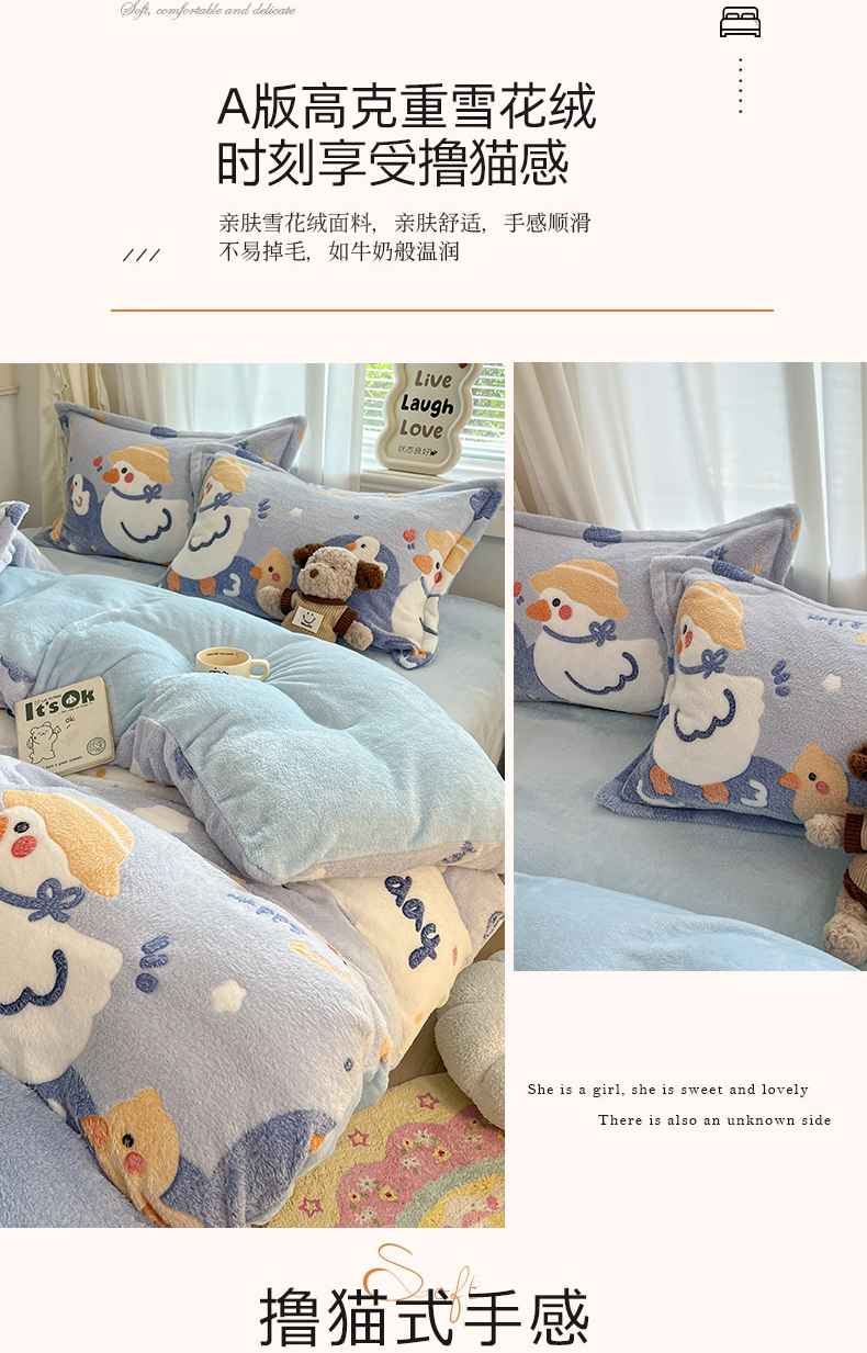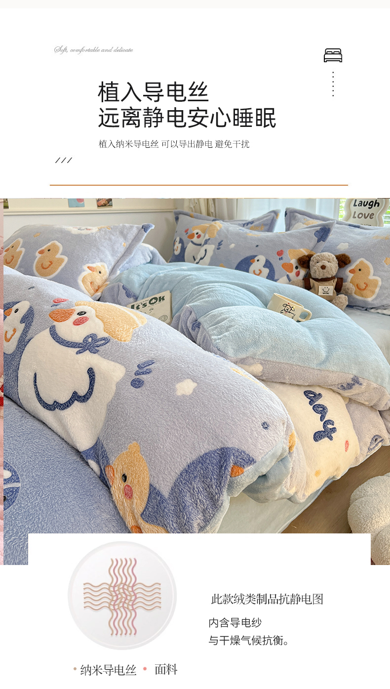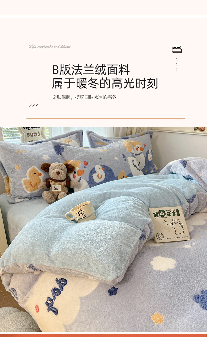 当前位置: 91家纺网 > 商品网购 > 床品套件 > 四件套 > 法莱绒四件套 > 川悦生活 2025新款立体雪花绒印花大床四件套系列一场景二 哒哒鸭丫