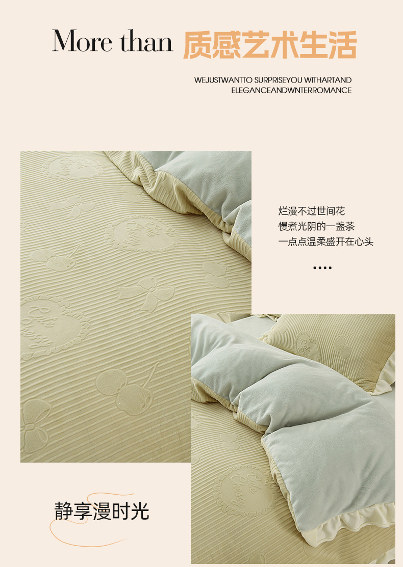 商品名称:千嘻汇家纺 2025新款8.5斤韩版雕花牛奶绒四件套 甜蜜蜜米色