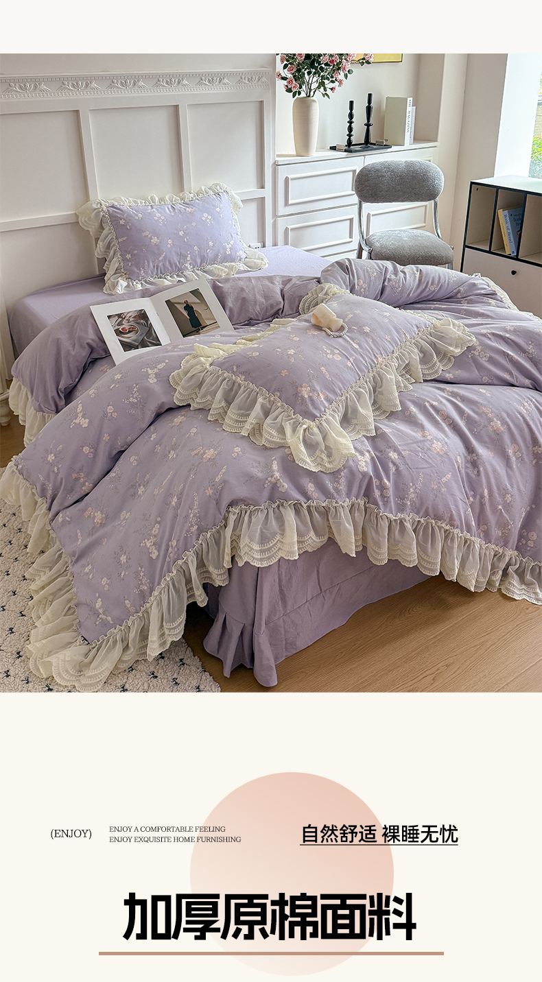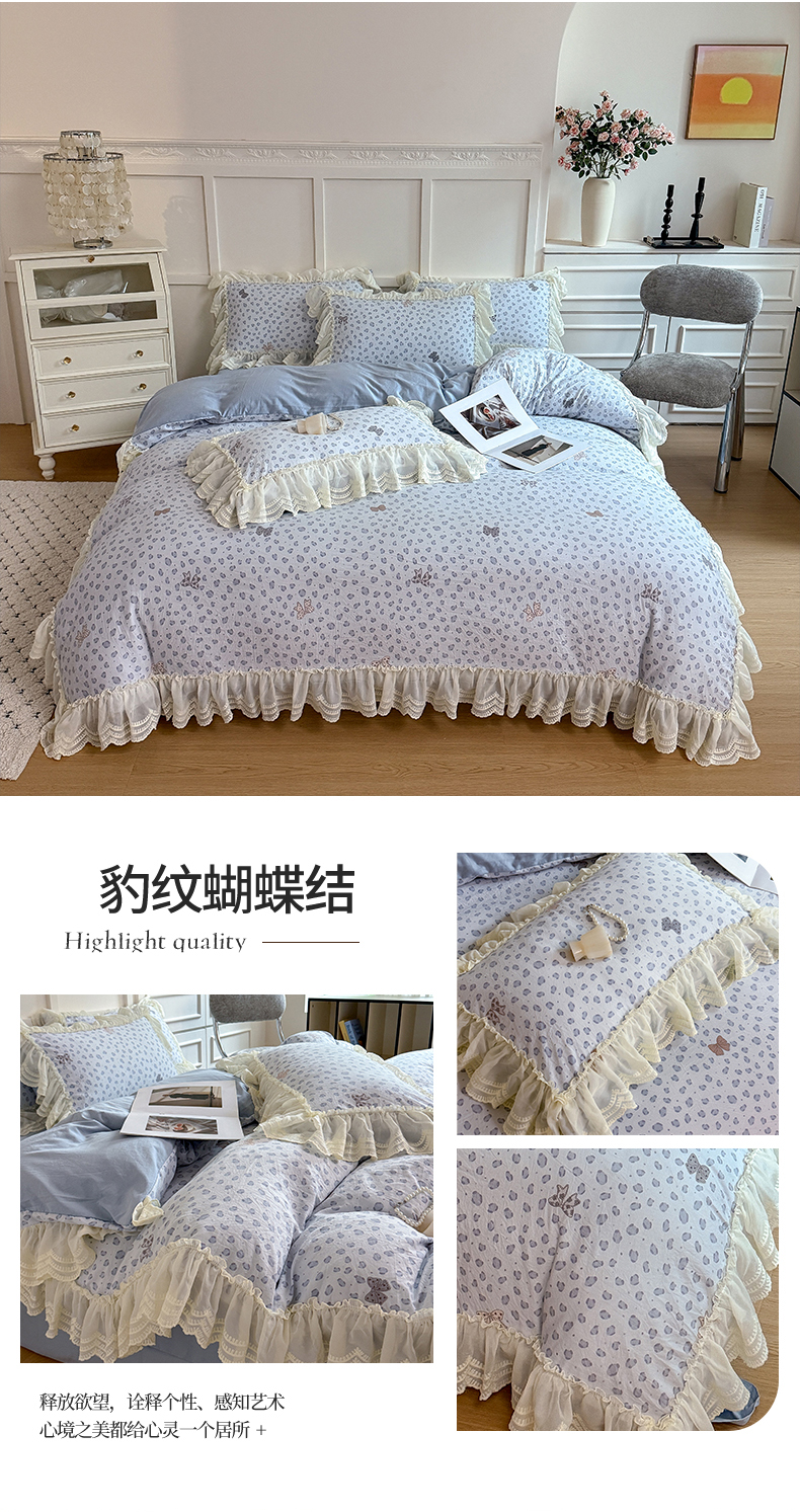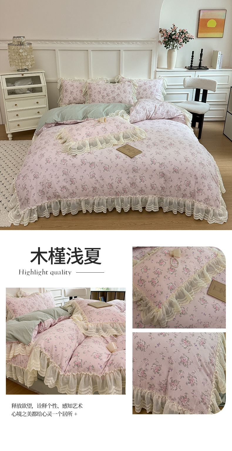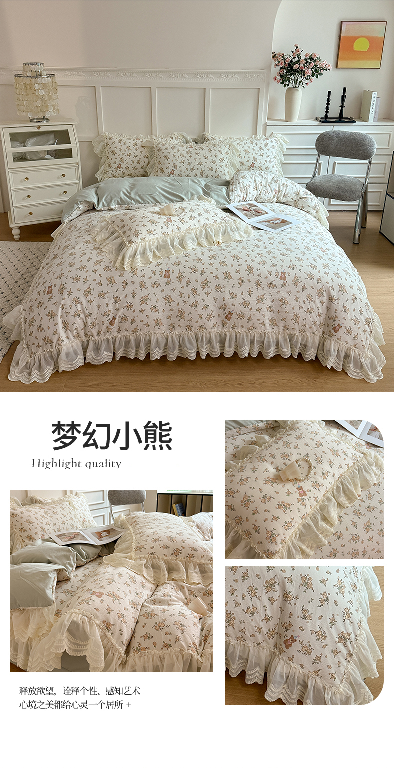 商品名称:吾欢心 2025新款韩版蕾丝花边加厚原棉四件套 科莫花园绿