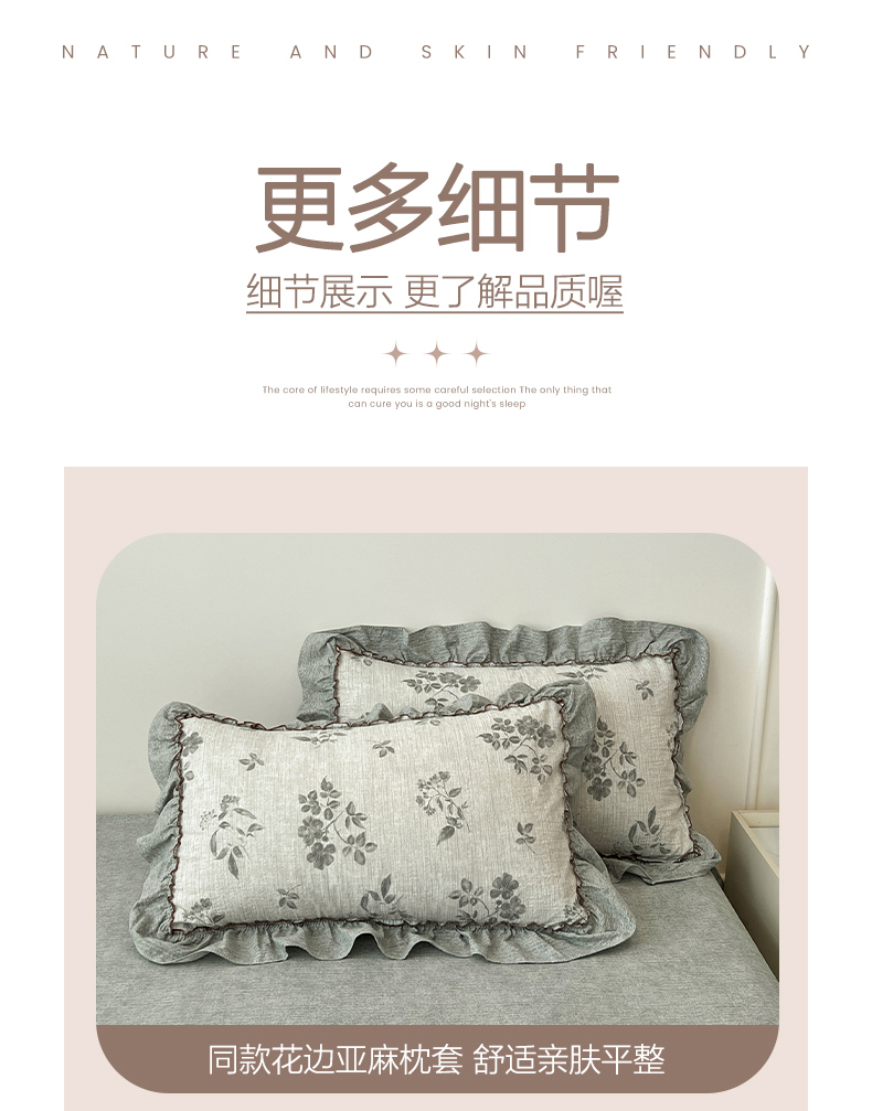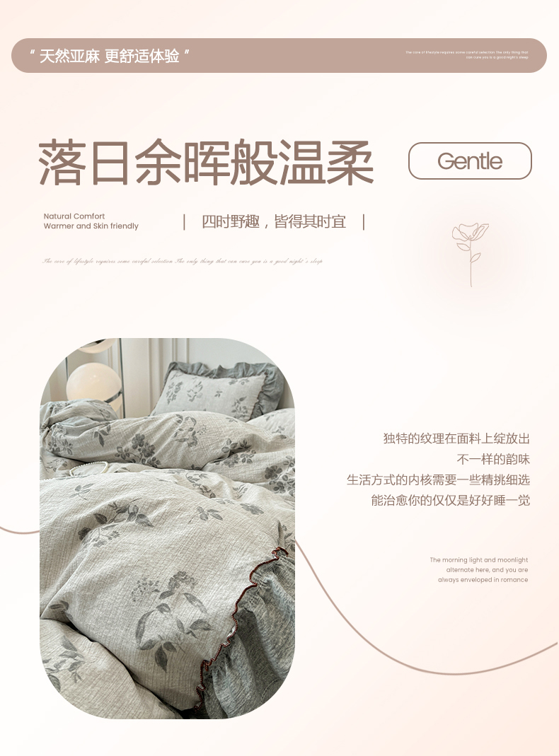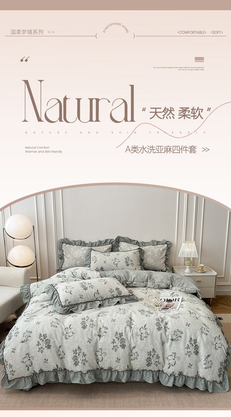 商品名称:鑫利来家纺 2025新款加厚高克重亚麻复古原麻皱皱纱印花法式花边四件套 莱茵河畔