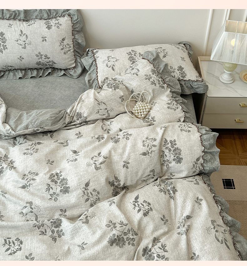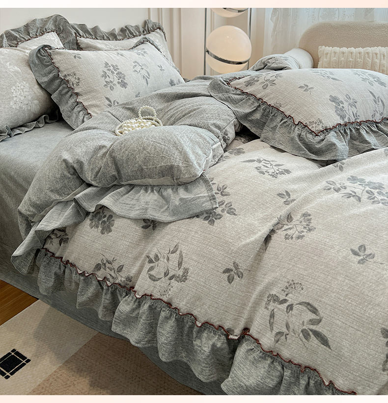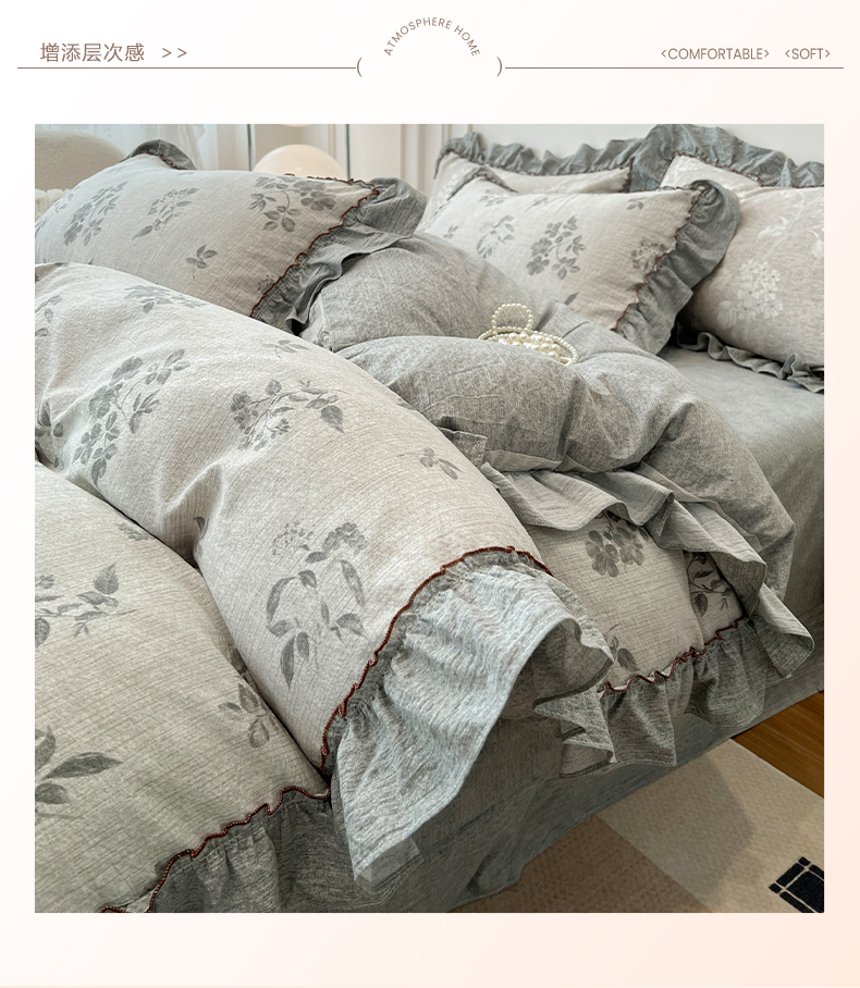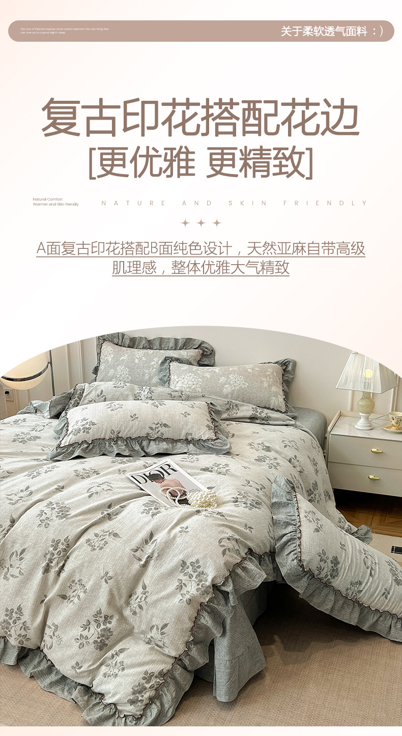 鑫利来家纺 2025新款加厚高克重亚麻复古原麻皱皱纱印花法式花边四件套 莱茵河畔