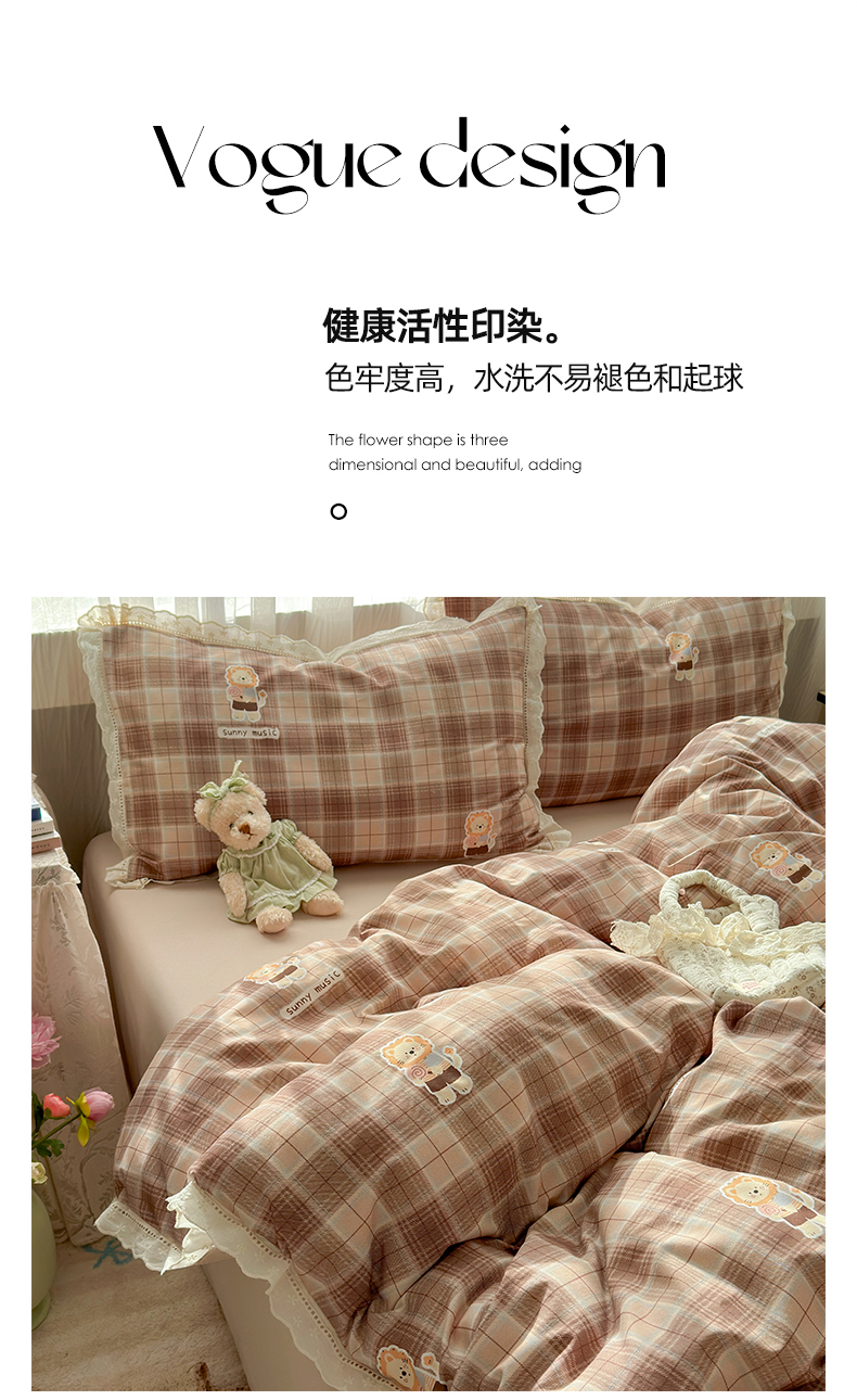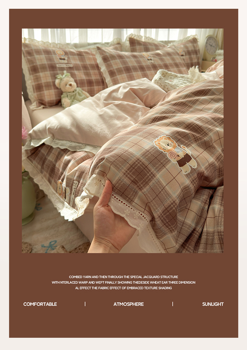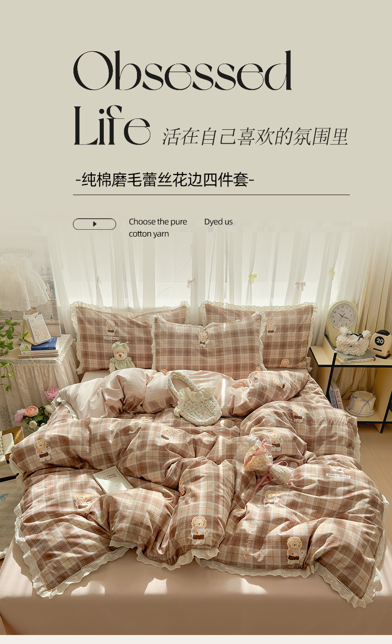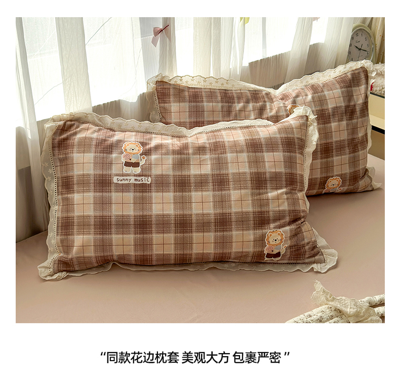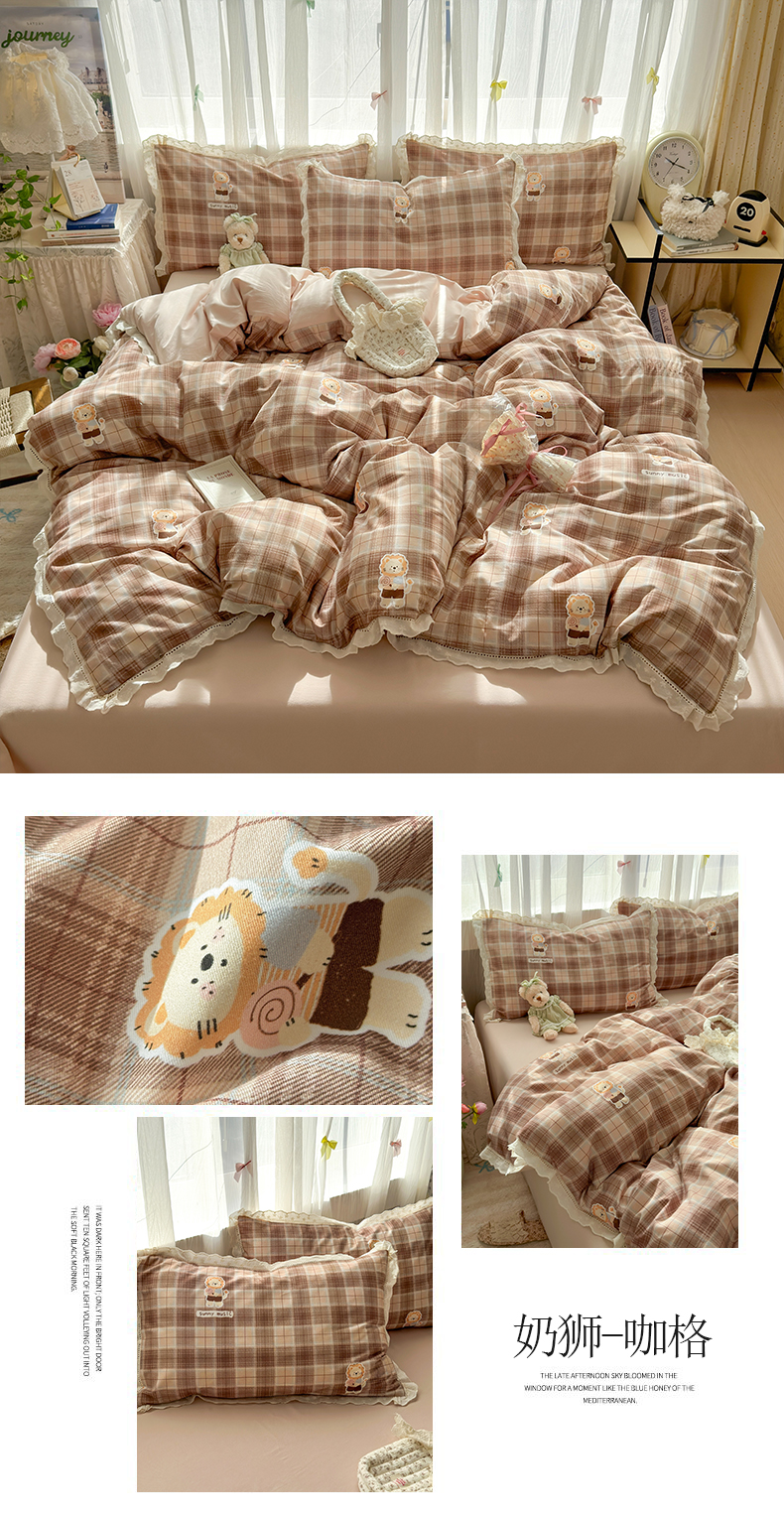 简宜家居(朝初家纺) 2025新款全棉磨毛蕾丝花边四件套 奶狮-咖格