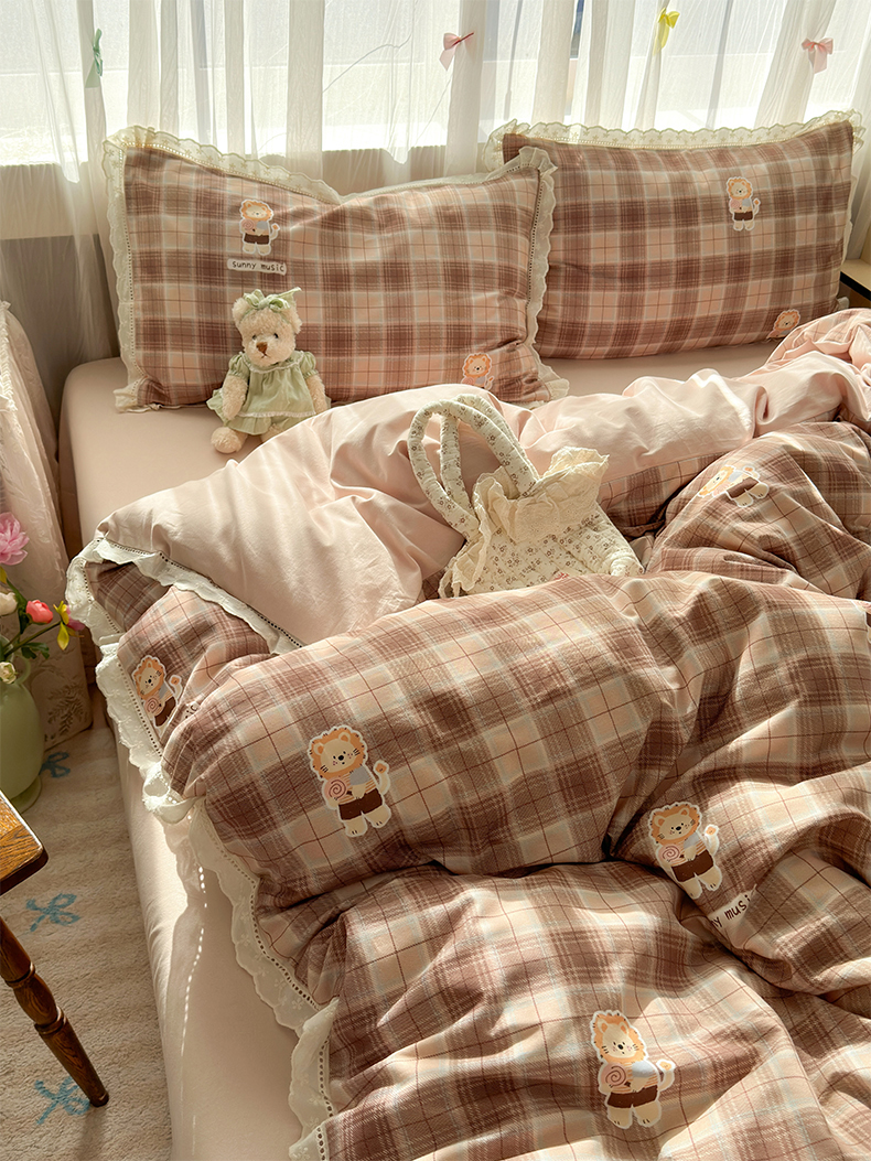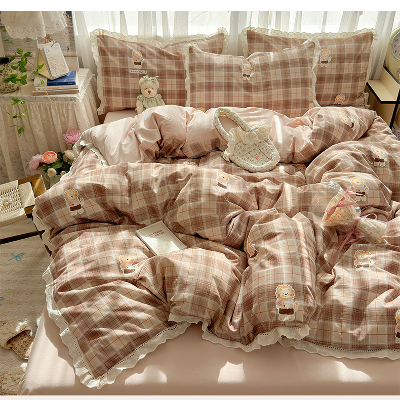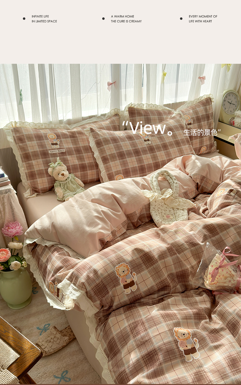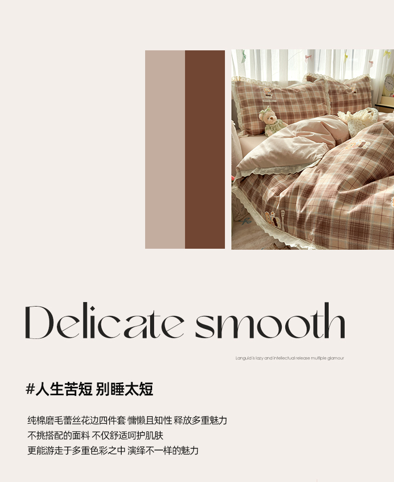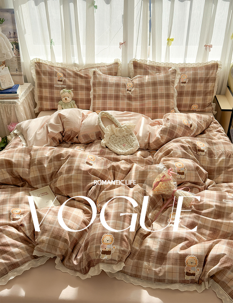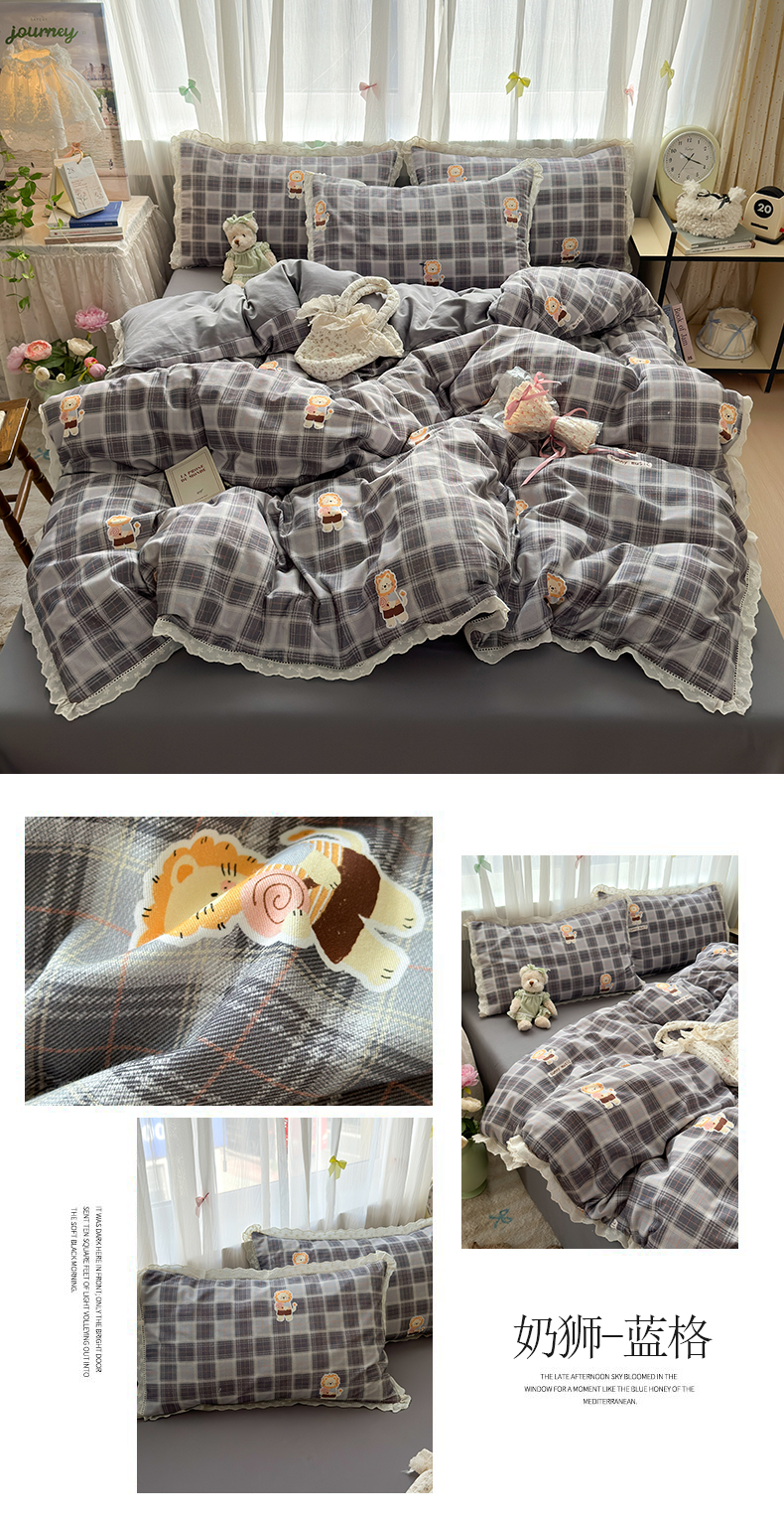 简宜家居(朝初家纺) 2025新款全棉磨毛蕾丝花边四件套 奶狮-咖格