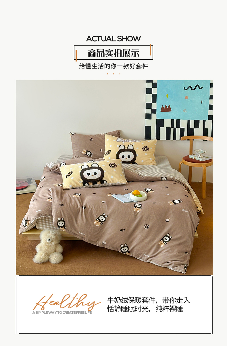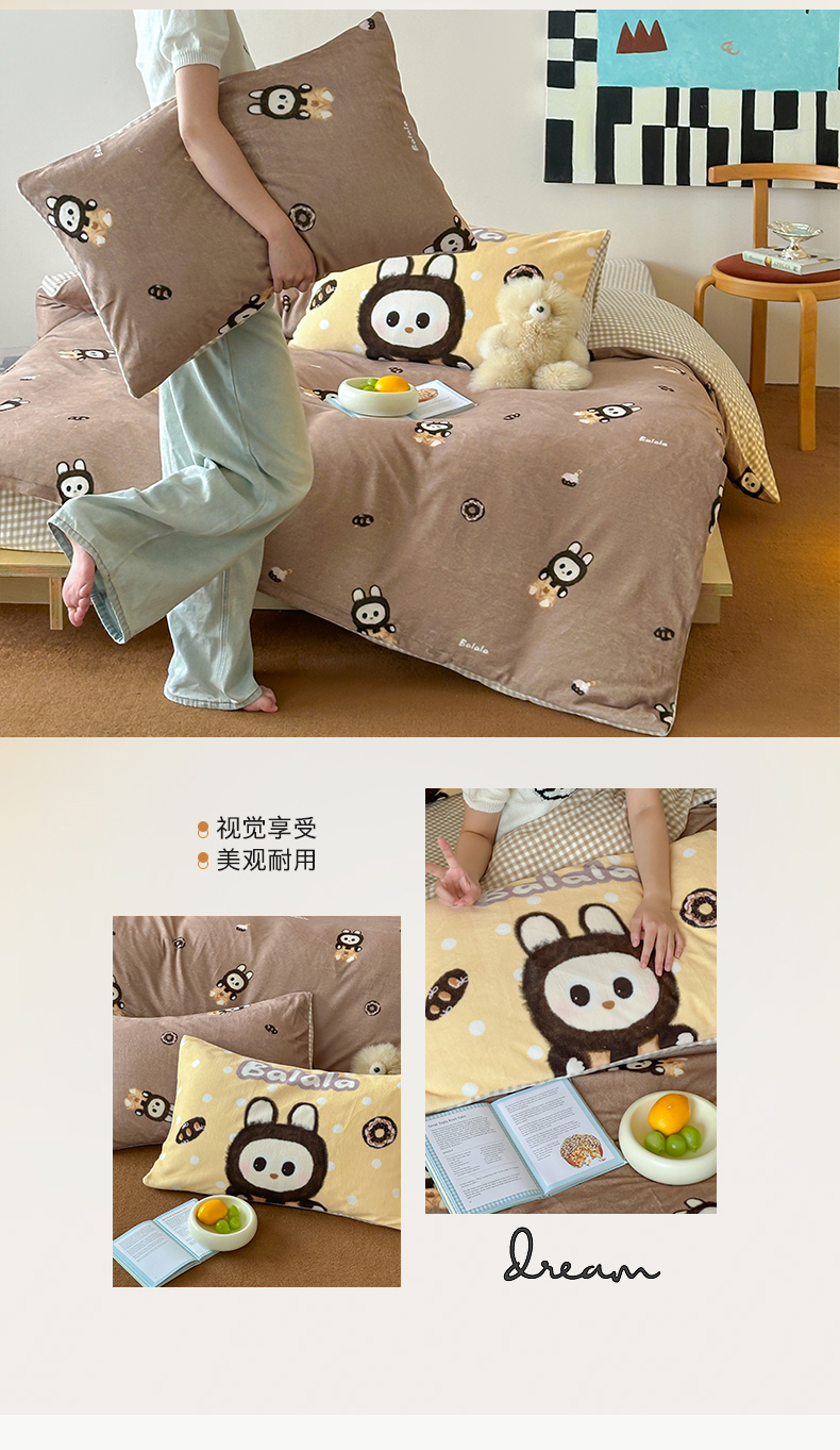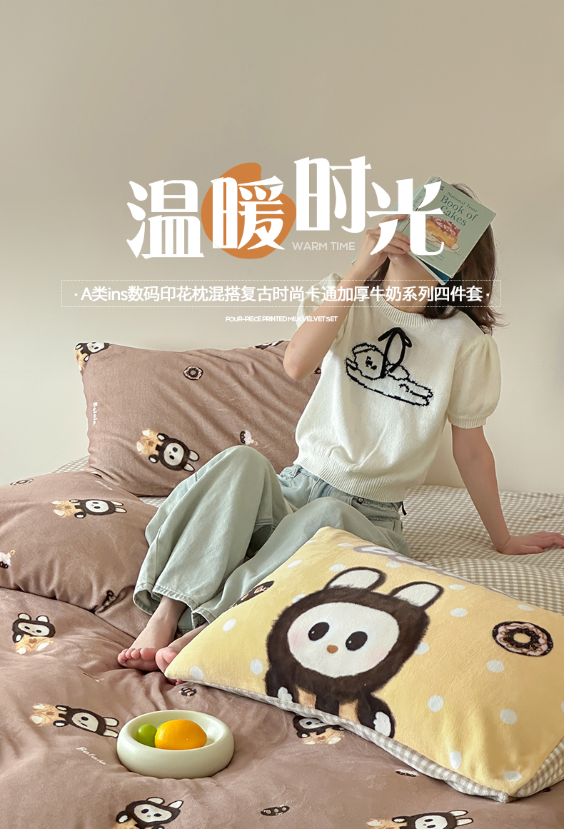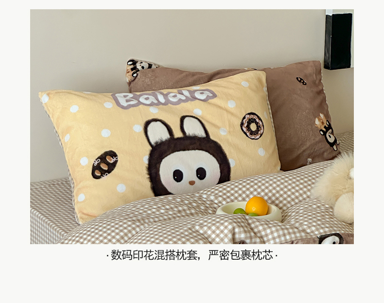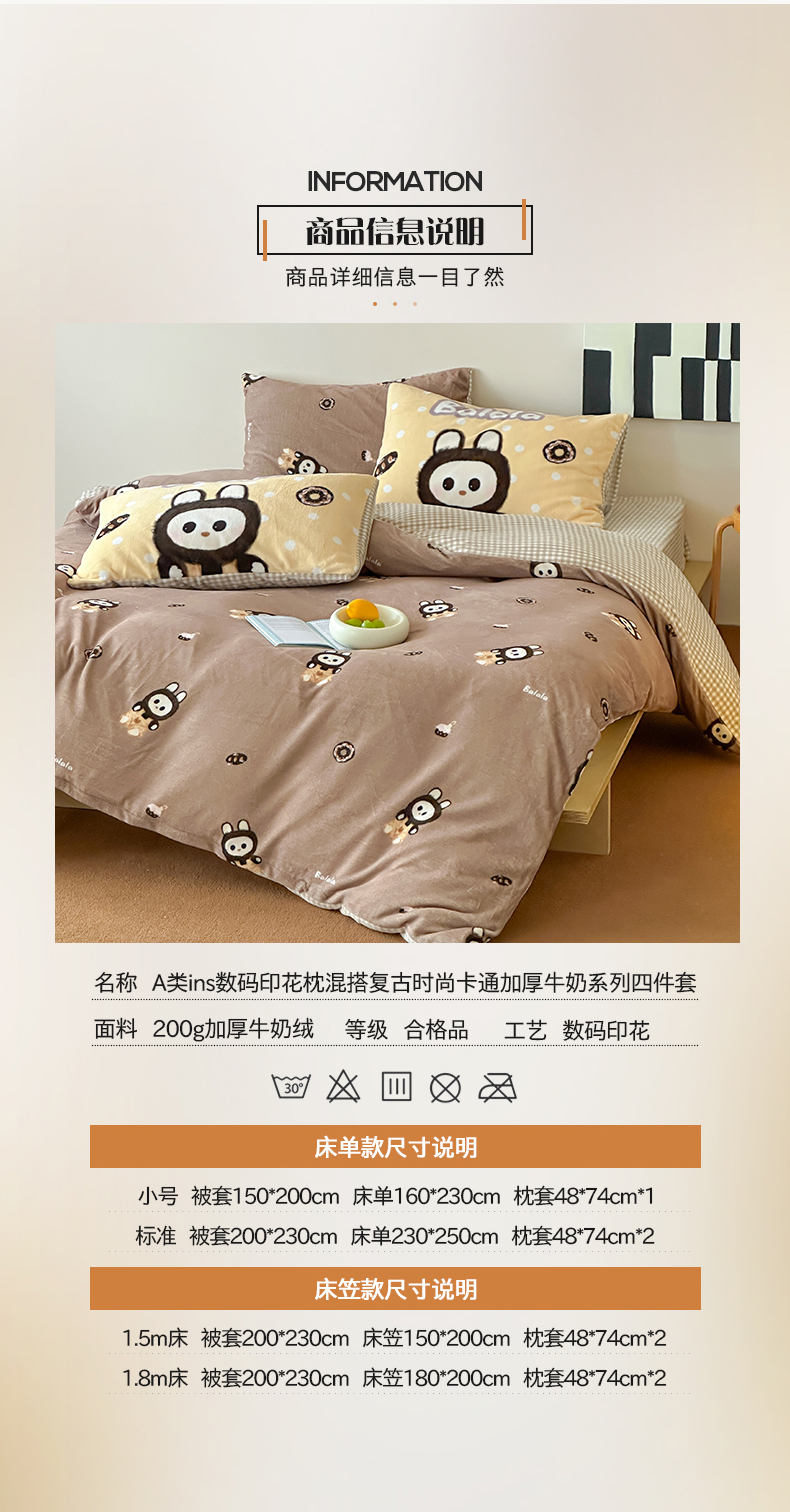 商品名称:桃子家居 2025新款A类ins数码印花枕混搭复古时尚卡通加厚牛奶系列四件套 绒-混搭拉蒙咖
