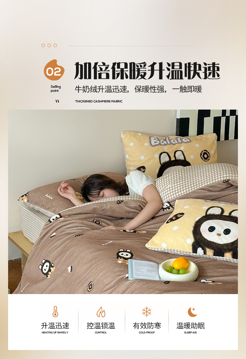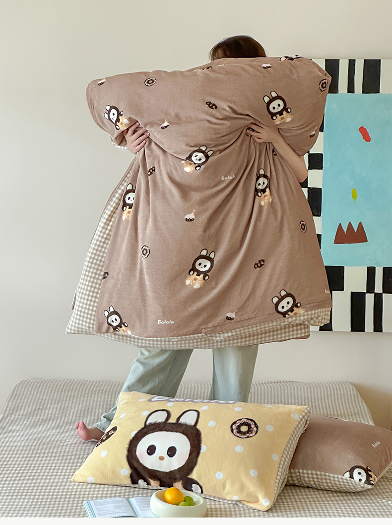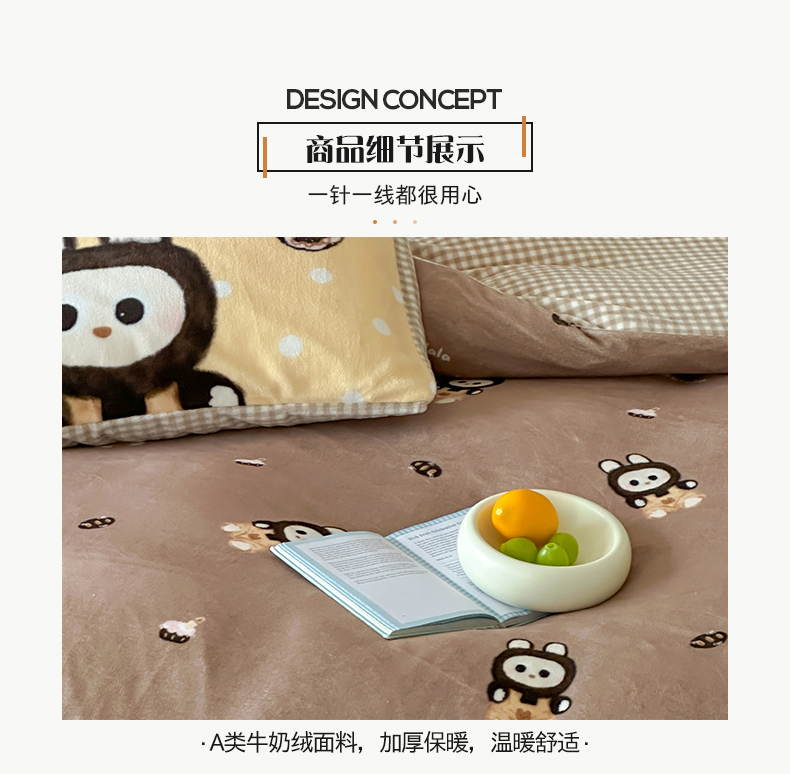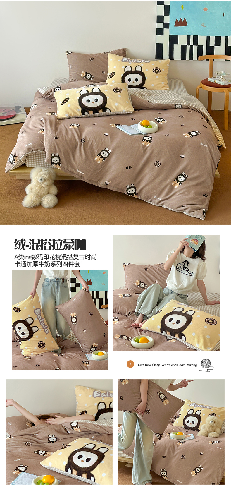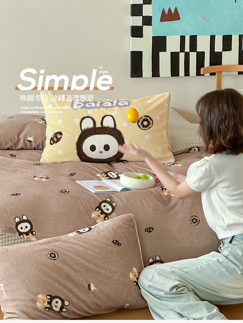 商品名称:桃子家居 2025新款A类ins数码印花枕混搭复古时尚卡通加厚牛奶系列四件套 绒-混搭拉蒙咖