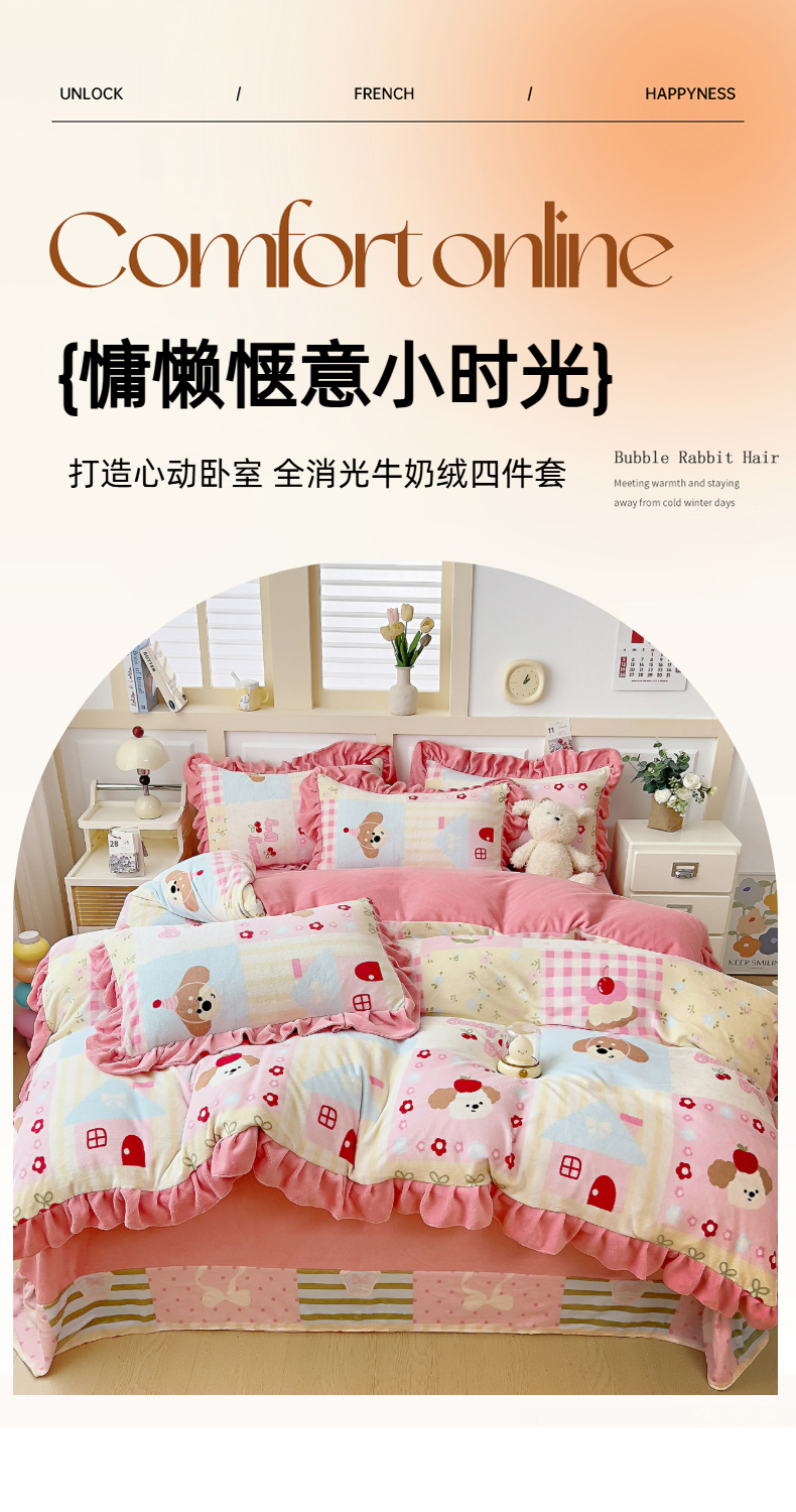 商品名称:找底底家纺 2025新款韩版加厚8斤牛奶绒花边四件套(日发50套优惠10元一套) 花兔絮语