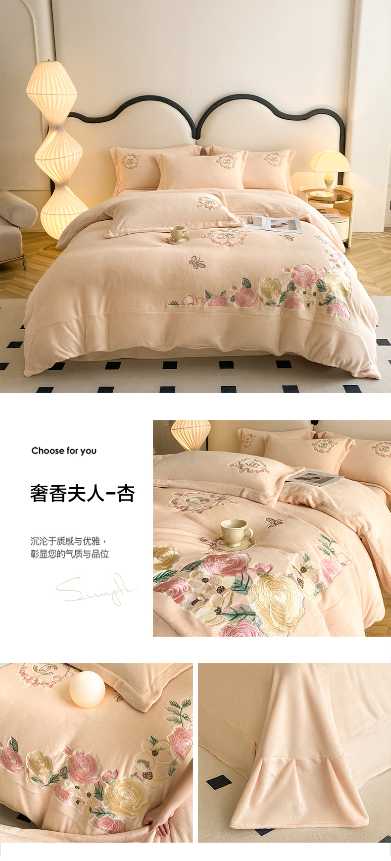 苹果星家纺 2025新款高克重纯色牛奶绒刺绣四件套-奢香夫人 奢香夫人-杏