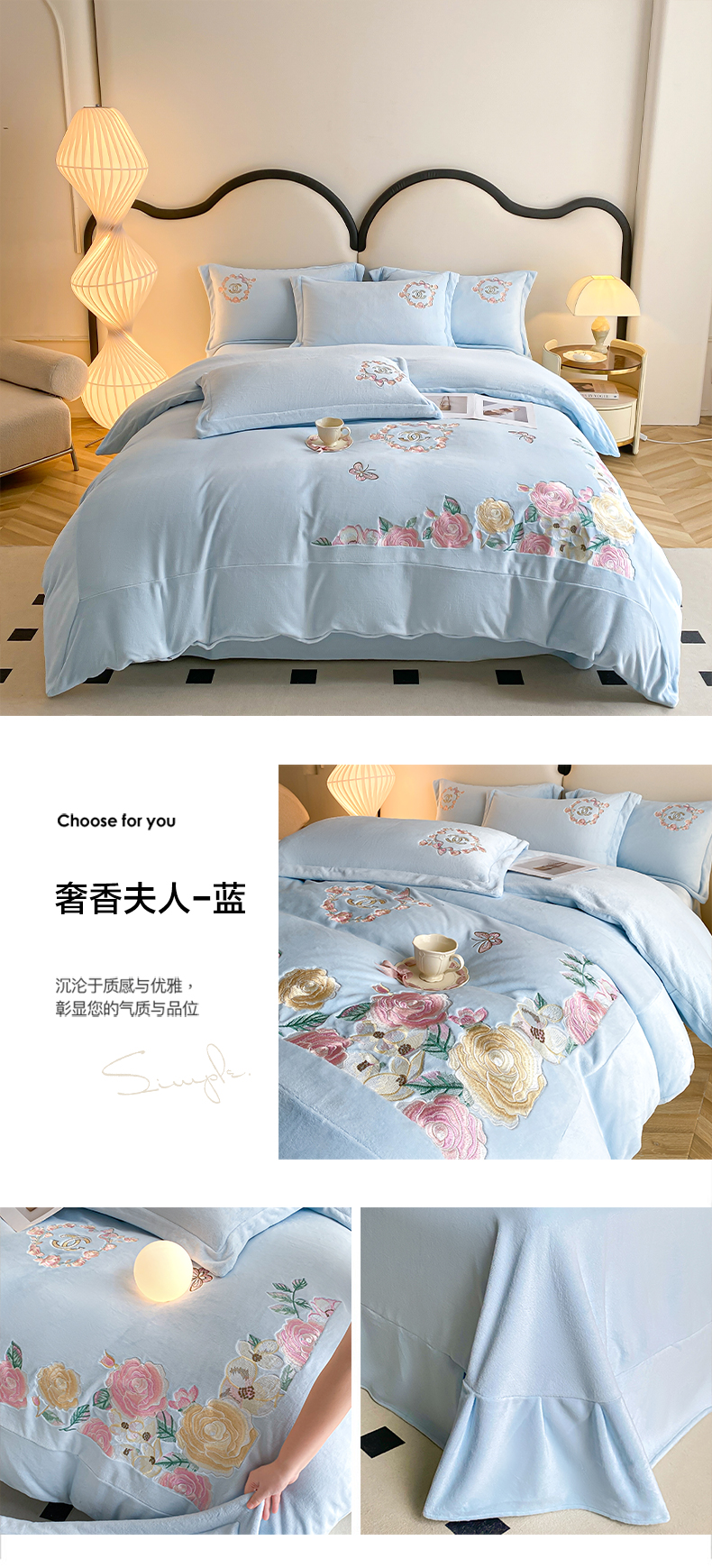 总 苹果星 2022新款牛奶绒婴儿丽丝臻棉水晶绒绣花四件套,孔雀蓝,高贵紫,湖蓝,酒红,豆沙,墨绿,深灰,墨蓝