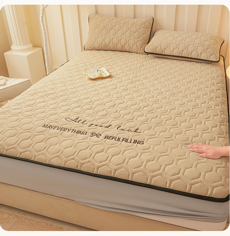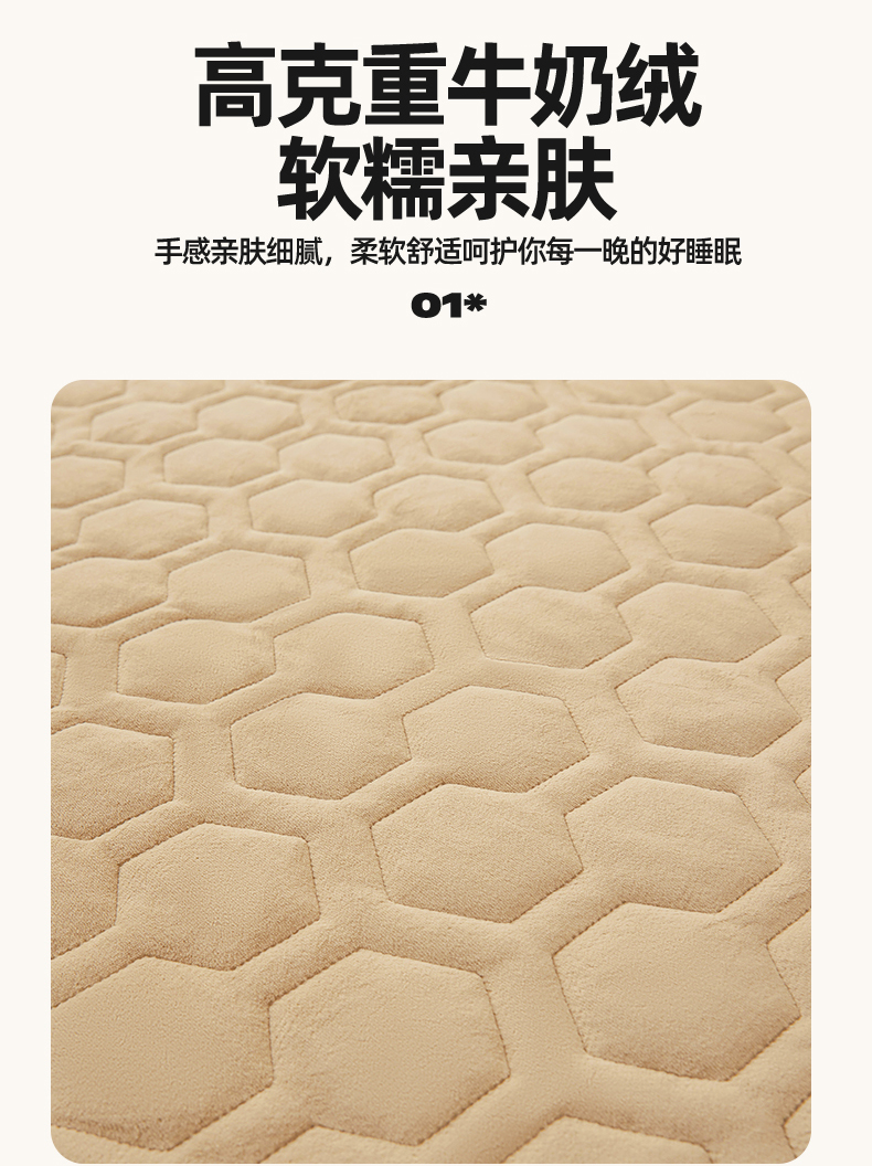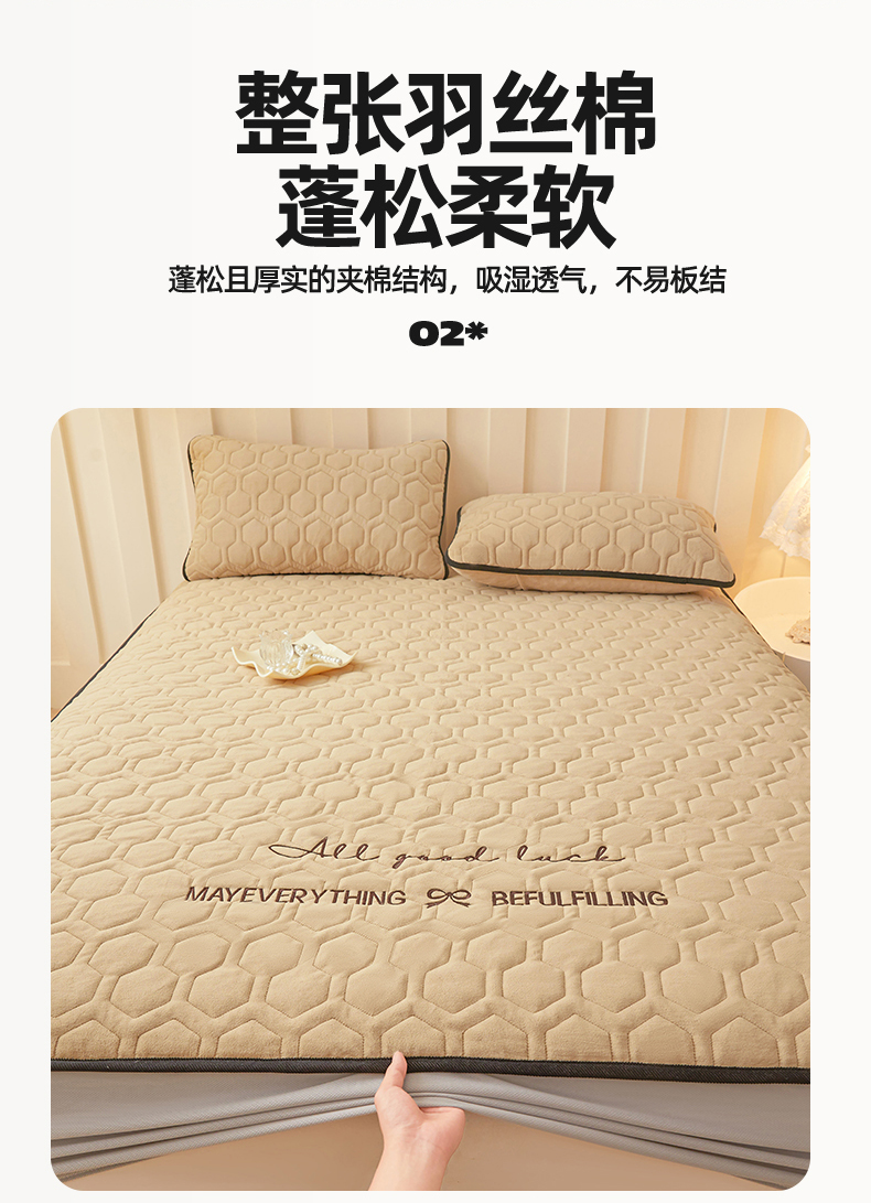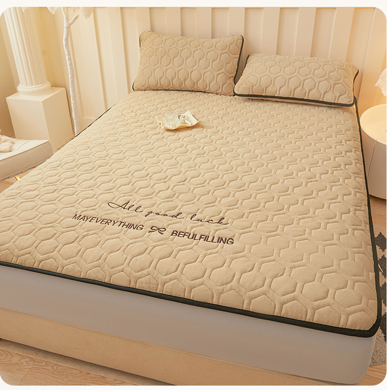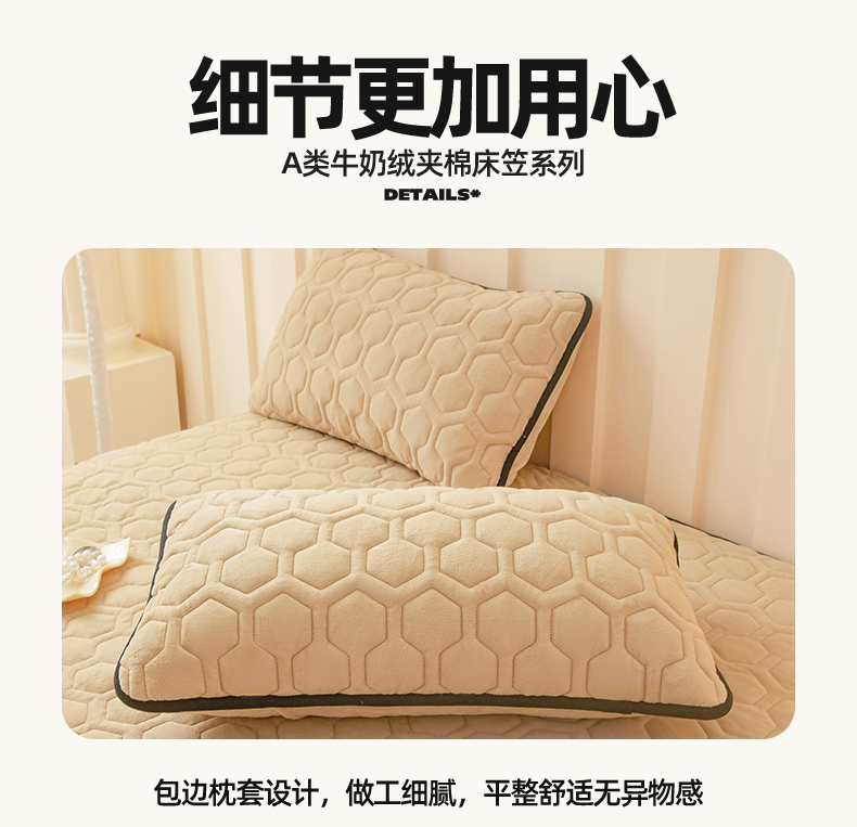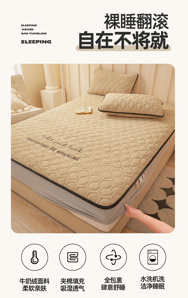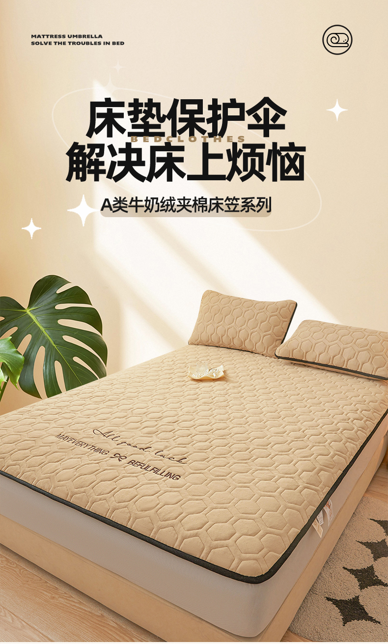 • 91家纺网 家纺一手货源 找家纺 恒爱家纺 2025新款牛奶绒绗绣绣花床笠 驼色