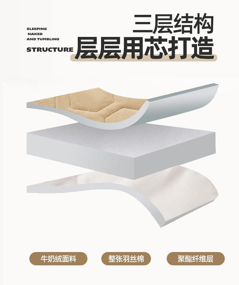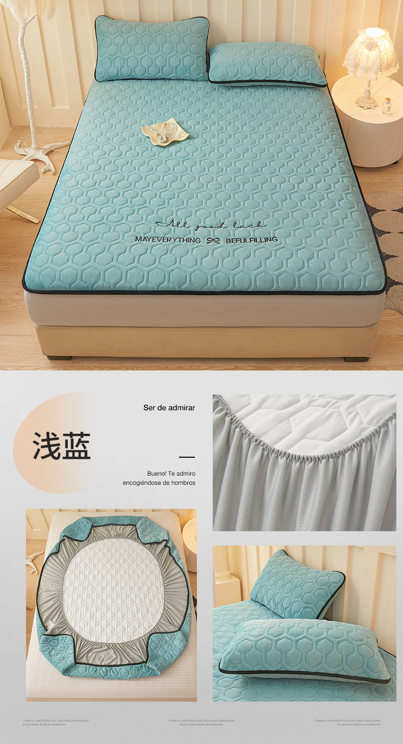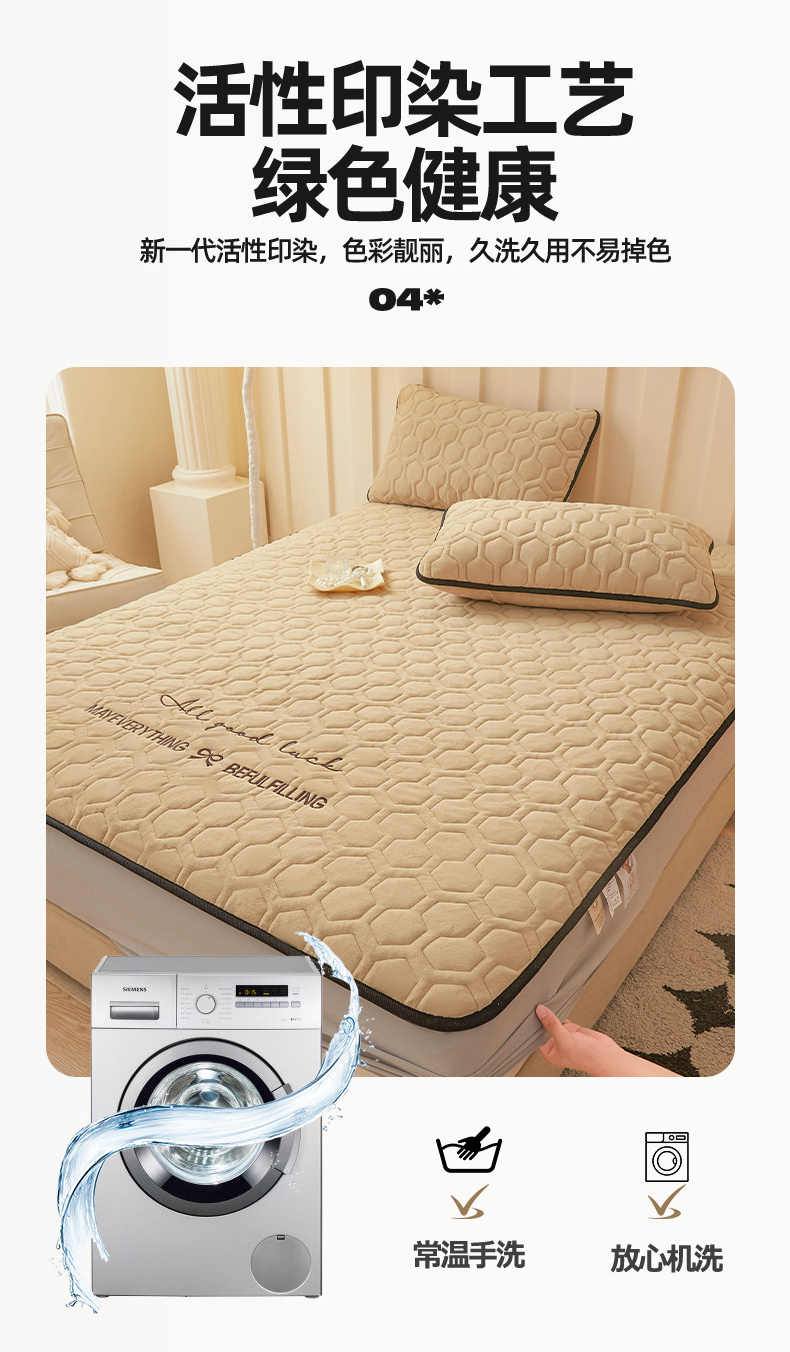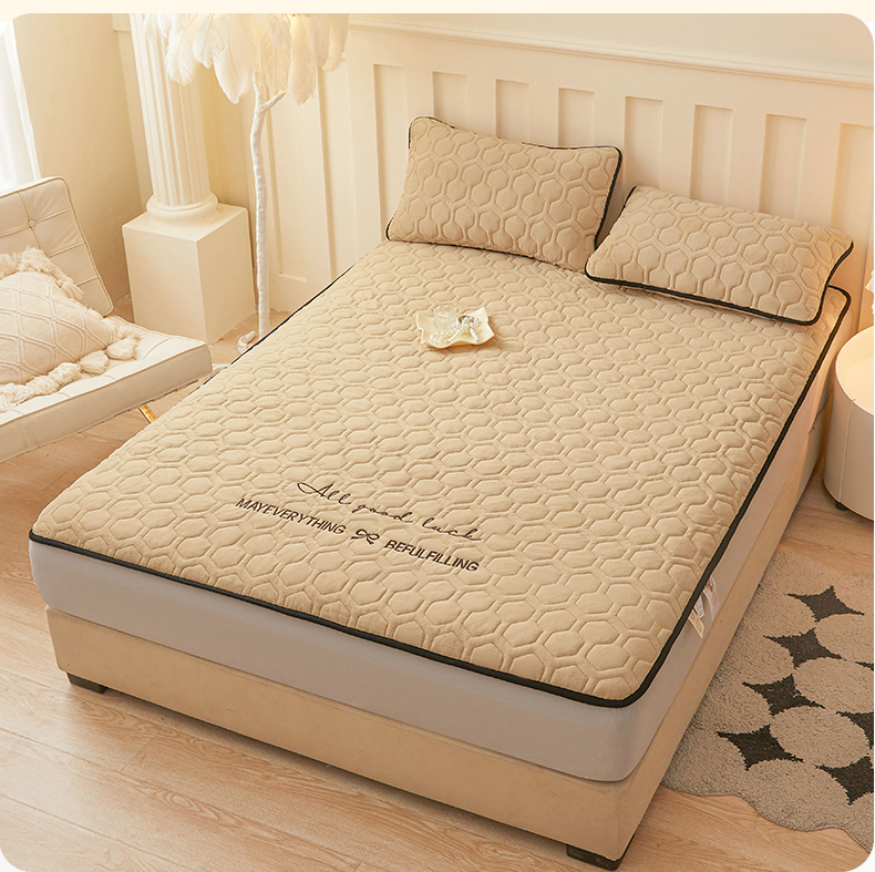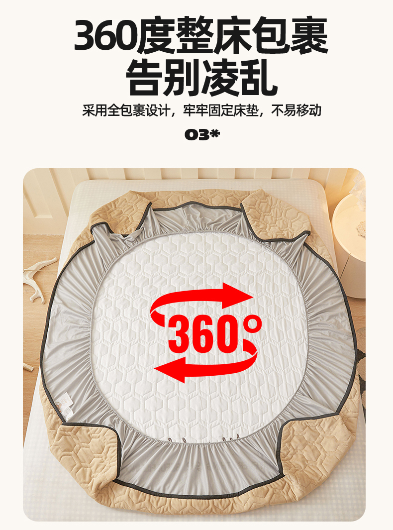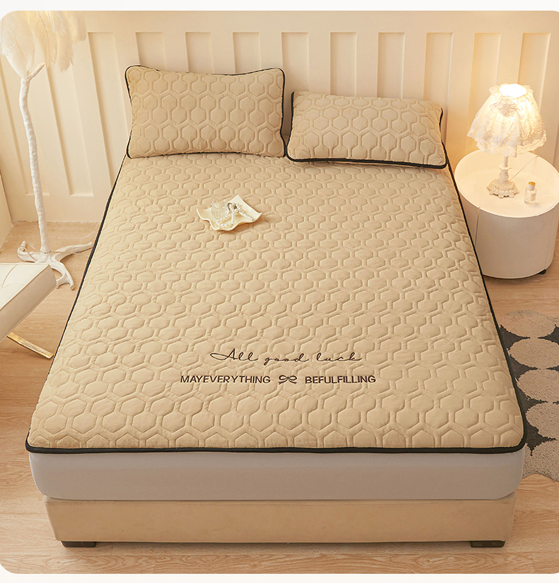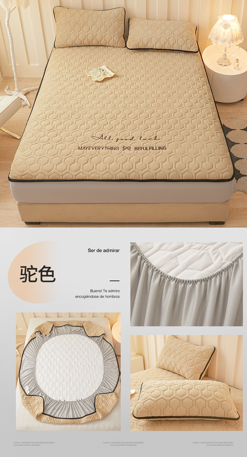 • 91家纺网 家纺一手货源 找家纺 恒爱家纺 2025新款牛奶绒绗绣绣花床笠 驼色