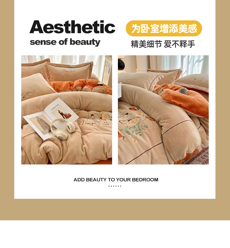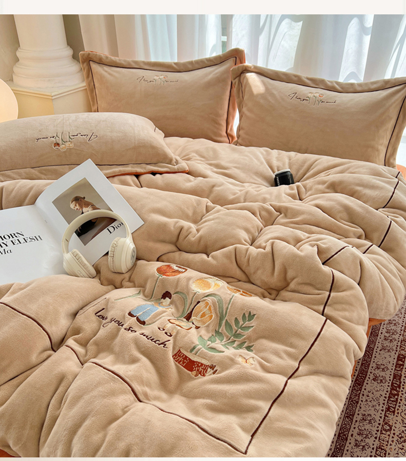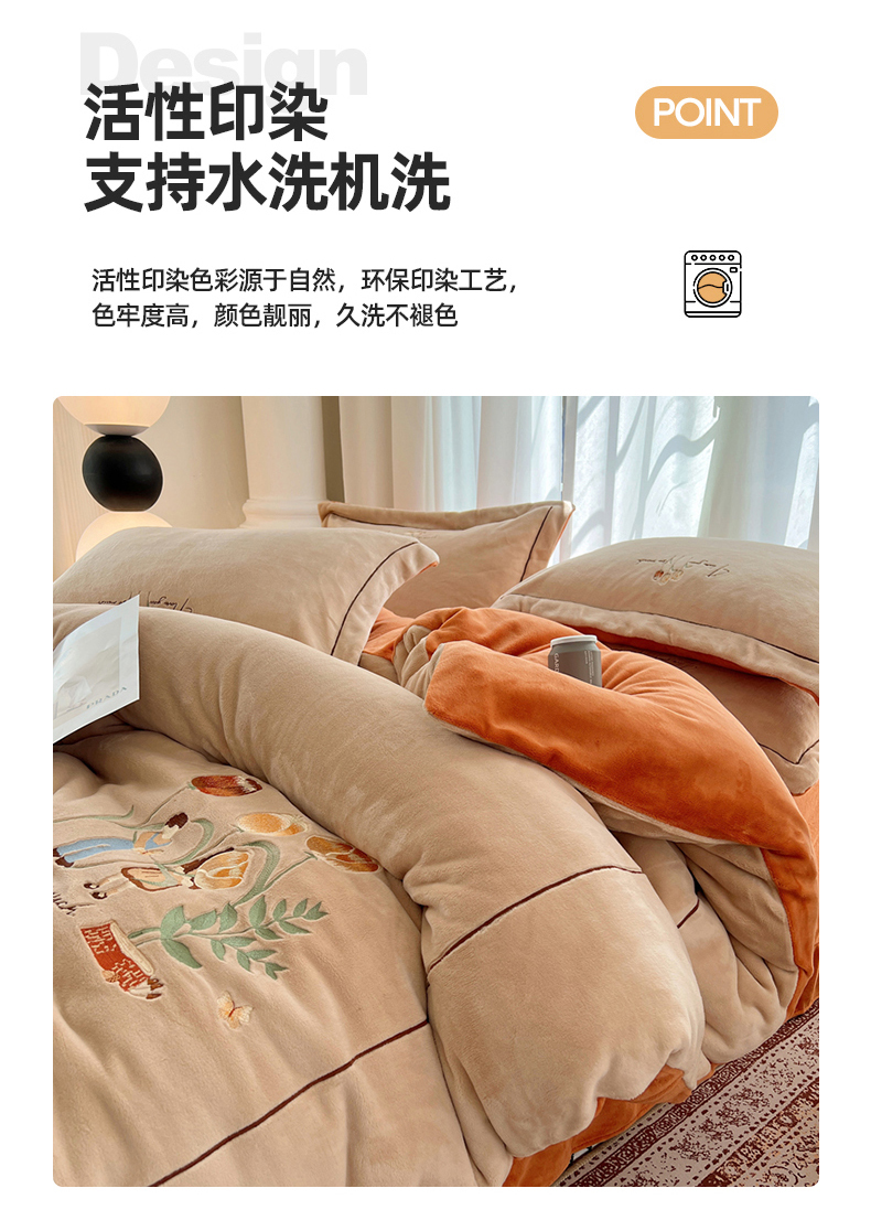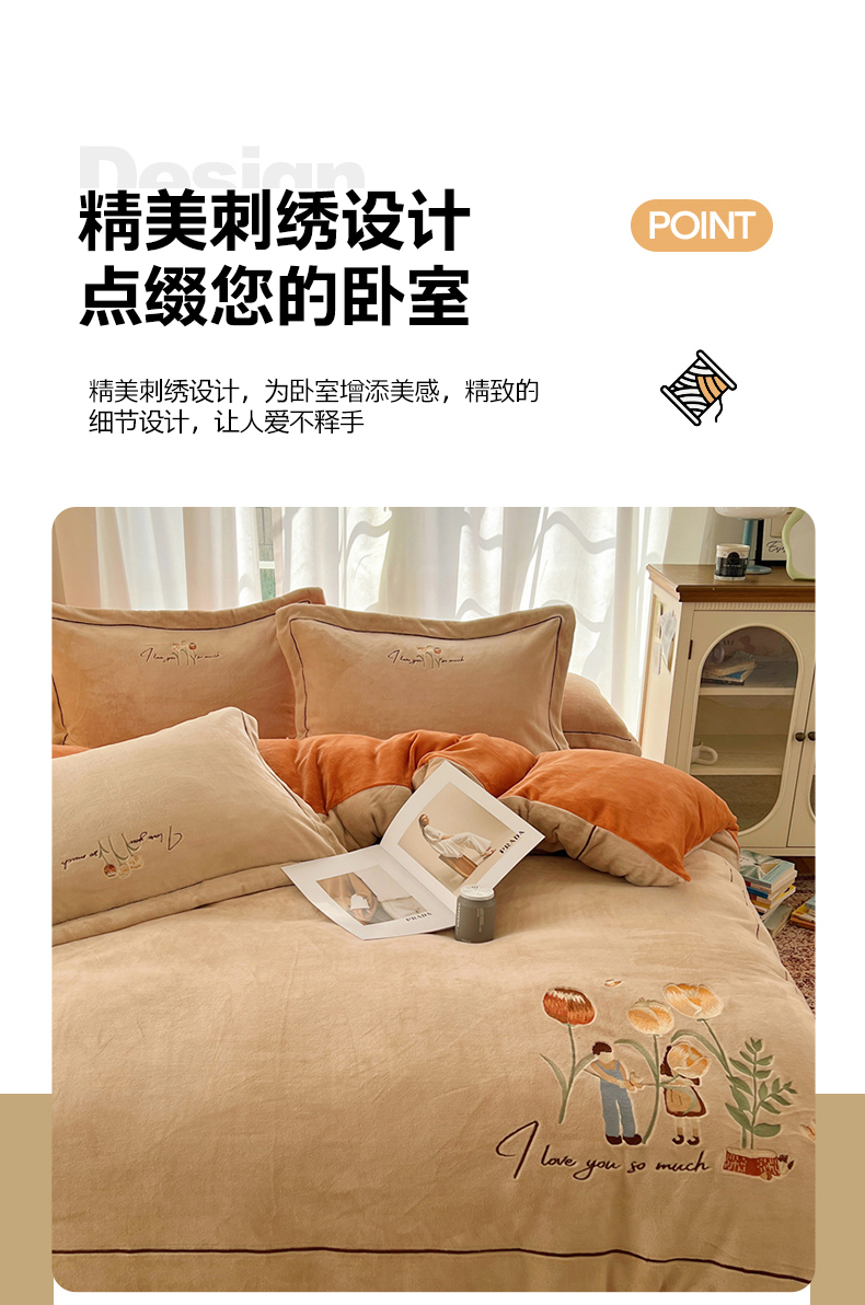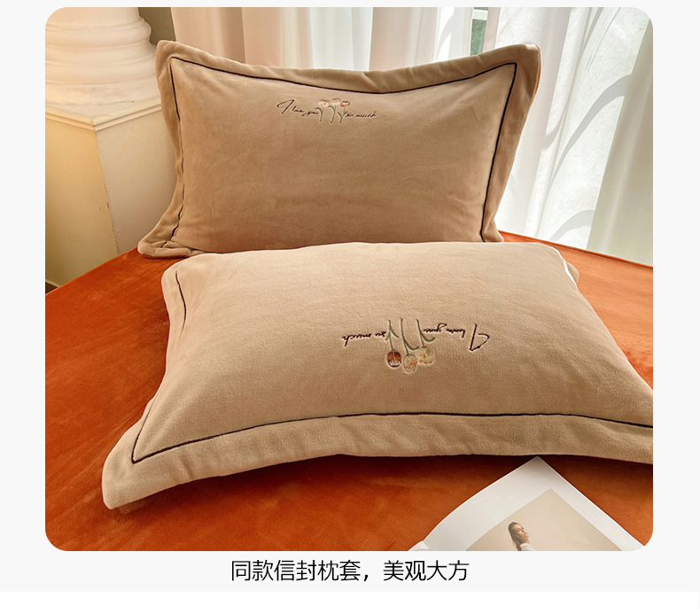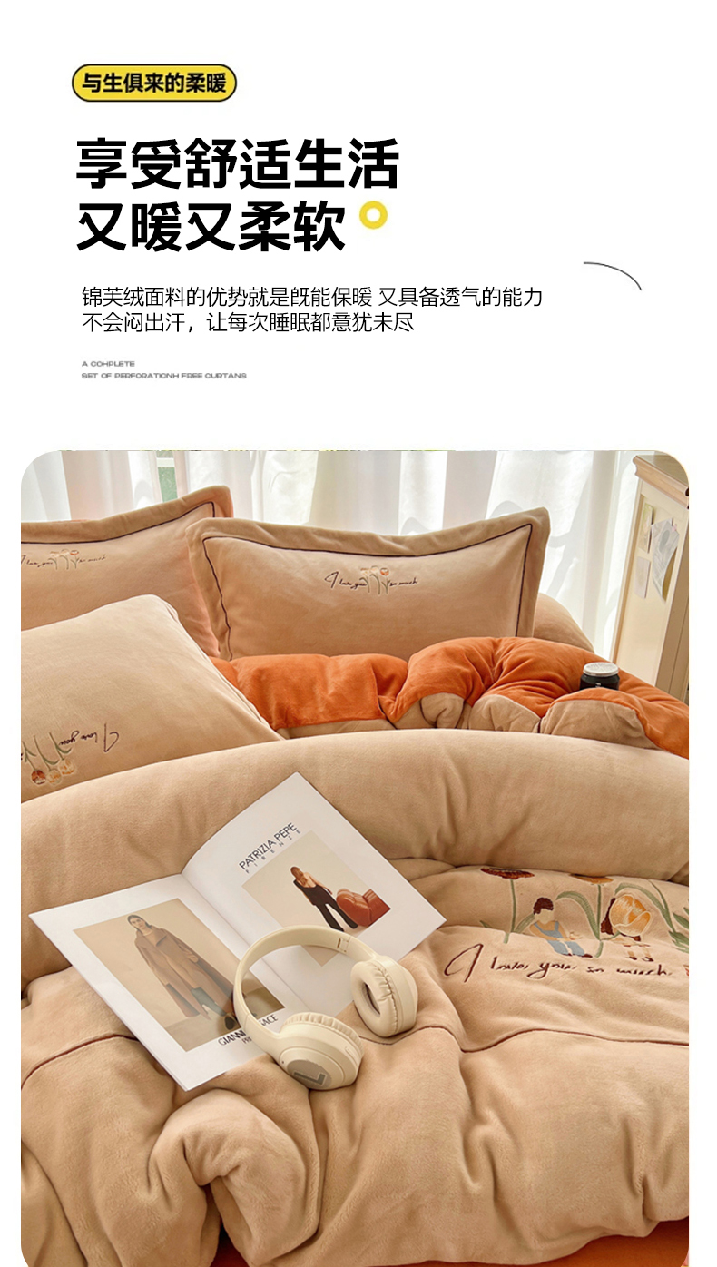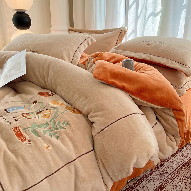 丽涵家纺 2025新款全工艺消光锦芙绒绣花四件套 杏橘色