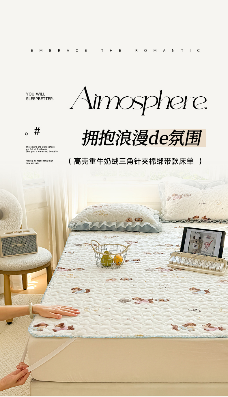 (总)禧缘家纺(原梦想家) 2025新款牛奶绒三角针绑带款夹棉床笠床单,布布乐园-绑带款,步步生花-绑带款,杏花微雨-绑带款,雾都茶花-绑带款,摩卡小镇-绑带款,猫咪心事-绑带款,浪漫花开-绑带款,蓝铃风语-绑带款,狗狗岛屿-绑带款,落日云舒-绑带款