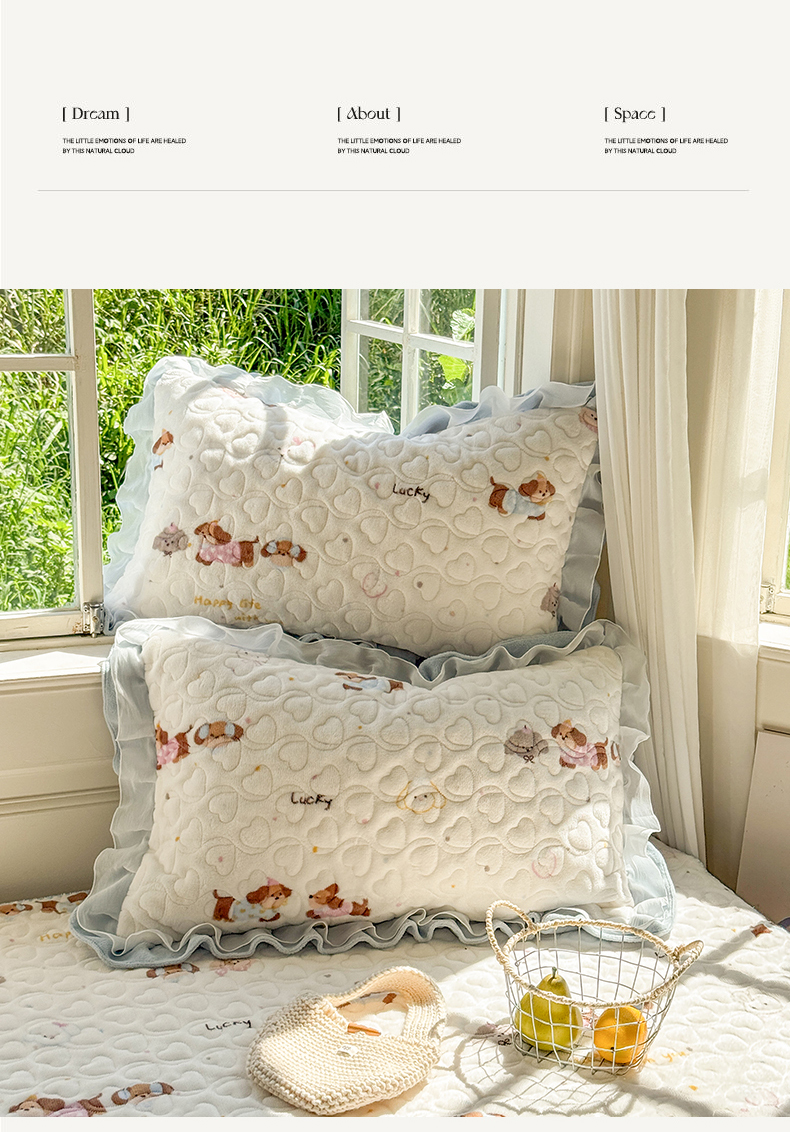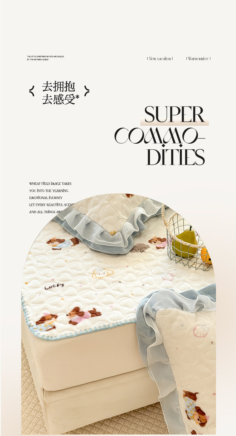 (总)禧缘家纺(原梦想家) 2025新款夹棉双层花边牛奶绒床笠三件套系列,布布乐园,步步生花,杏花微雨,雾都茶花,摩卡小镇,猫咪心事,浪漫花开,蓝铃风语,狗狗岛屿,落日云舒