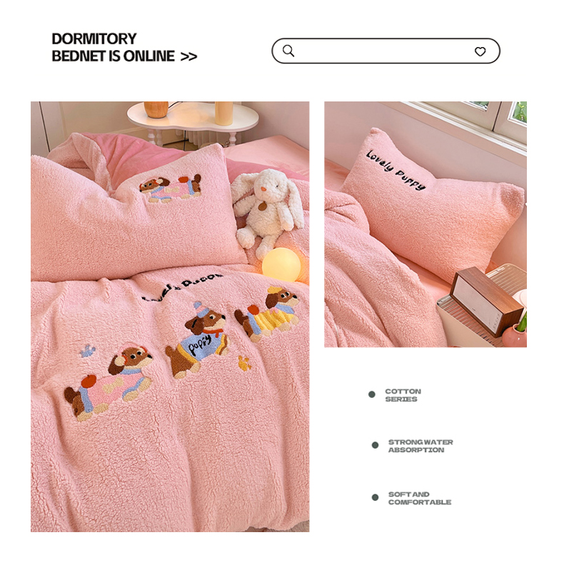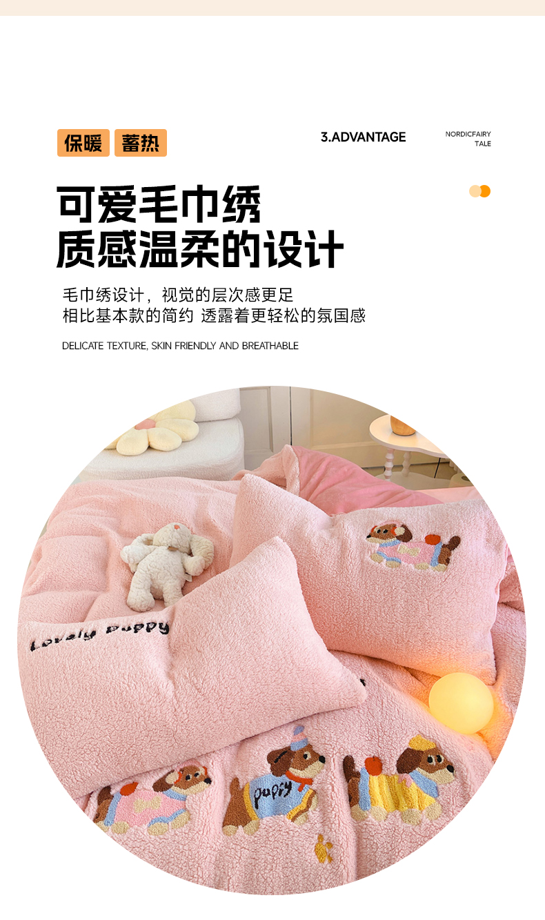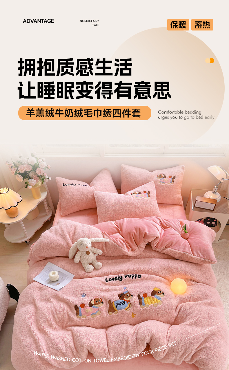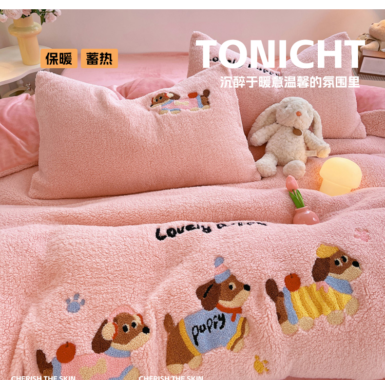 商品名称:牵依 2025新款羊羔绒牛奶绒毛巾绣四件套 腊肠狗