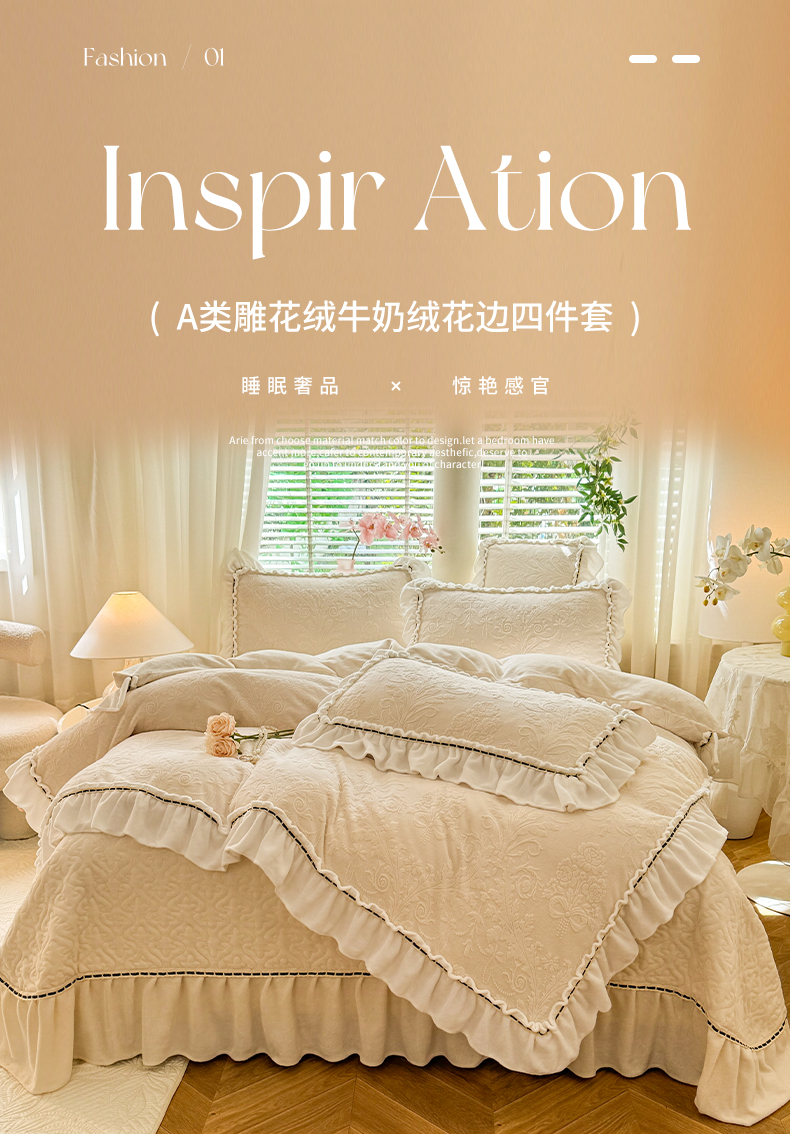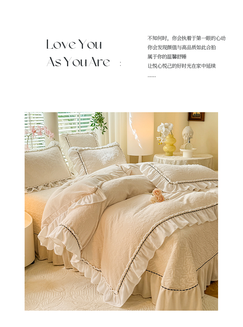 (总)花香四季家纺 2025新款雕花绒牛奶绒夹棉床盖款四件套系列-浪漫情缘,浪漫情缘-粉色,浪漫情缘-米白