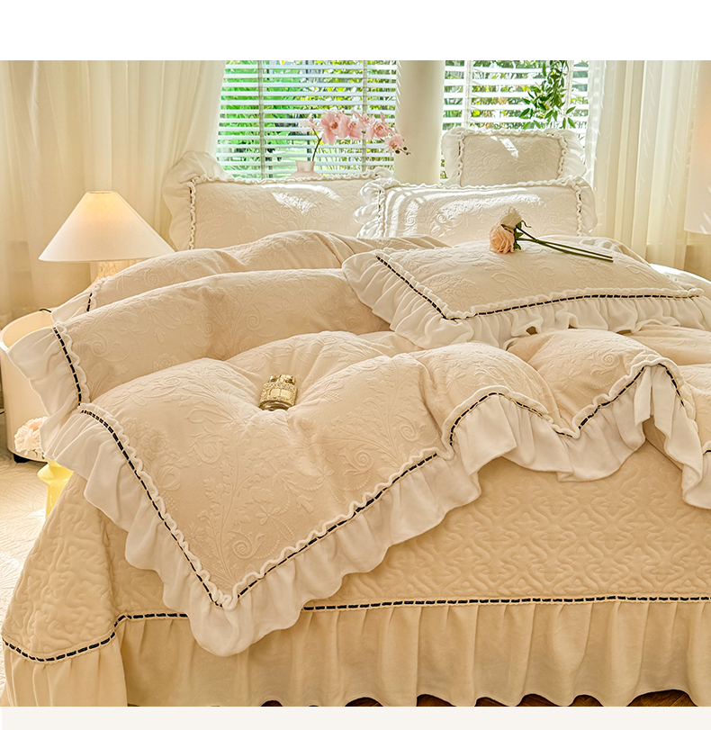 (总)花香四季家纺 2025新款夹棉绗缝床裙单件三件套法式四件套套件蕾丝公主风,灰色,绿色,米色,玉色,紫色