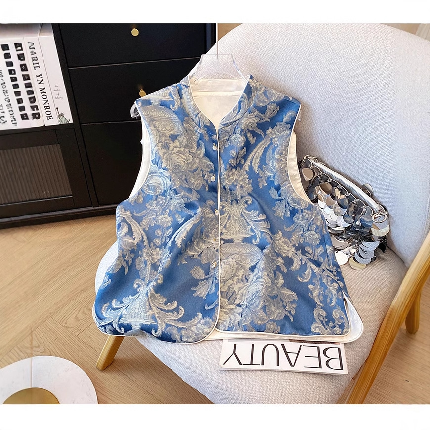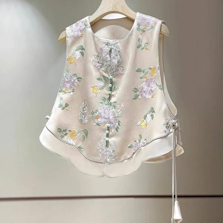 商品名称:洛兰沙家居馆【只代发】【只代发】 2025新款复古织锦缎细纱棉麻拼接马甲背心刺绣中式盘扣上衣 28