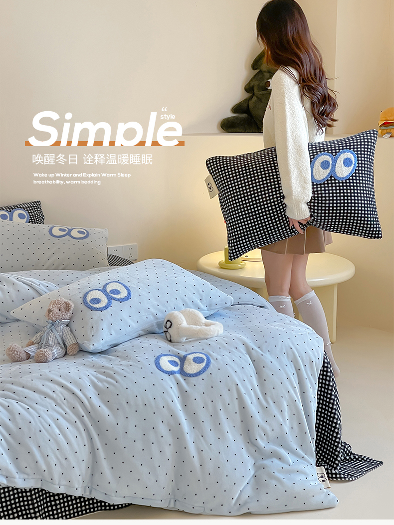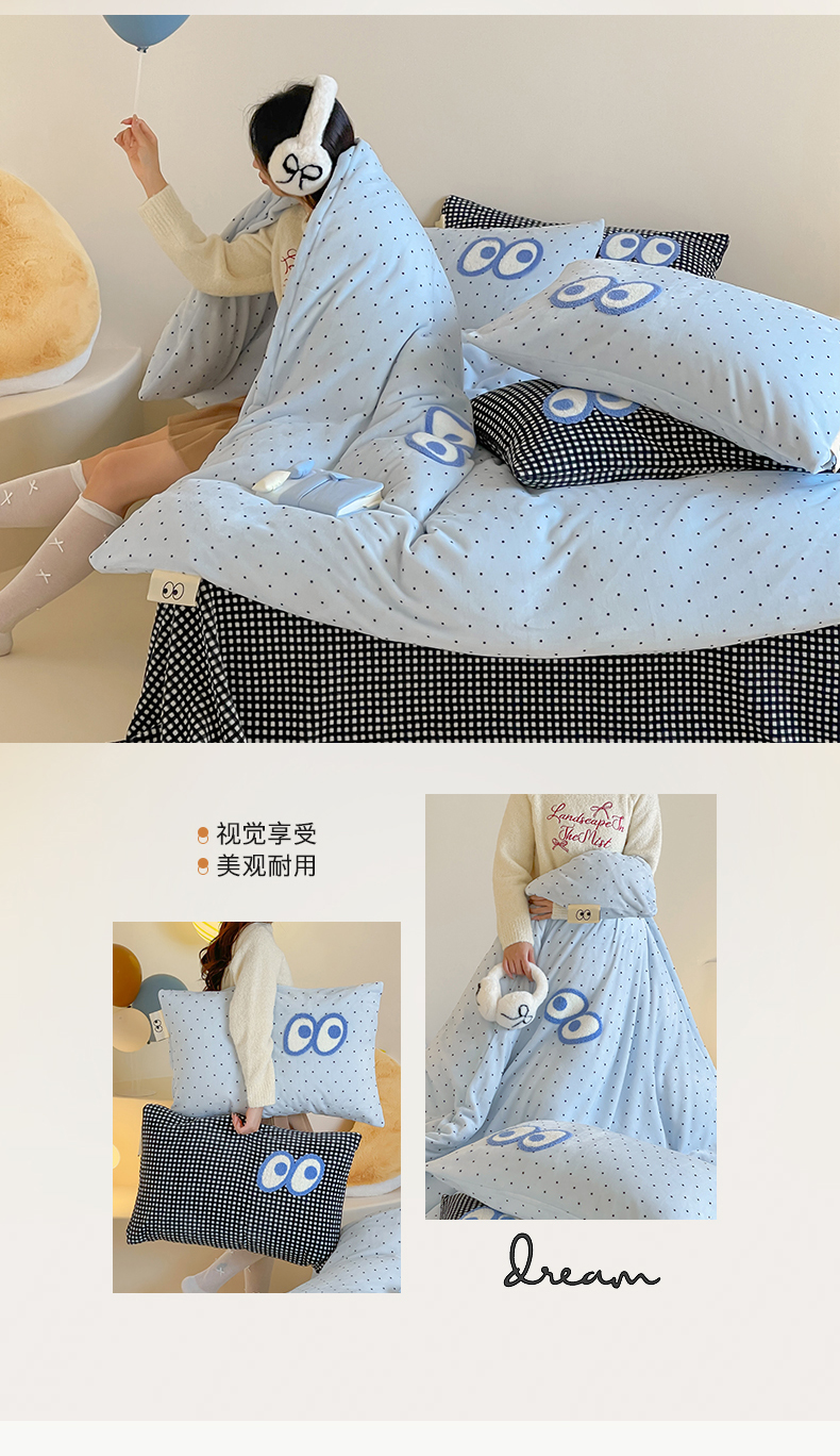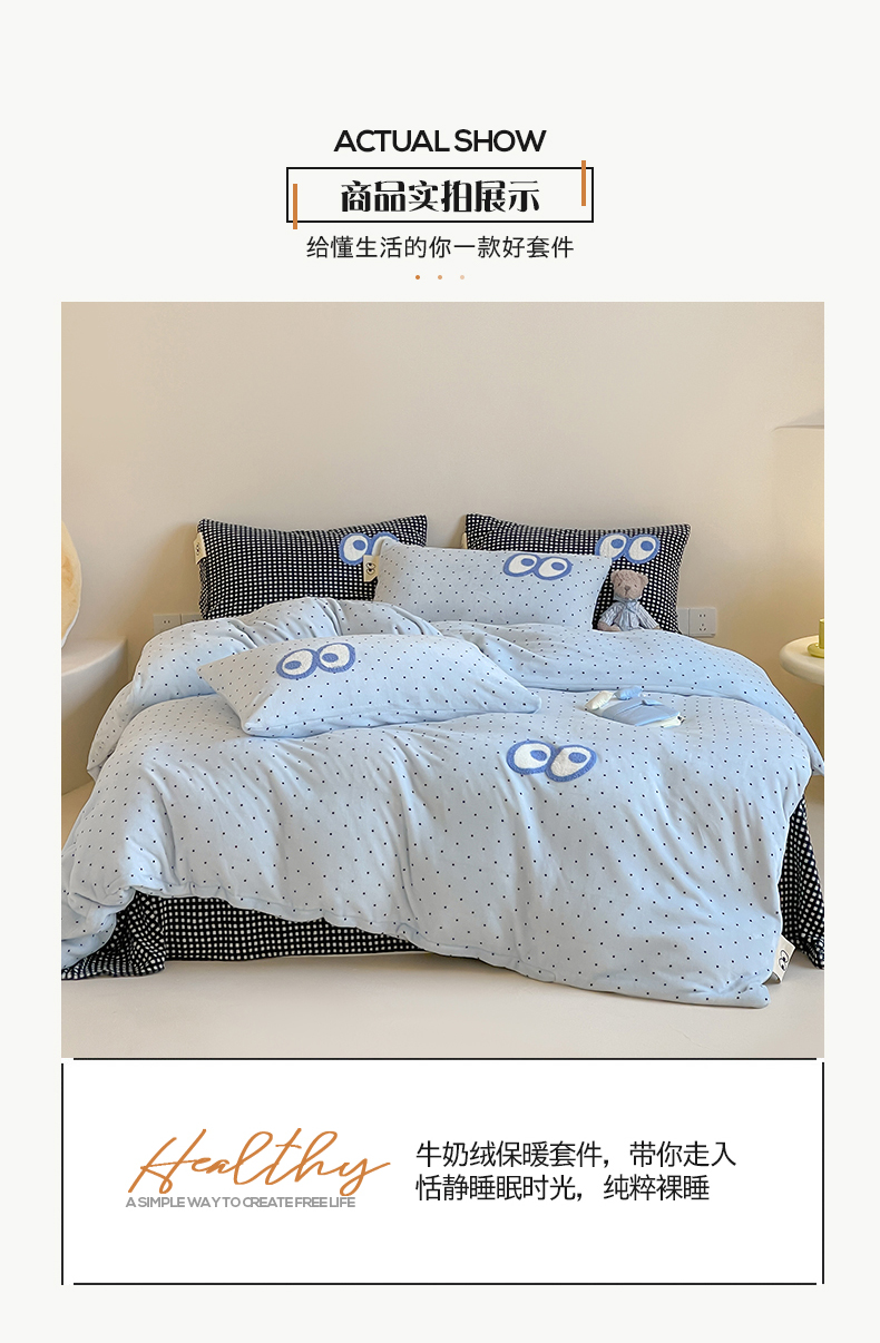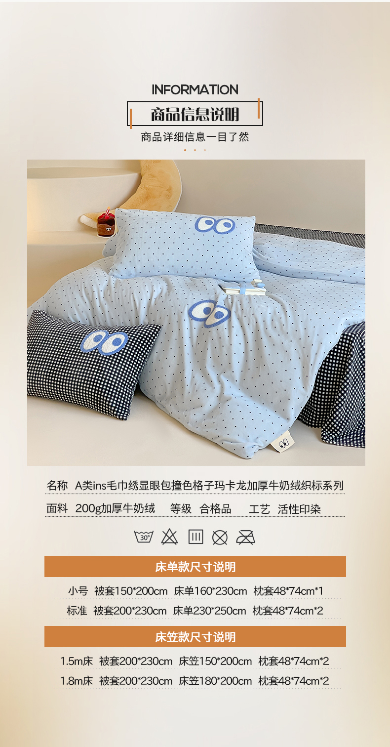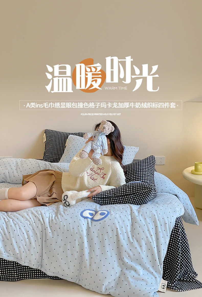 当前位置: 91家纺网 > 商品网购 > 床品套件 > 四件套 > 牛奶绒四件套 > 桃子家居 2025新款A类ins毛巾绣显眼包撞色格子玛卡龙加厚牛奶绒织标四件套时尚模特 绒-显眼包蓝点黑格
