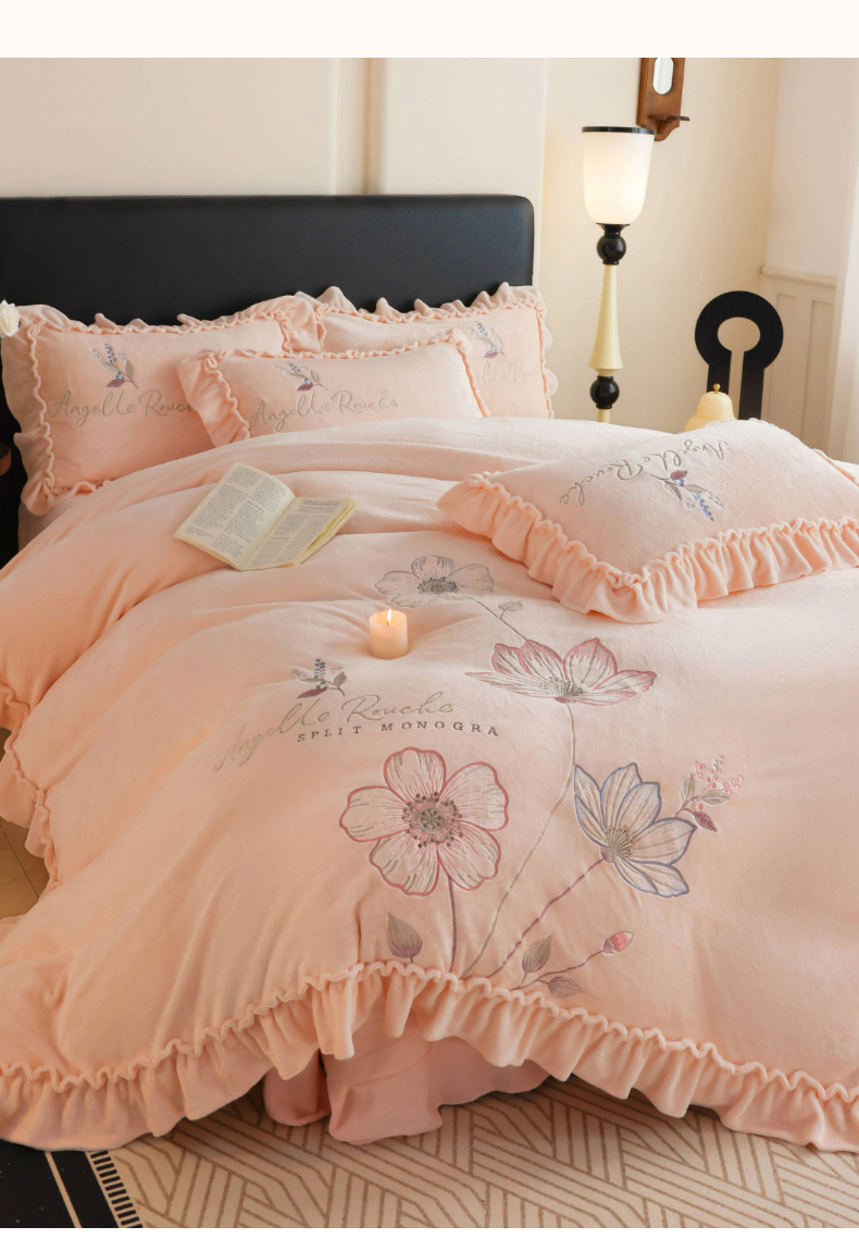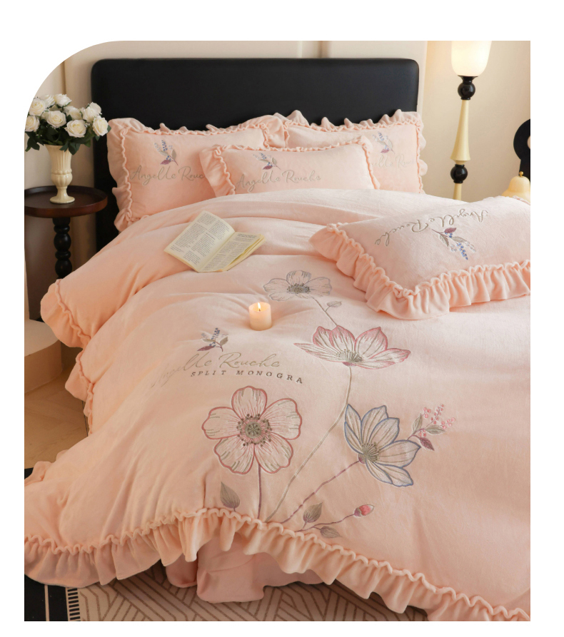 孟鑫家纺 2025新款220克高克重韩版立体花边牛奶法式绣花四件套床单床盖款被套-浪漫花园系列 浪漫花园-香槟粉