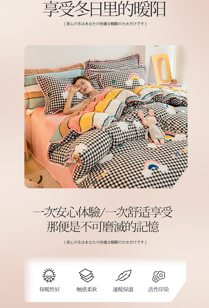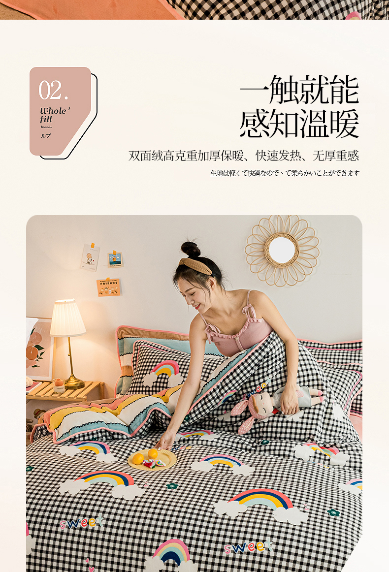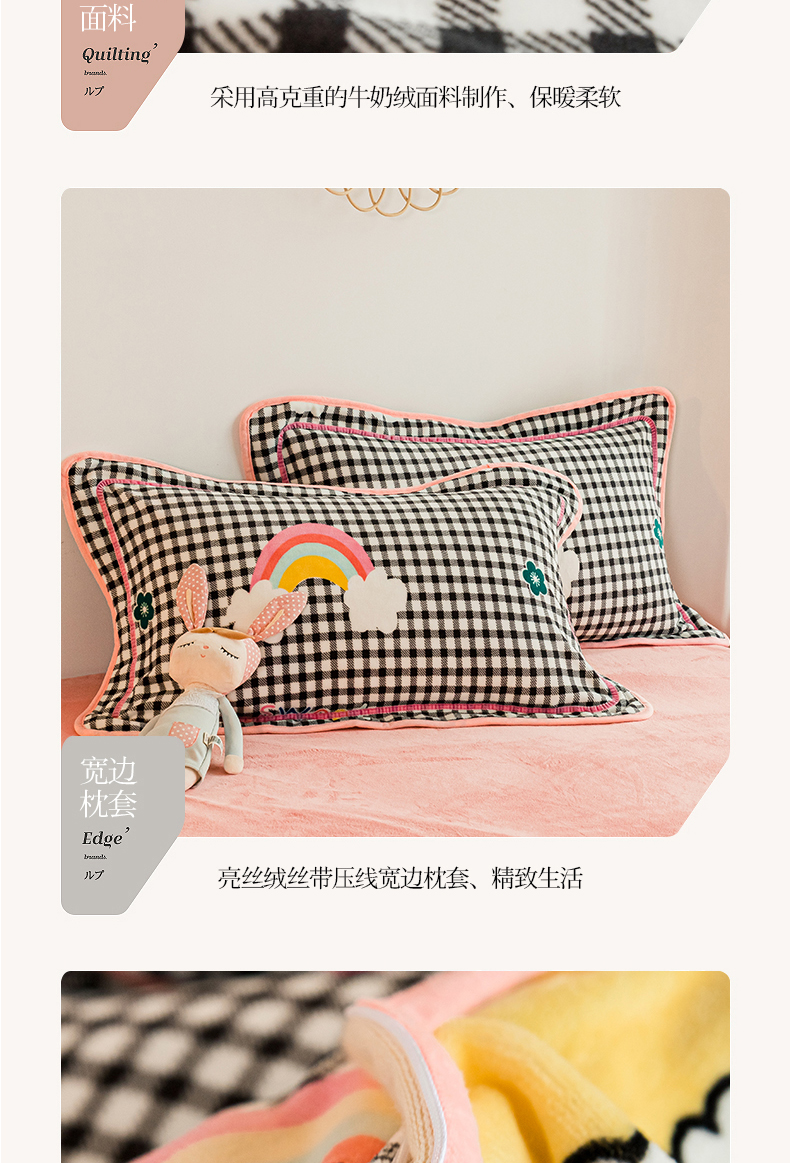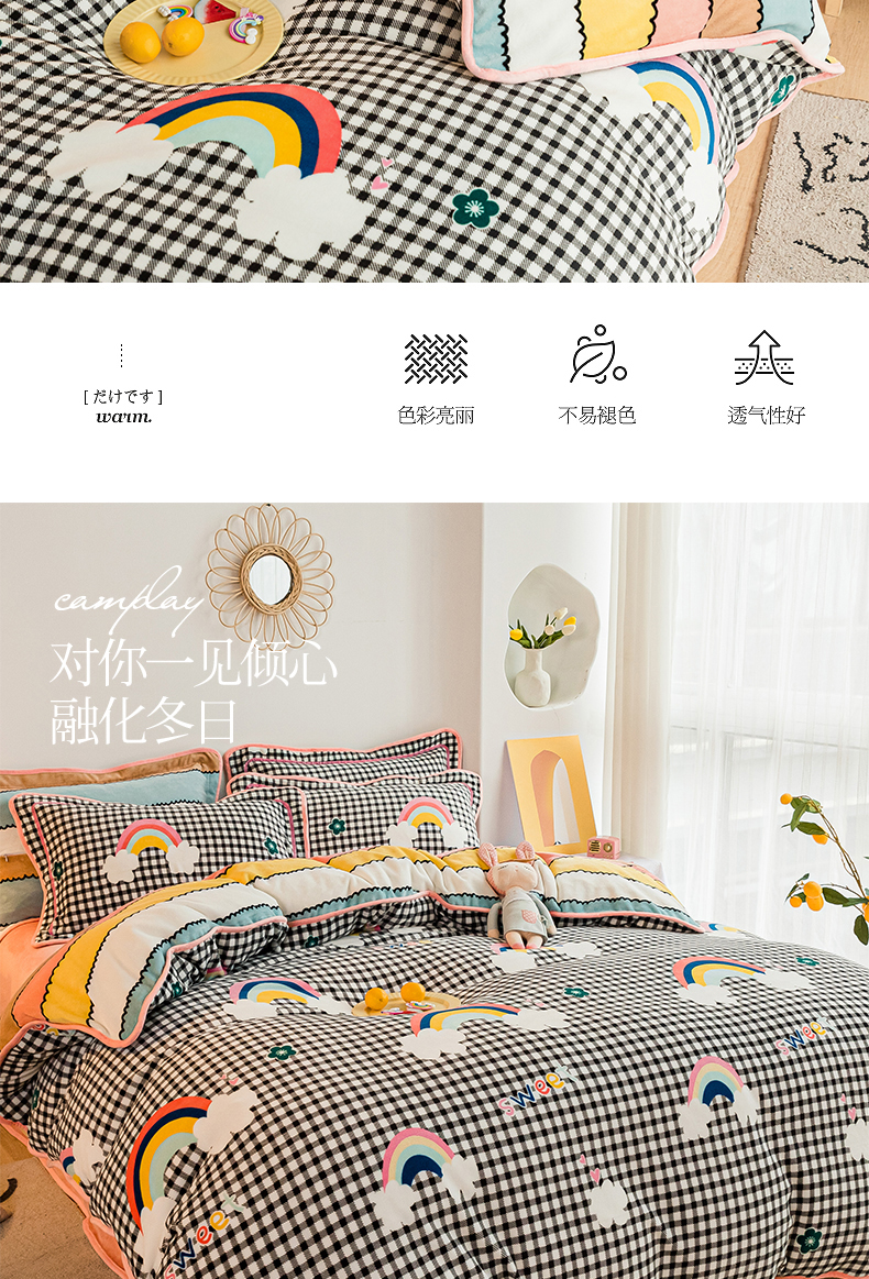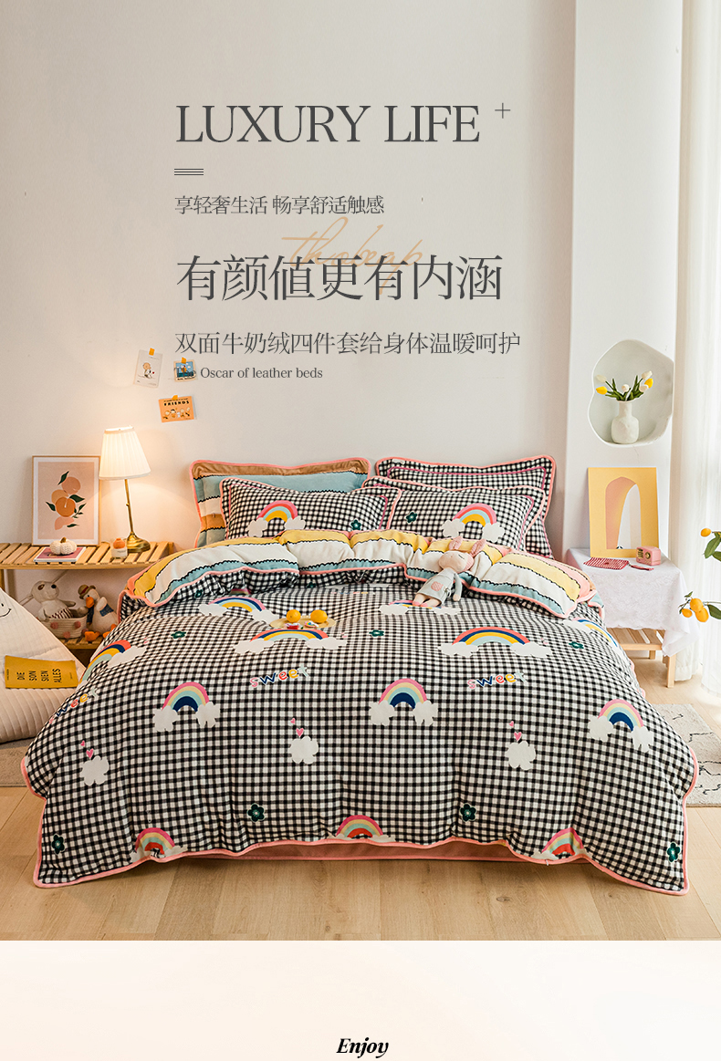 商品名称:琪格格纺织 2025新款A牛奶绒B兔兔绒保暖印花四件套 牛奶绒格子彩虹