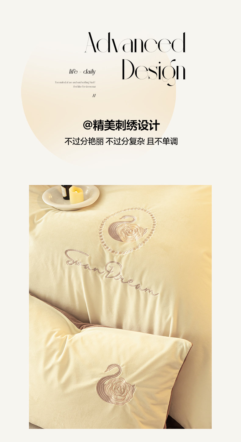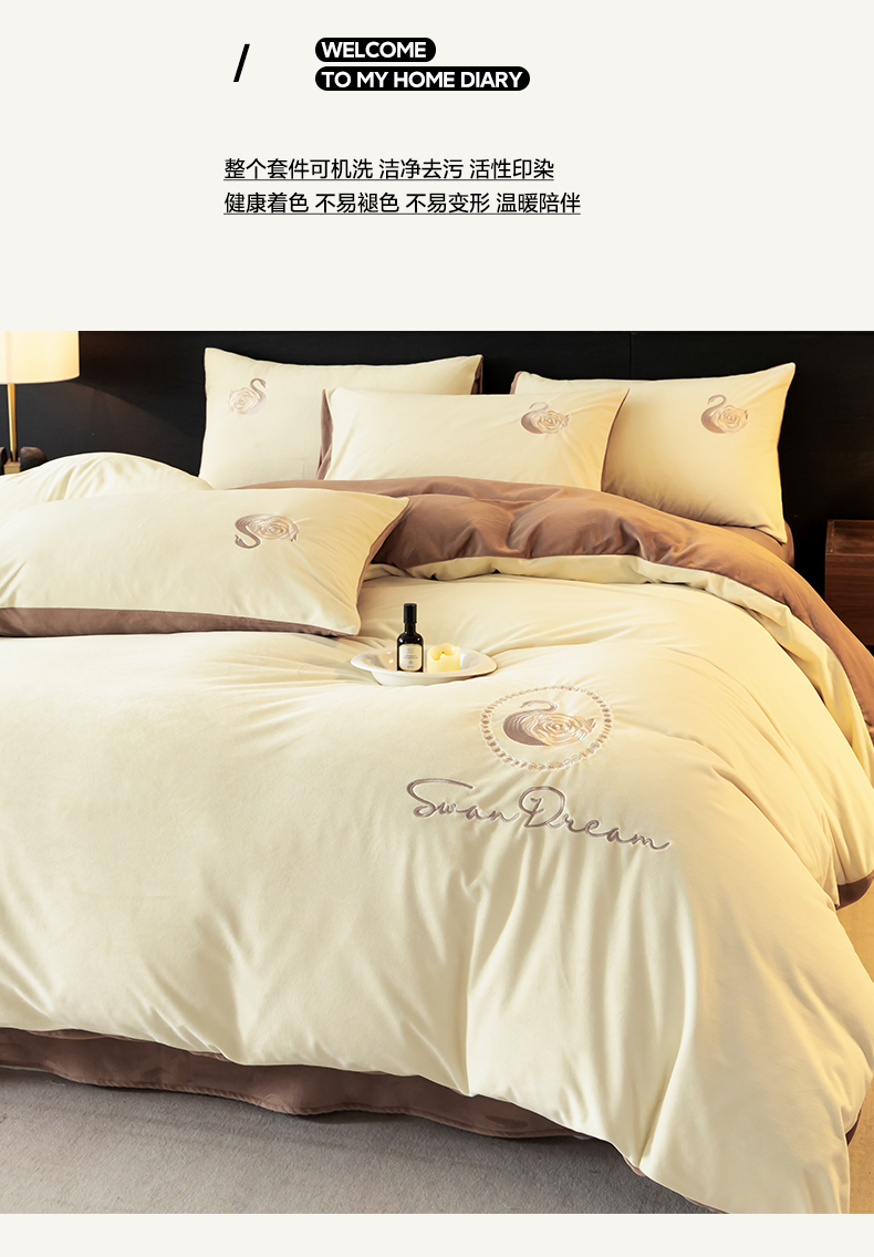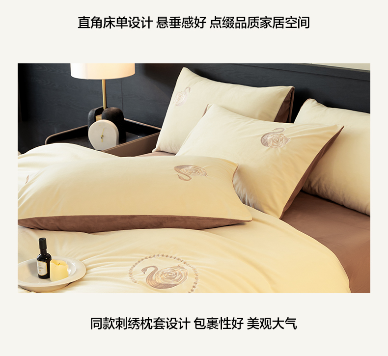 商品名称:如一 2025新款水晶绒双拼刺绣四件套天鹅系列 天鹅-奶昔白