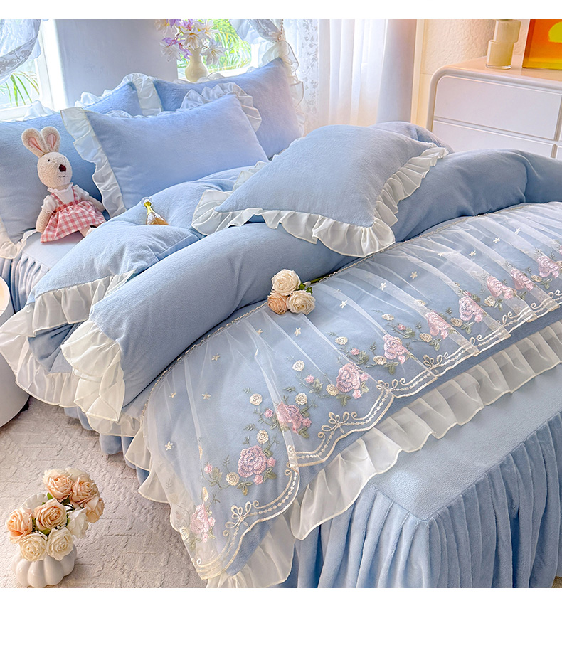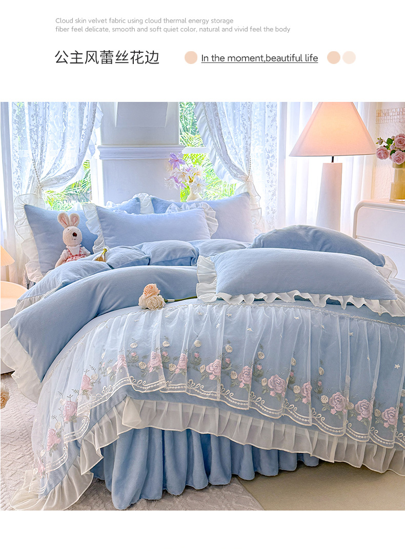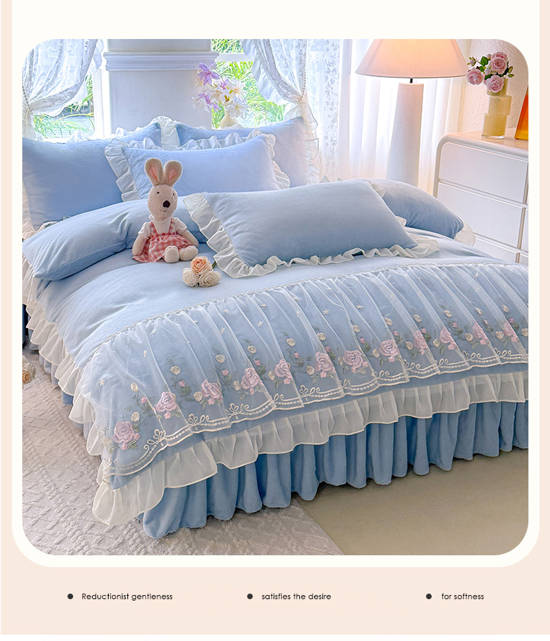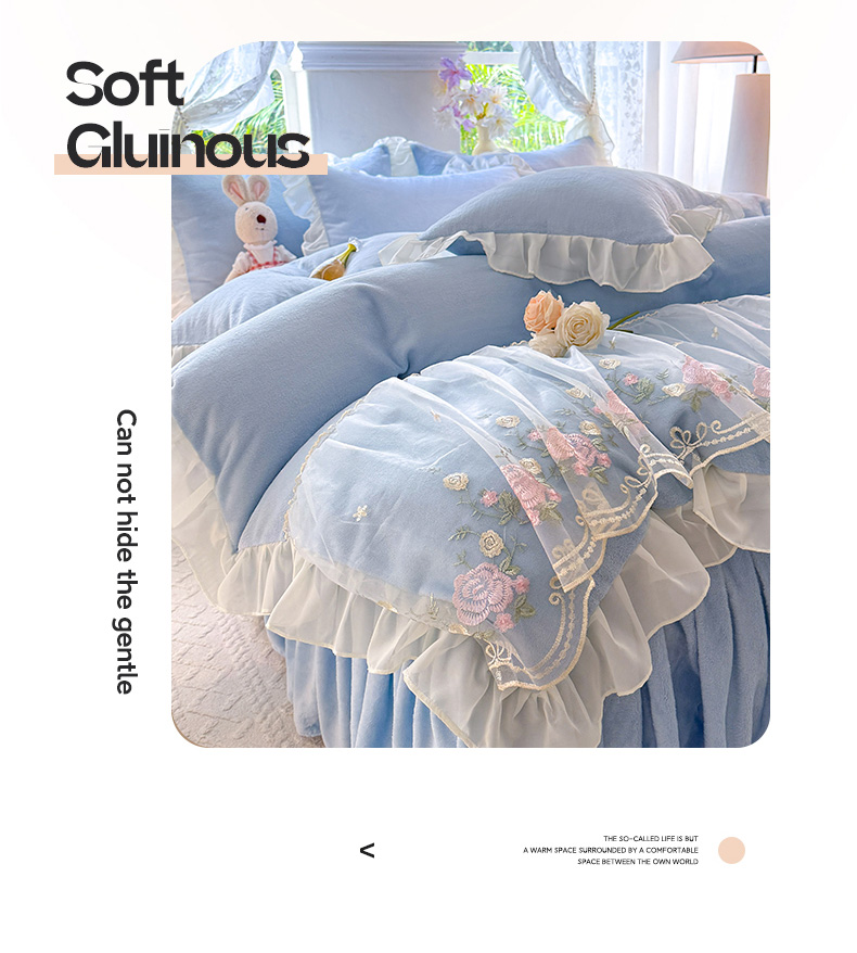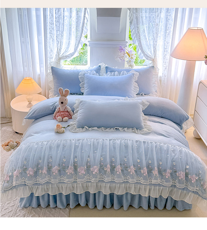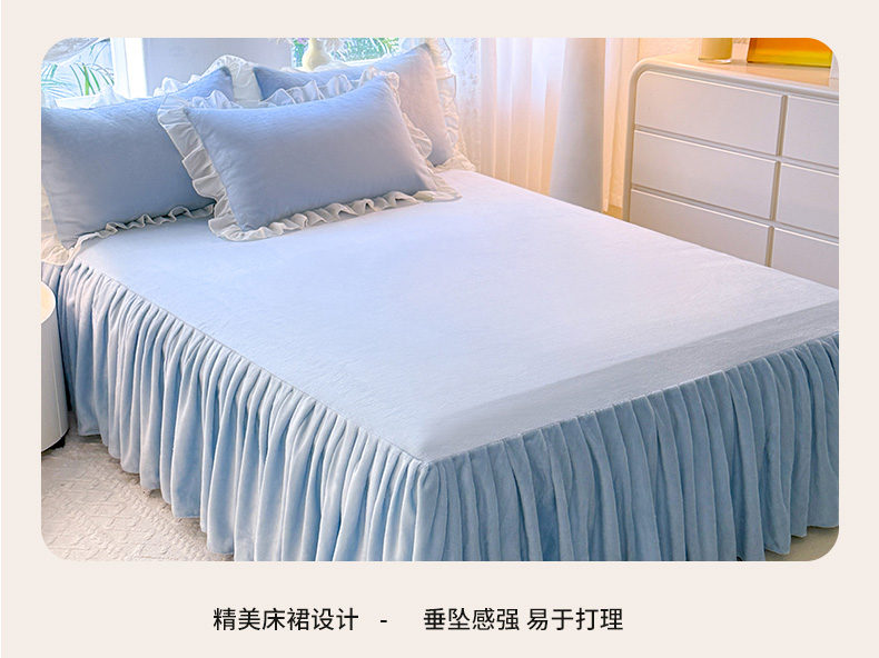 当前位置: 91家纺网 > 商品网购 > 床品套件 > 四件套 > 牛奶绒四件套 > 后庭寝室 2025新款高克重牛奶绒公主风床裙四件套-甜心系列 甜心-浅蓝