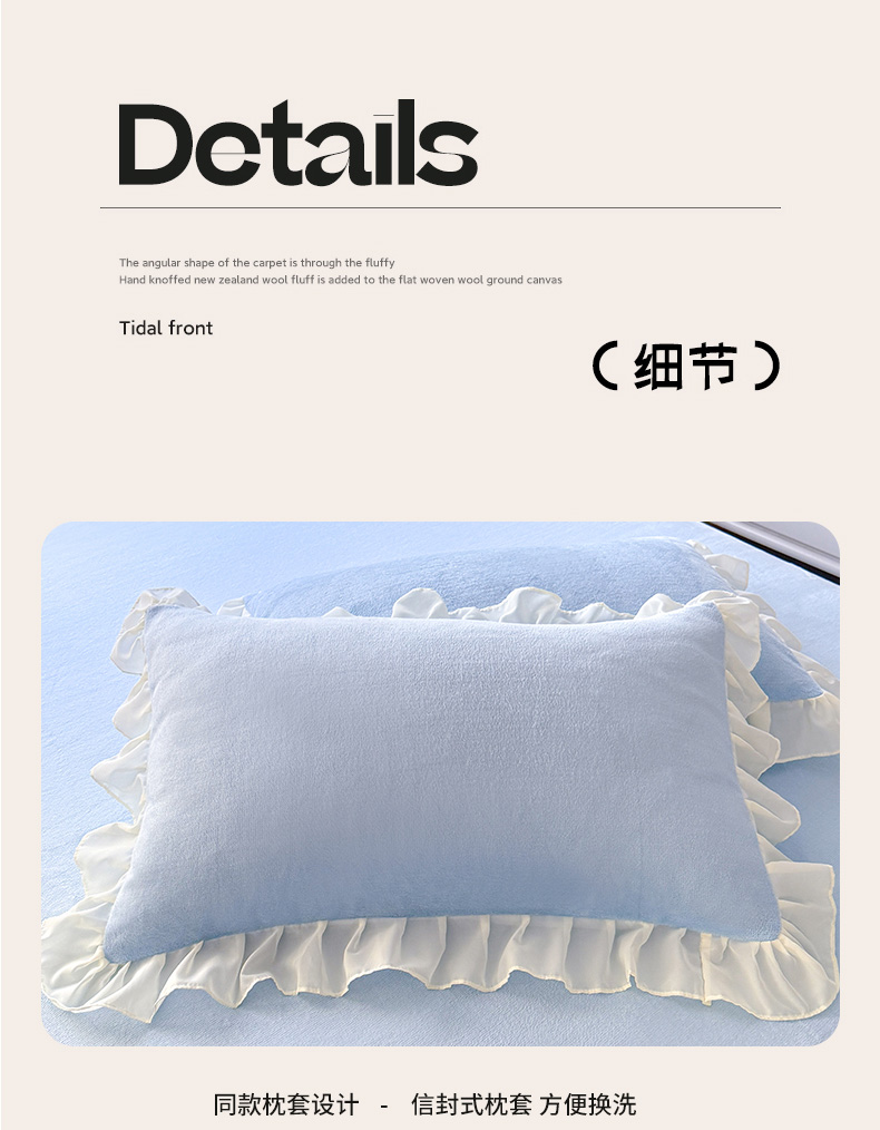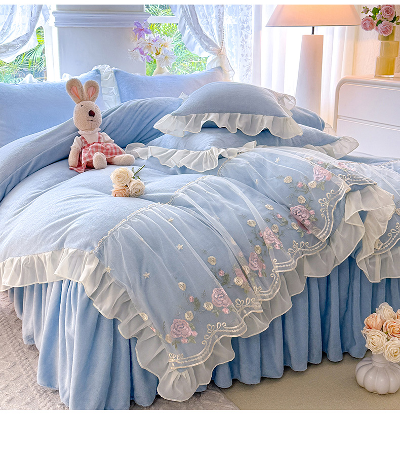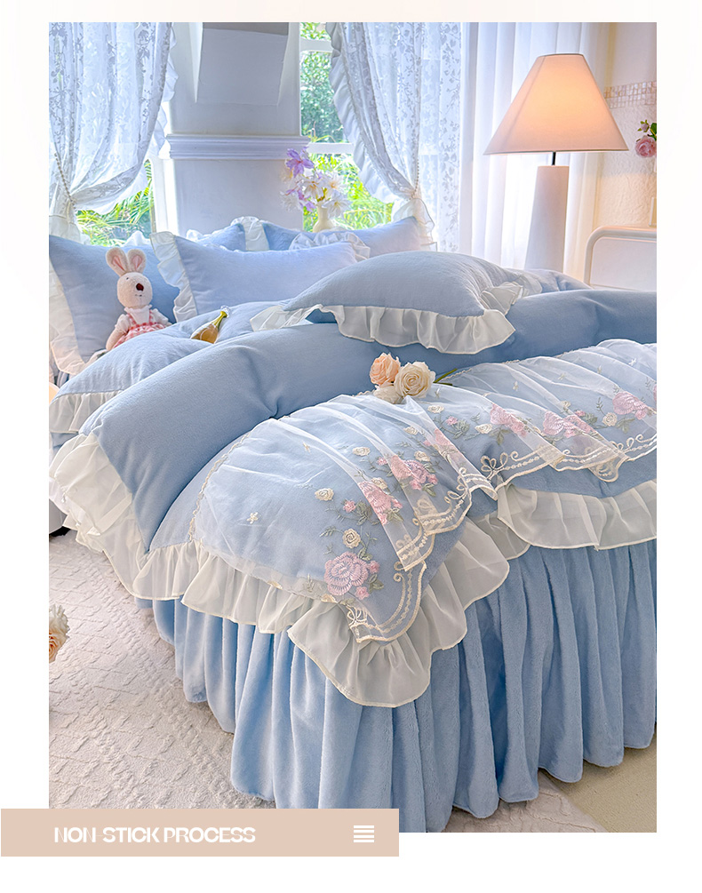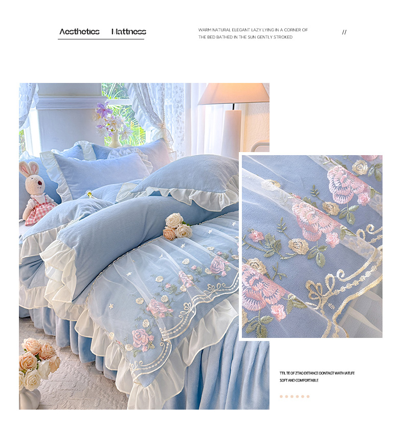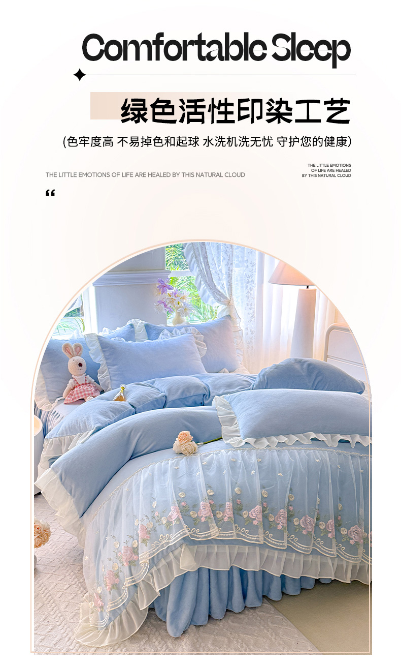 当前位置: 91家纺网 > 商品网购 > 床品套件 > 四件套 > 牛奶绒四件套 > 后庭寝室 2025新款高克重牛奶绒公主风床裙四件套-甜心系列 甜心-浅蓝