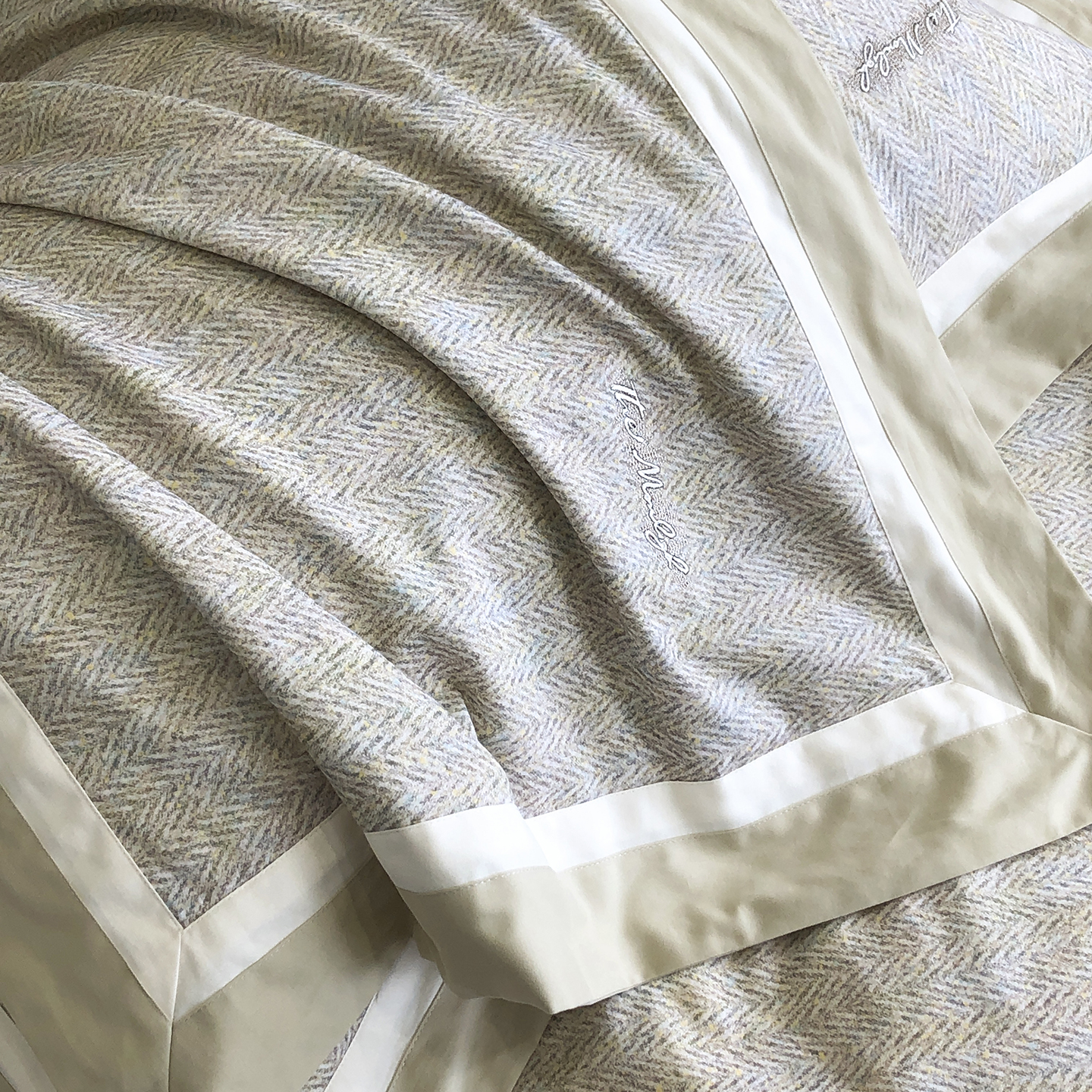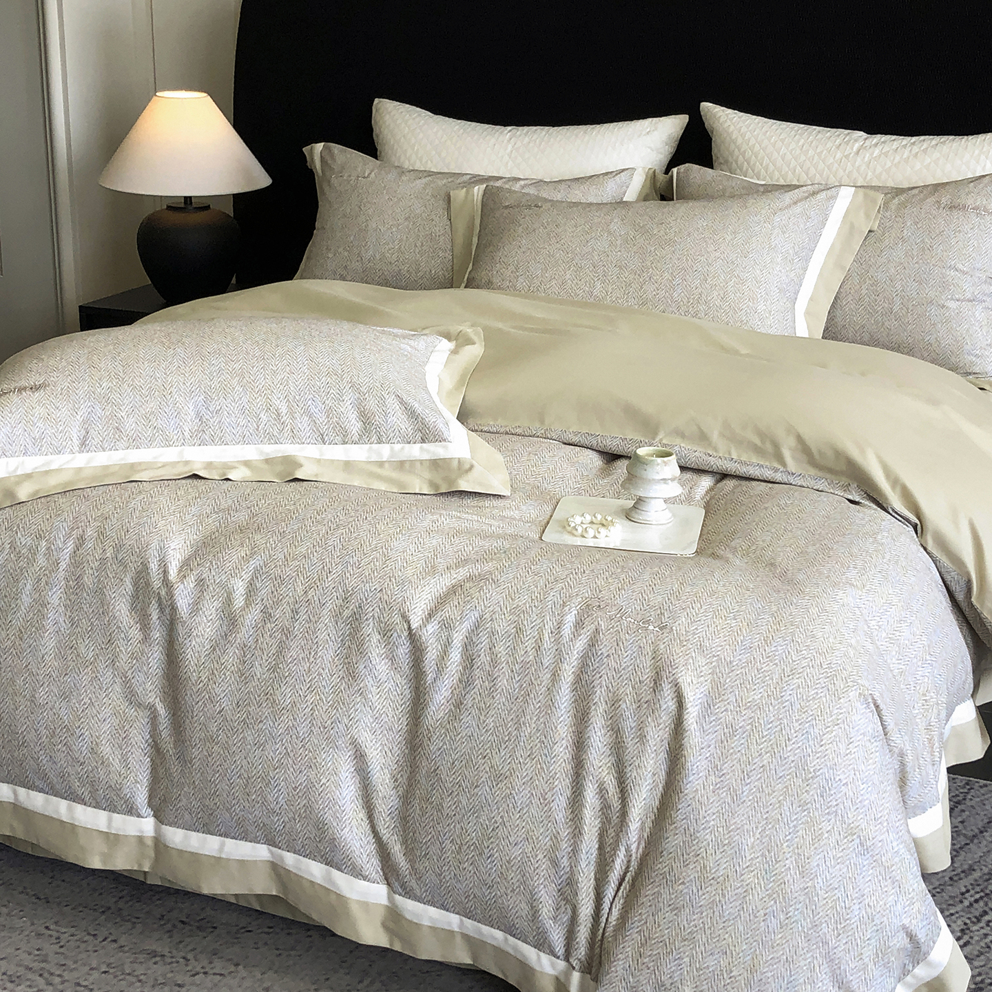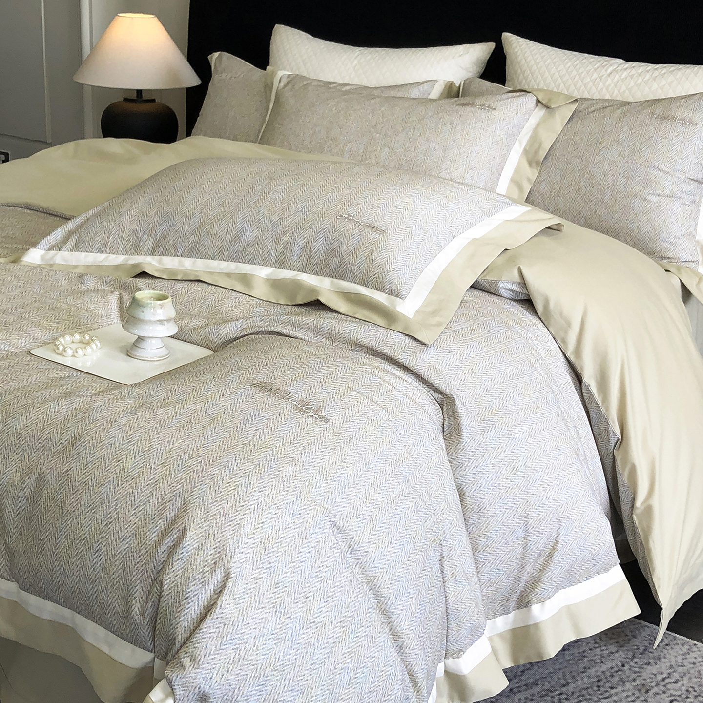 (总)佳汐蓝家纺 2025新款全棉60支磨毛肌理纹撞色拼边四件套-瑶雅系列