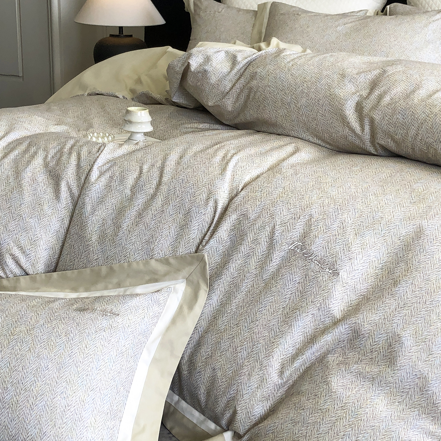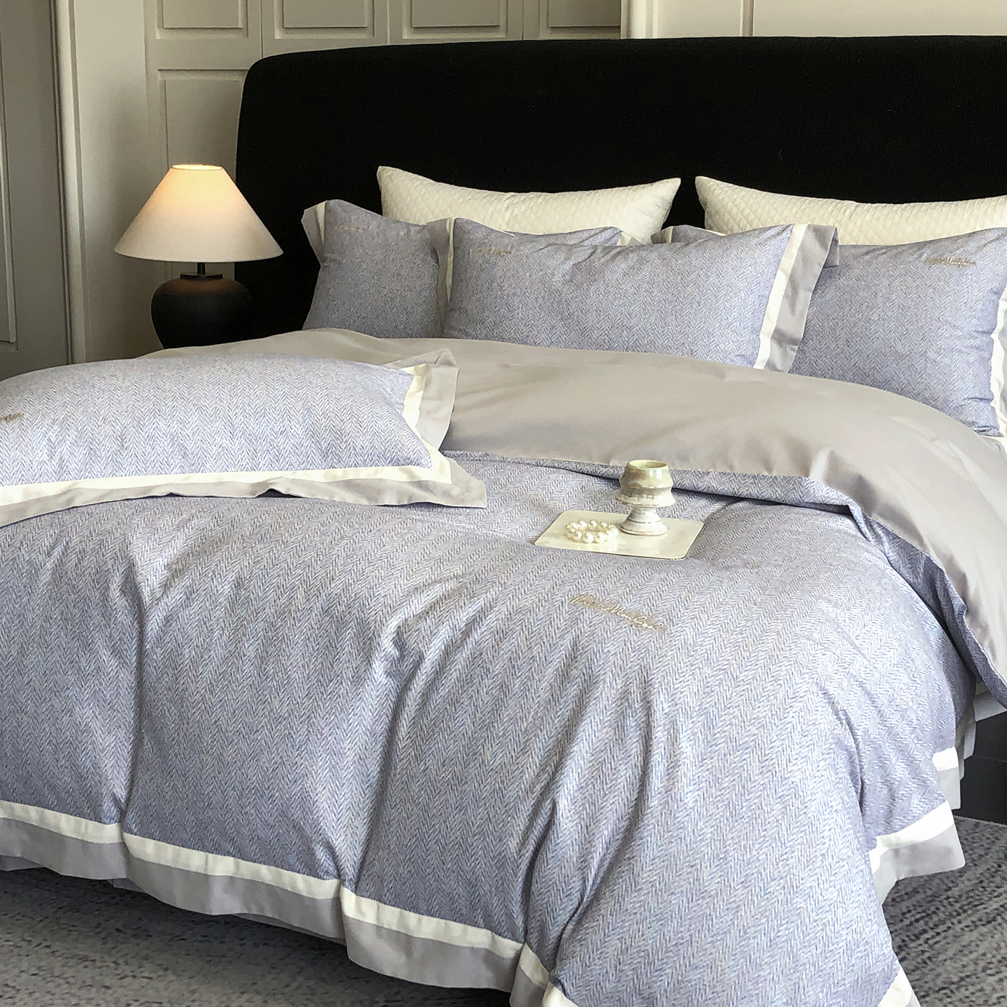 商品名称:(总)佳汐蓝家纺 2025新款全棉60支磨毛肌理纹撞色拼边四件套-瑶雅系列