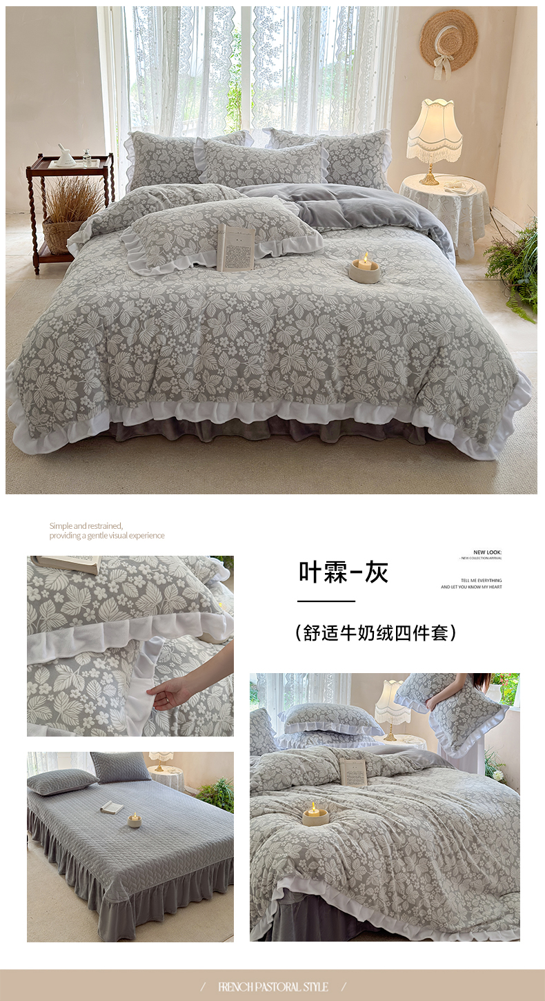 (总)野合家纺 2025新款牛奶绒夹棉床盖床裙款三件套-树叶,树叶-粉,树叶-灰,树叶-咖,树叶-兰,树叶-绿