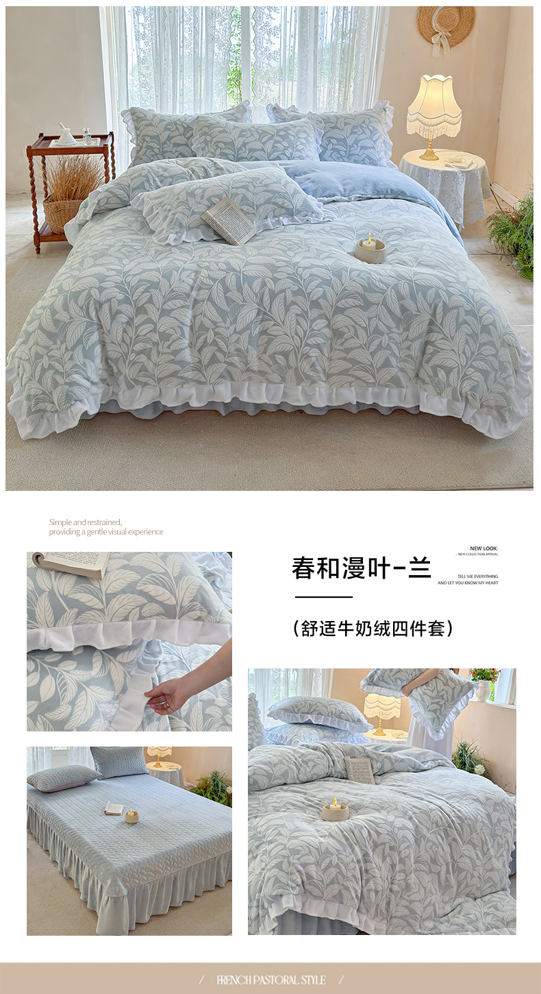 (总)野合家纺 2024新款法式A类雕花牛奶绒韩版公主风四件套床盖款床单款床笠款,花开花艳-粉紫,花开花艳-蓝,花叶绵绵-灰紫,麦芮-豆沙,山茶花-马利兰,山茶花-奶昔紫,山茶花-秋黄,山茶花-象牙白,山茶花-杏仁粉