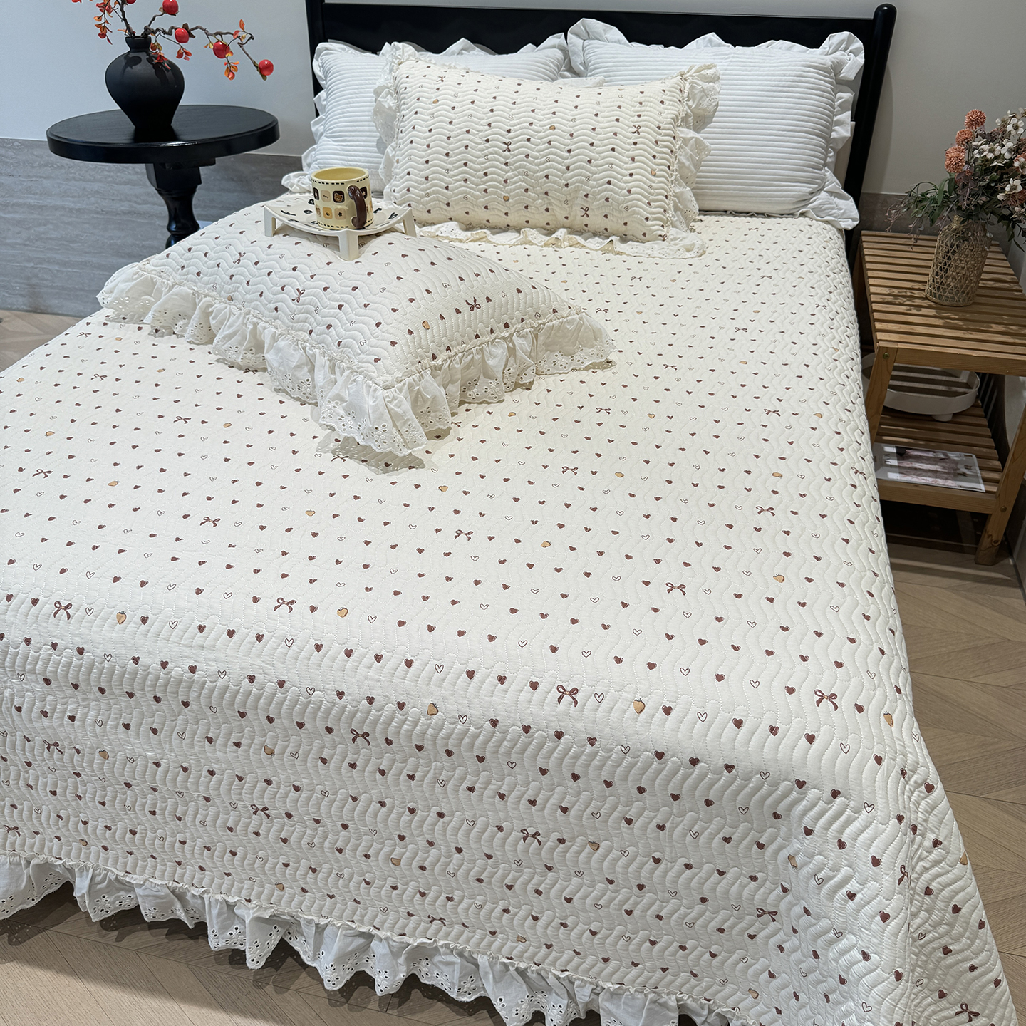 (总)莱豫家纺 2025春夏新款纯棉全棉花边款床盖三件套,呆呆熊,组合图仅供参考,花语绿,花语紫,柠檬,蔷薇,西瓜兔,夏蓝,夏梦,夏之语,小花熊,樱花