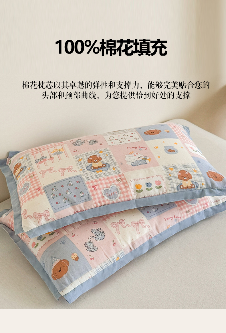 贵夫人 2025新款卡通儿童100%纯棉花枕 枕头枕芯 萌宠格子铺儿童一对