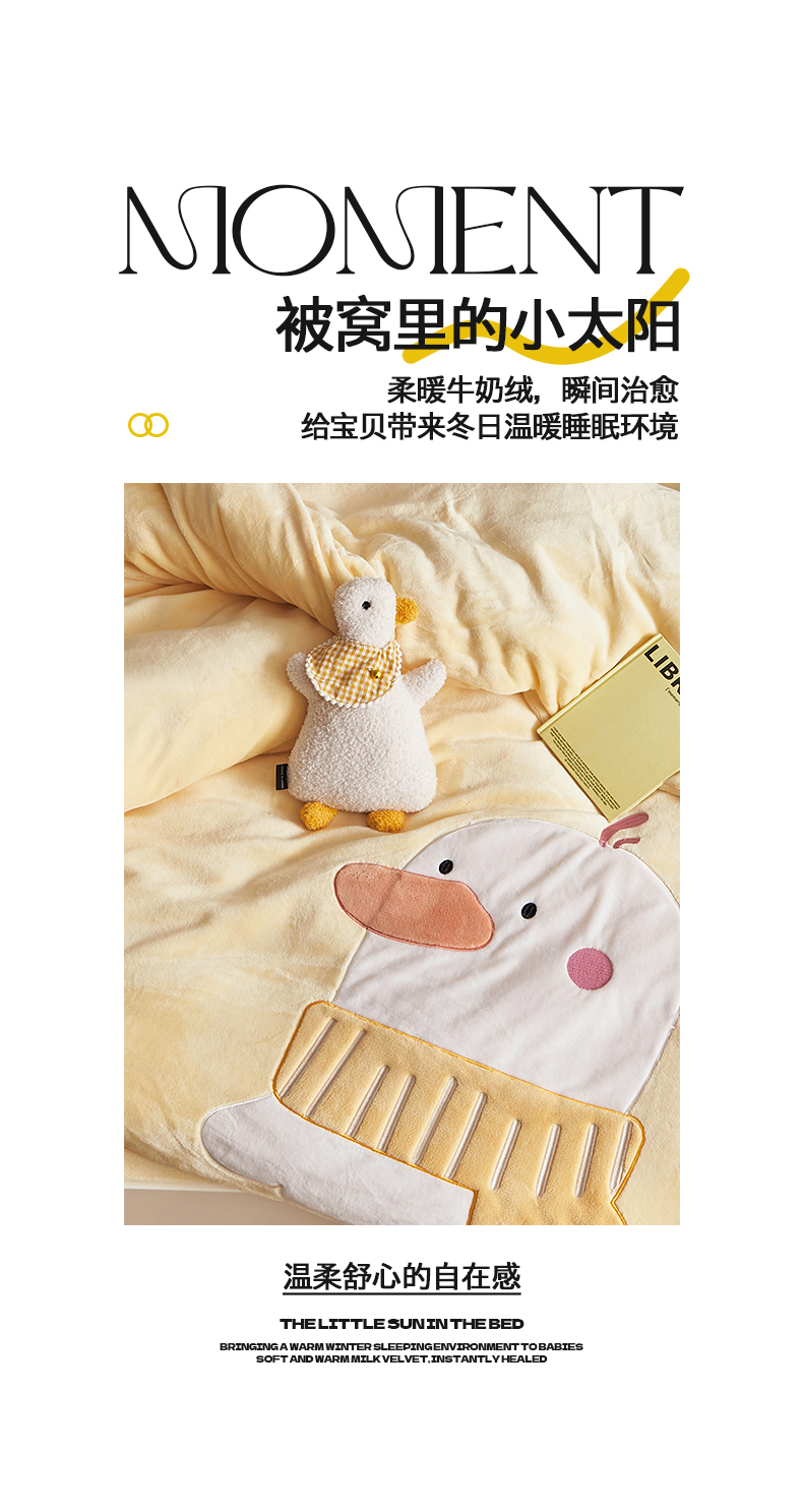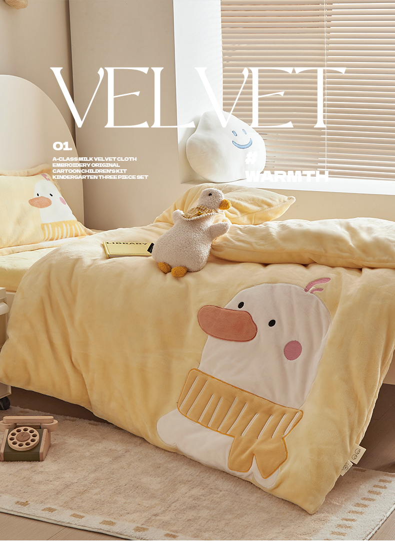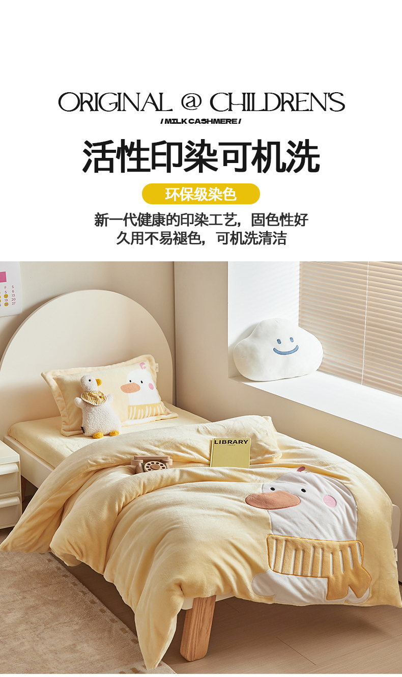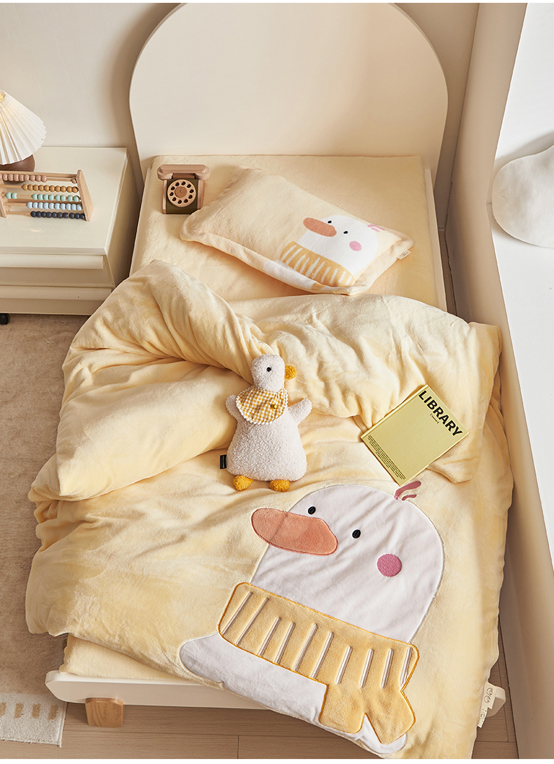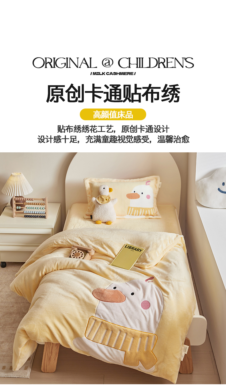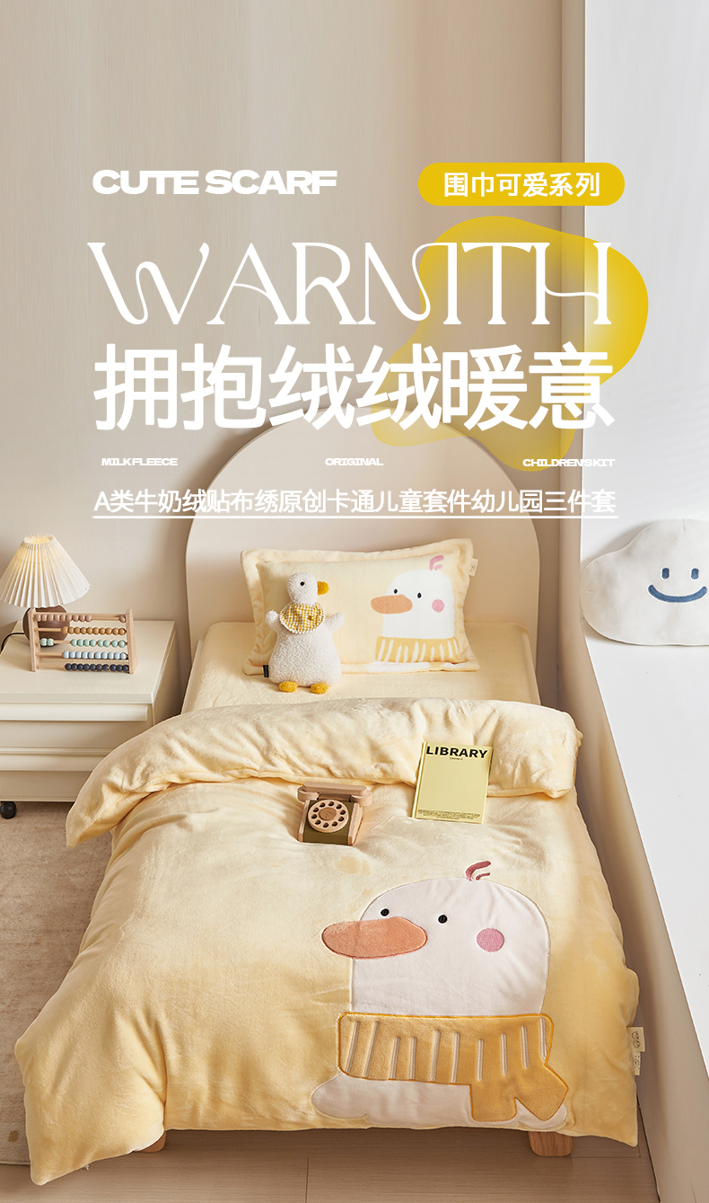 商品名称:荷马之梦 2025新款A类牛奶绒贴布绣原创卡通儿童套件幼儿园三件套-围住可爱系列 围巾小鸭