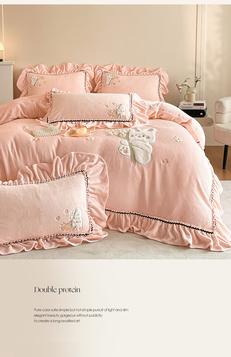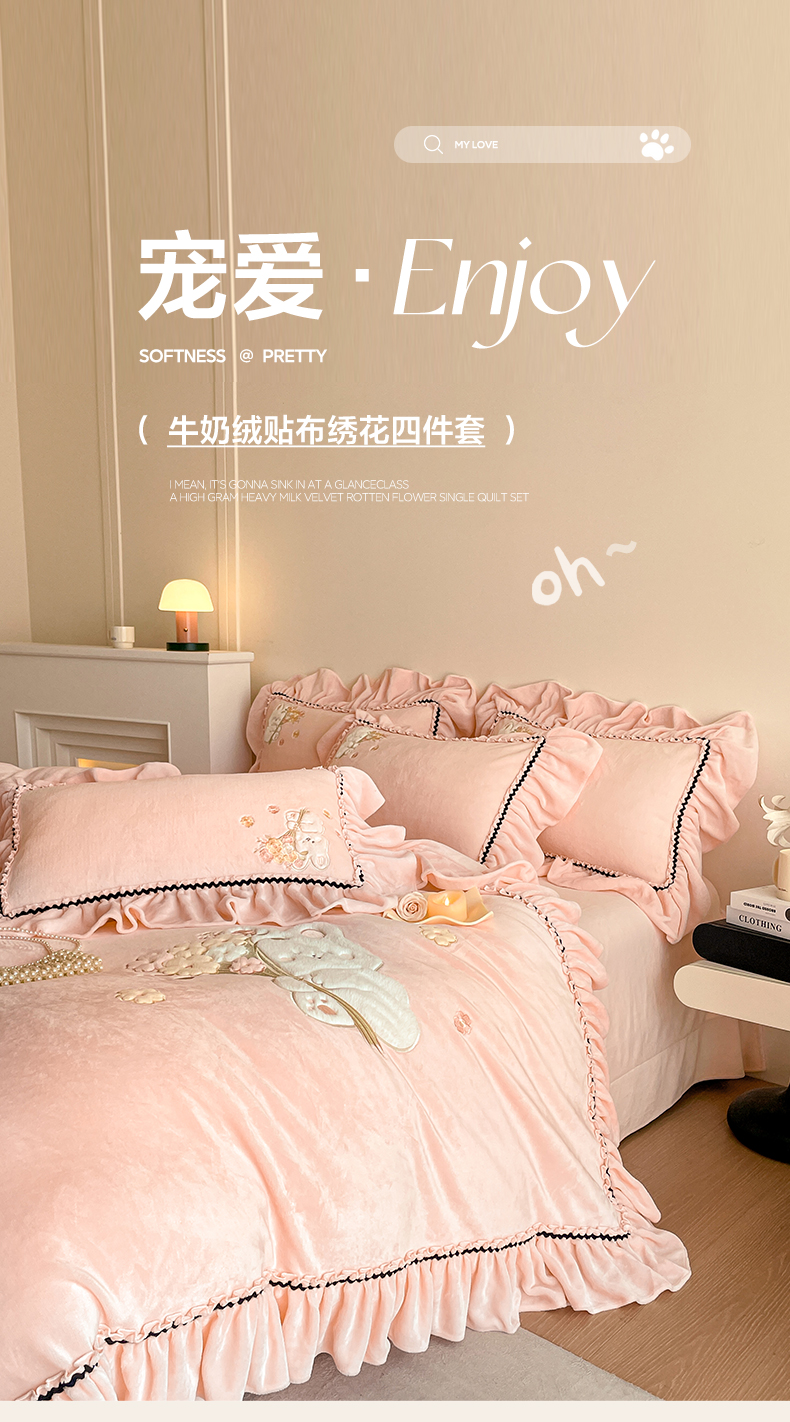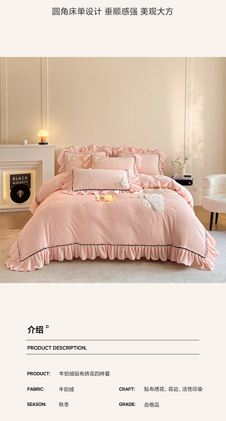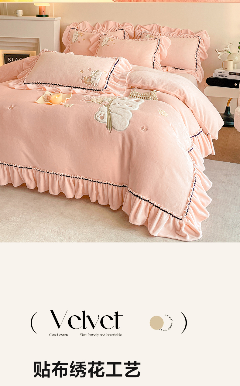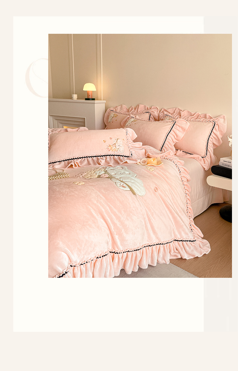 商品名称:民新家纺 2025新款牛奶绒毛巾绣贴布绣花四件套 梦境-樱花粉