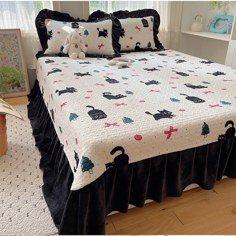 红嘴企鹅 2025新款花边加厚牛奶绒单品床盖单件床盖三件套 圣诞猫