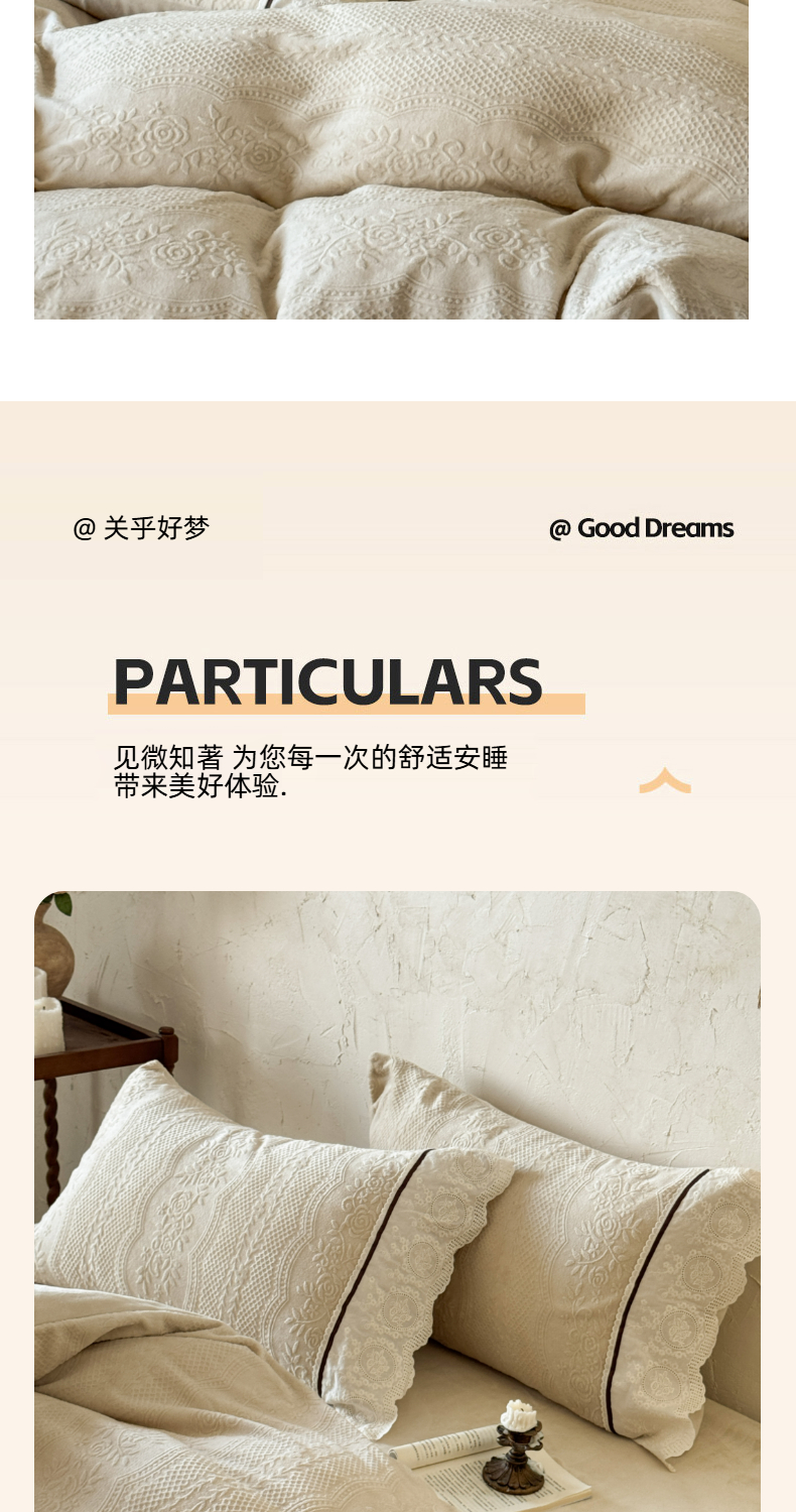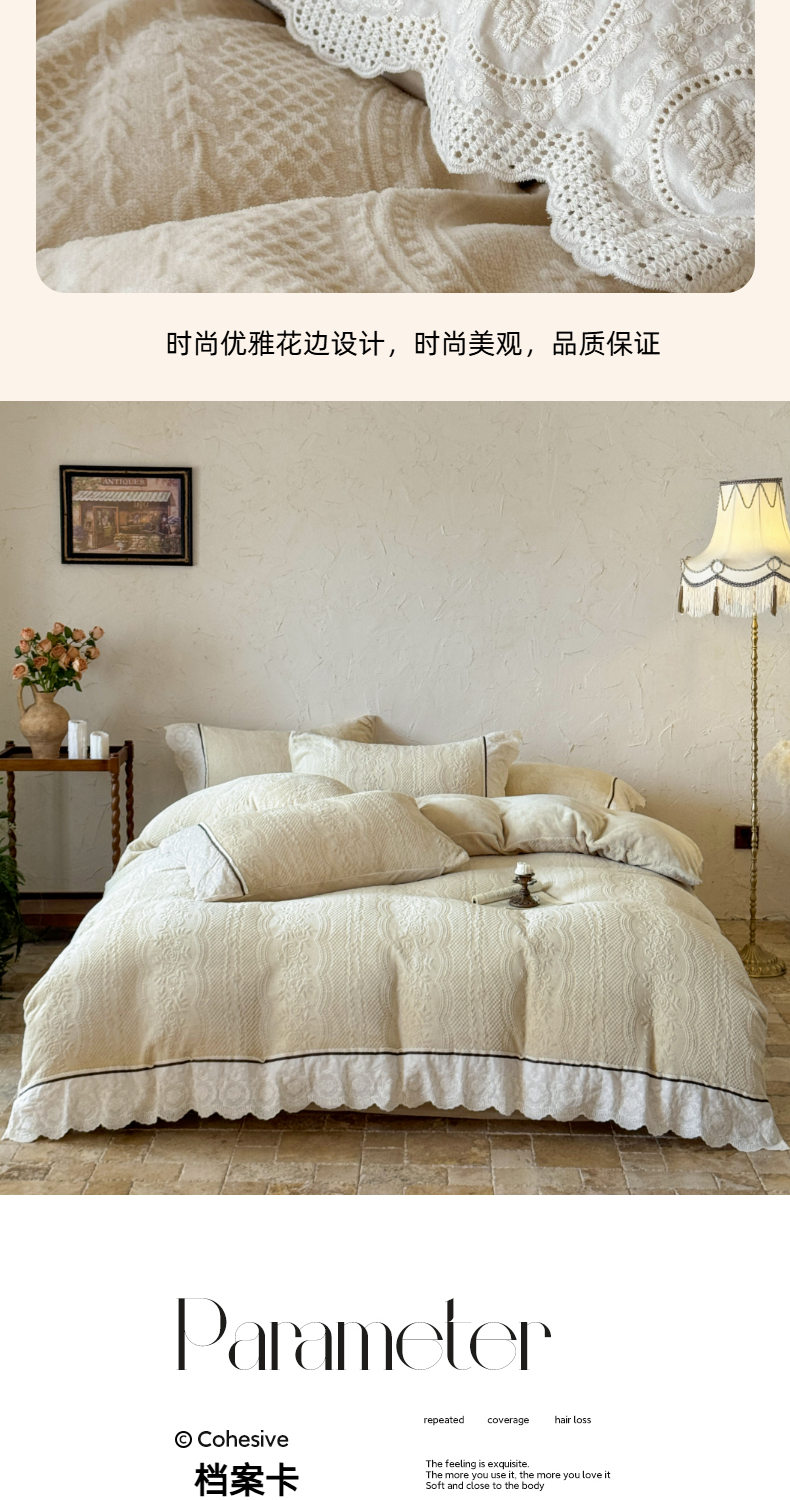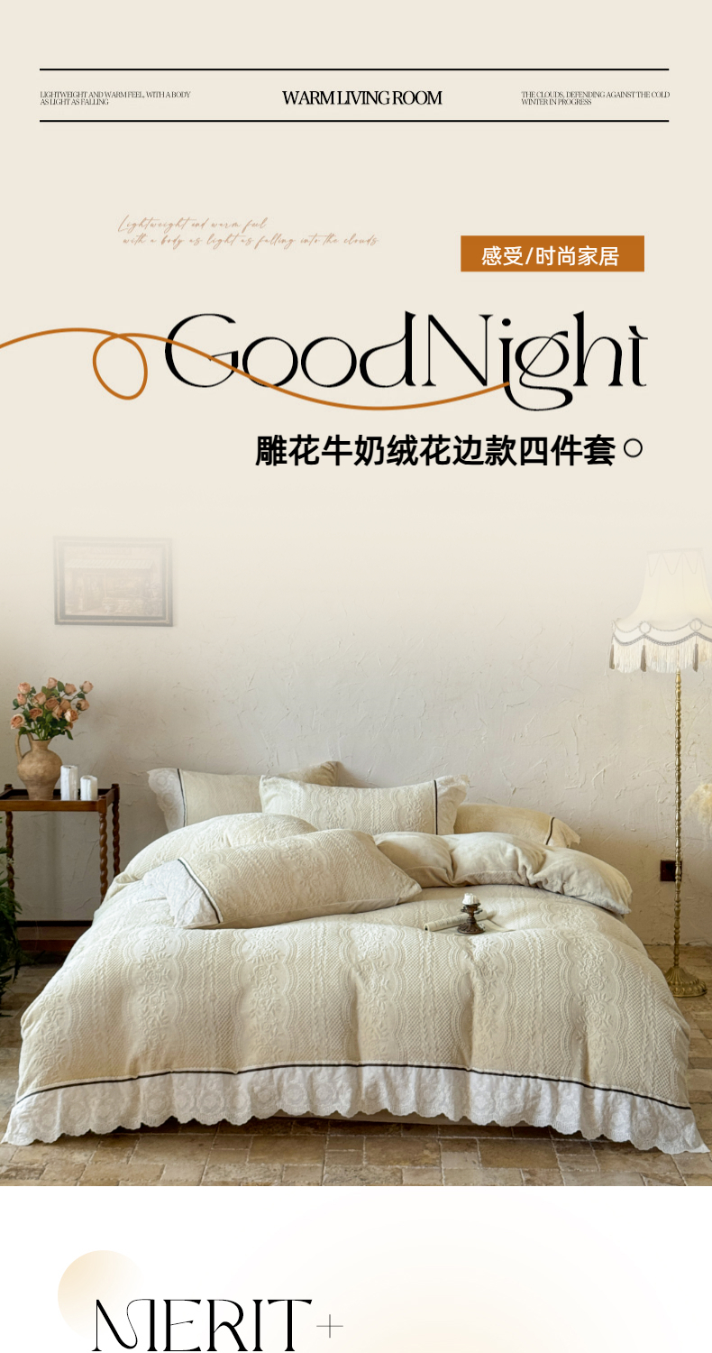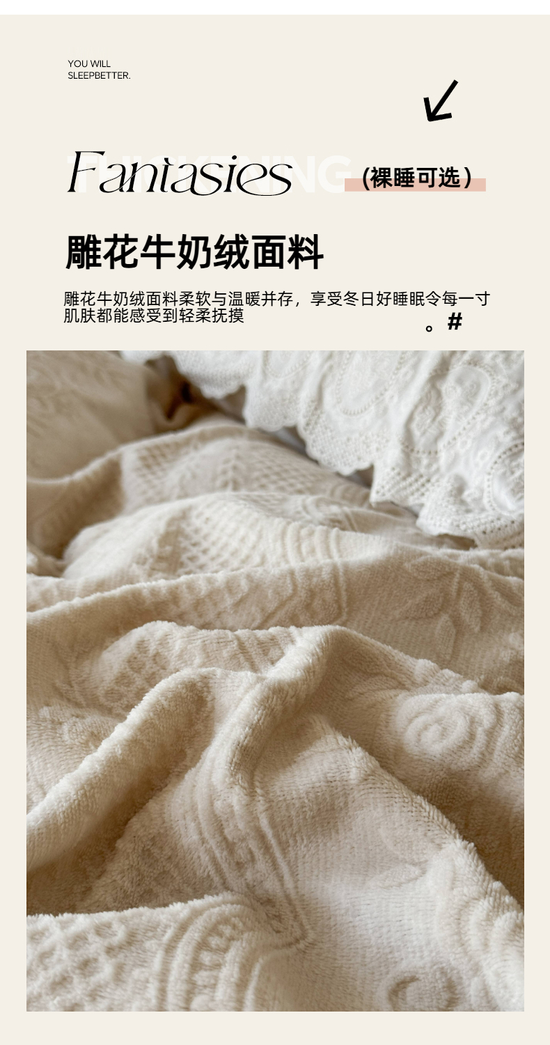 纯优家纺 2025新款秋冬轻法式花边款雕花牛奶绒四件套-绮梦 绮梦-米黄