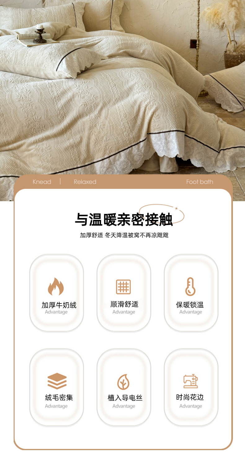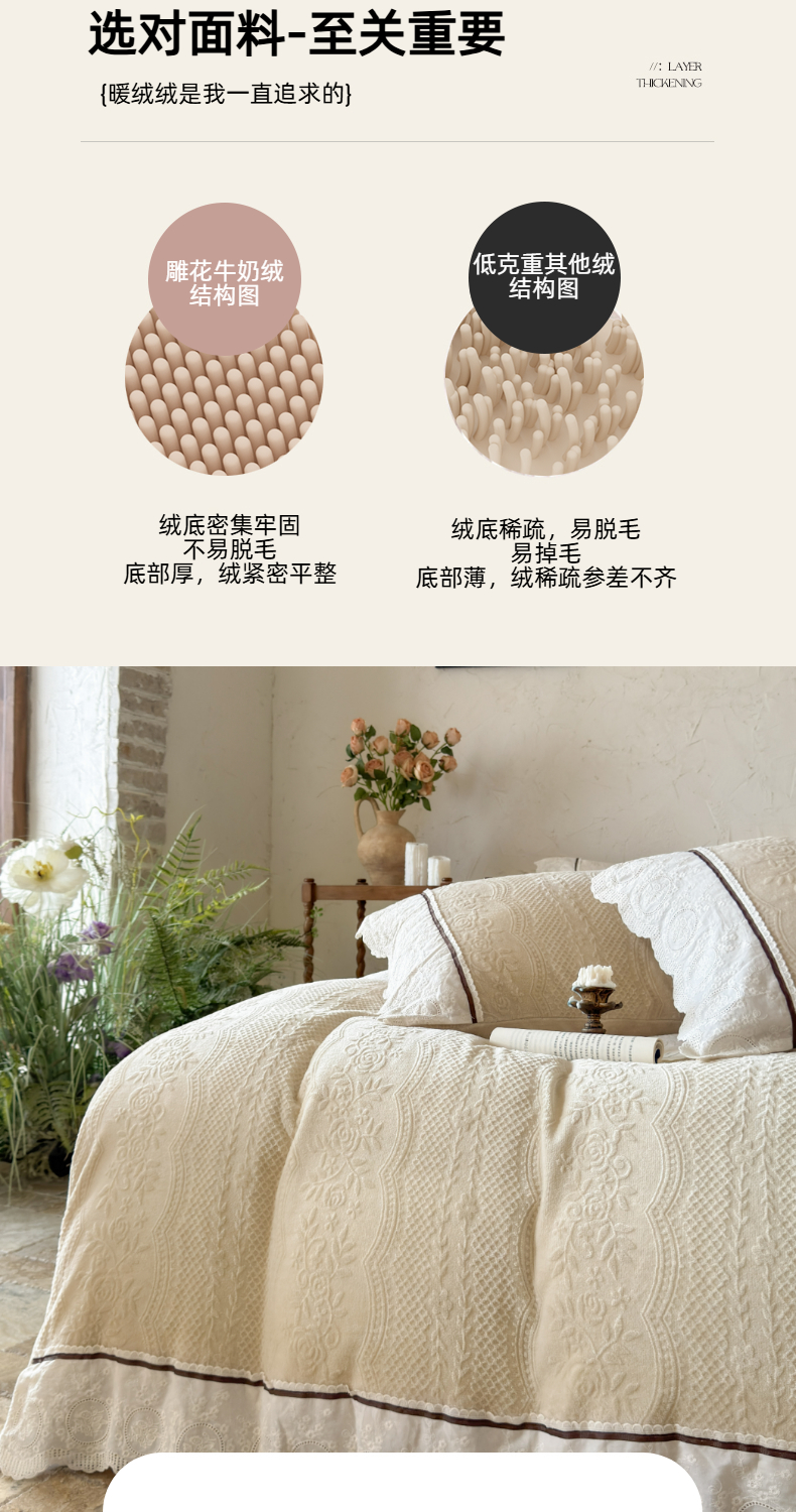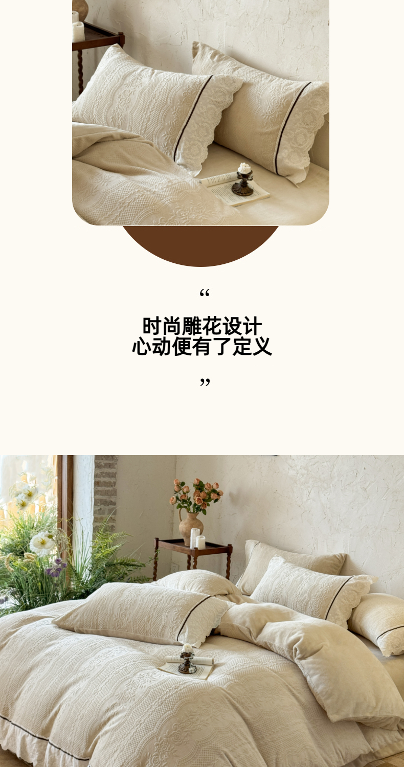 纯优家纺 2025新款秋冬轻法式花边款雕花牛奶绒四件套-绮梦 绮梦-米黄
