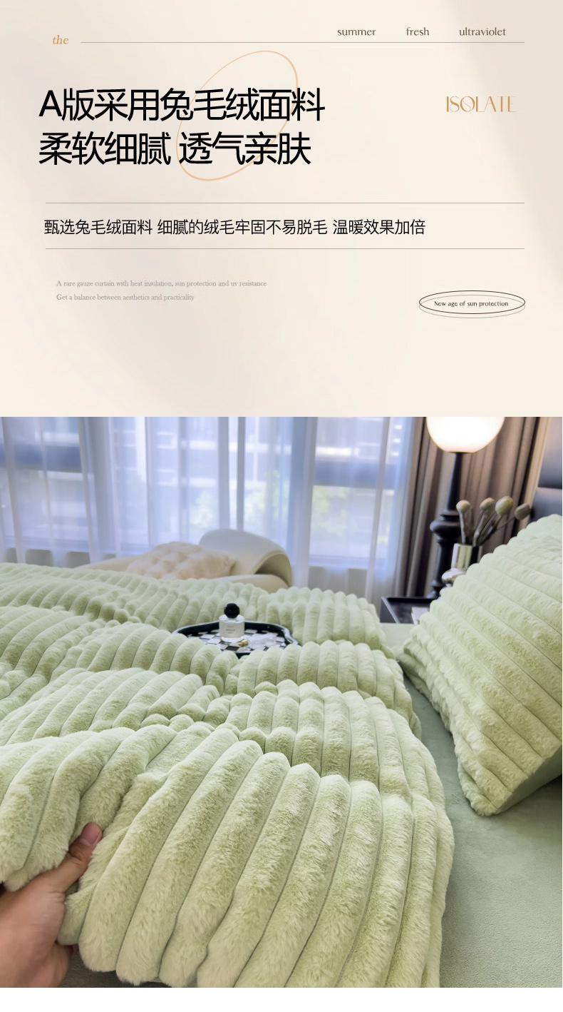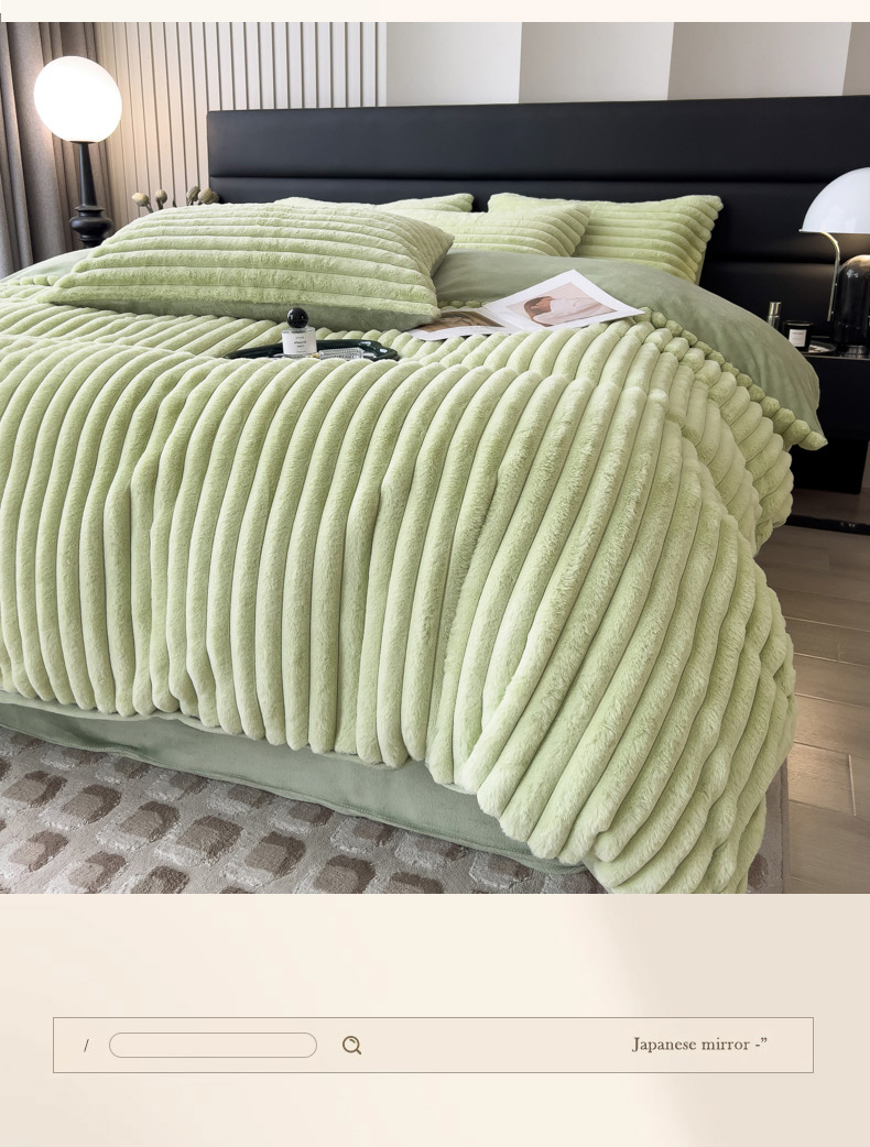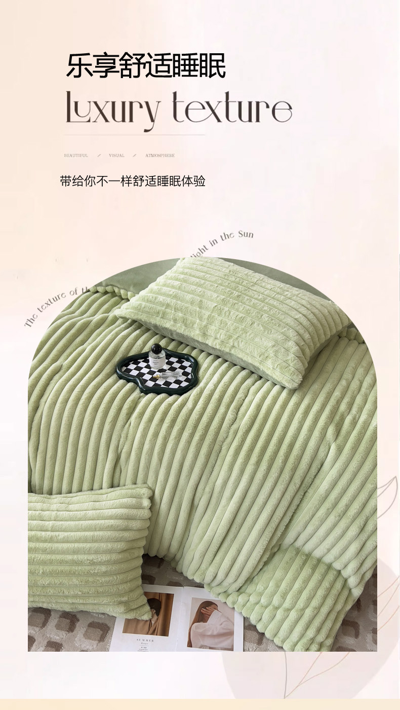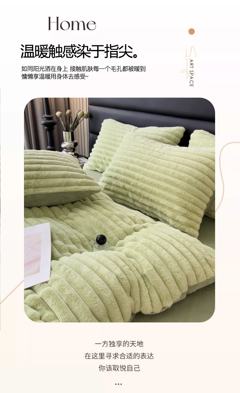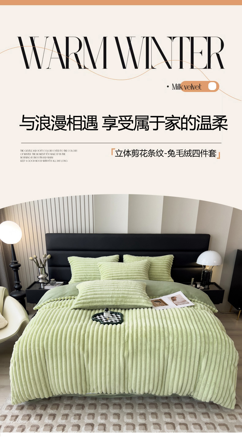 当前位置: 91家纺网 > 商品网购 > 床品套件 > 四件套 > 兔毛绒四件套 > 印季家纺 2025新款立体剪花条纹兔毛绒四件套 草绿