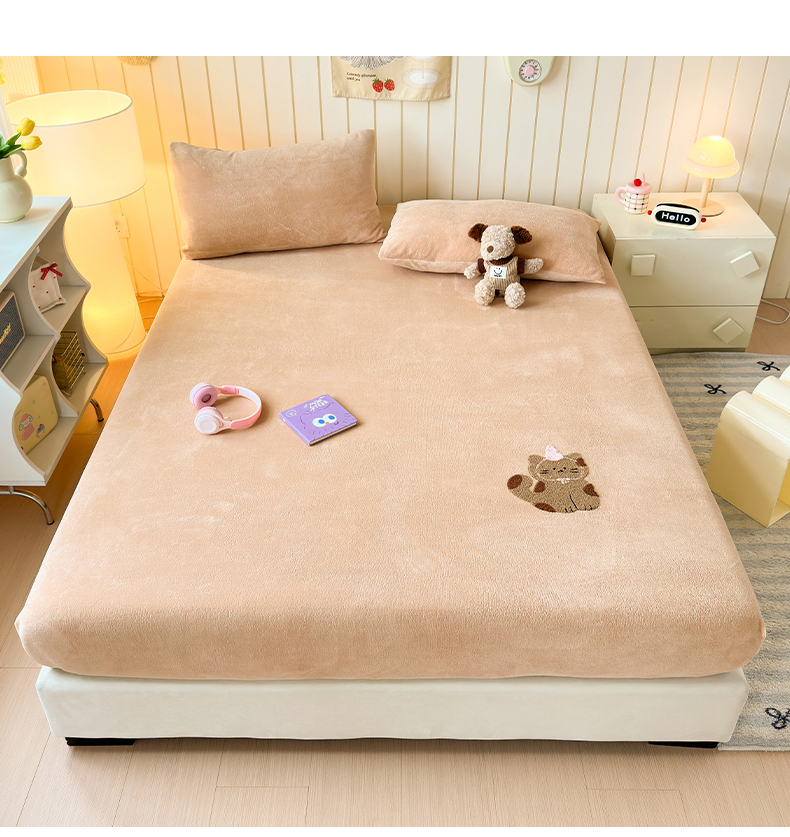 商品名称:云尚床笠 2026新款亲肤舒适毛巾绣牛奶绒加厚单床笠单品床笠单件床笠-卡通猫 卡通猫-暖阳杏