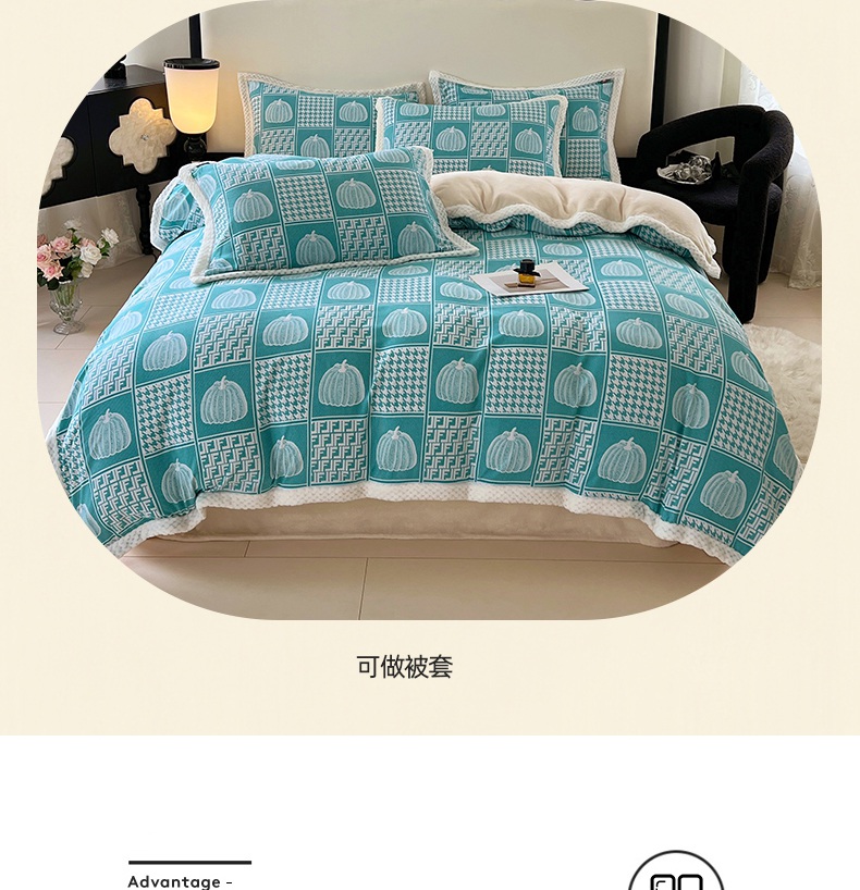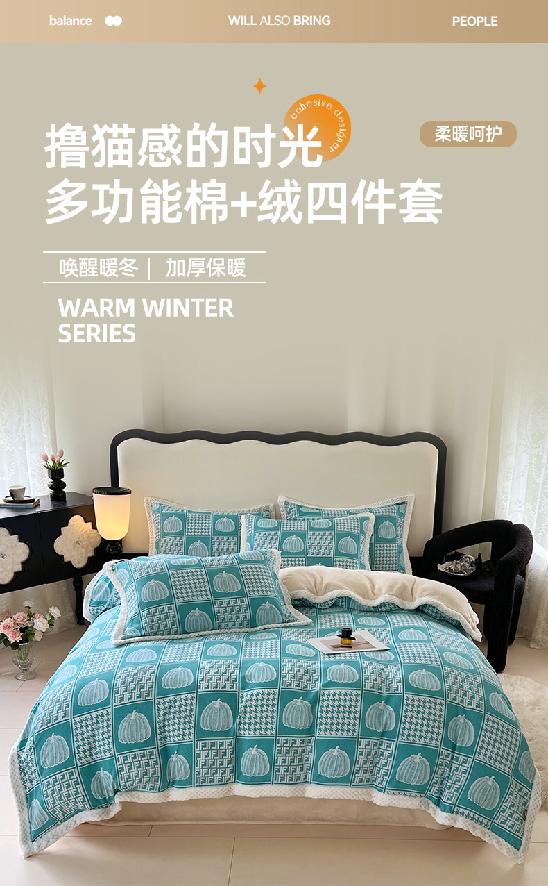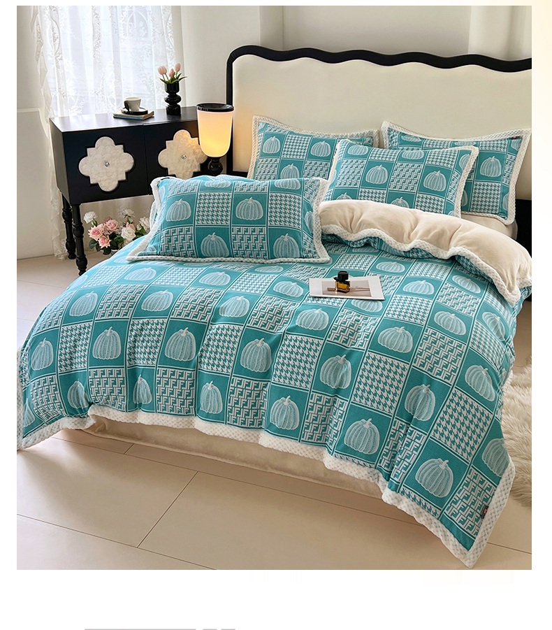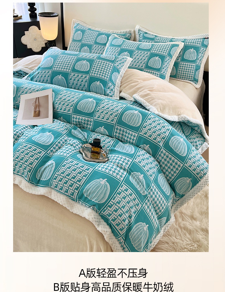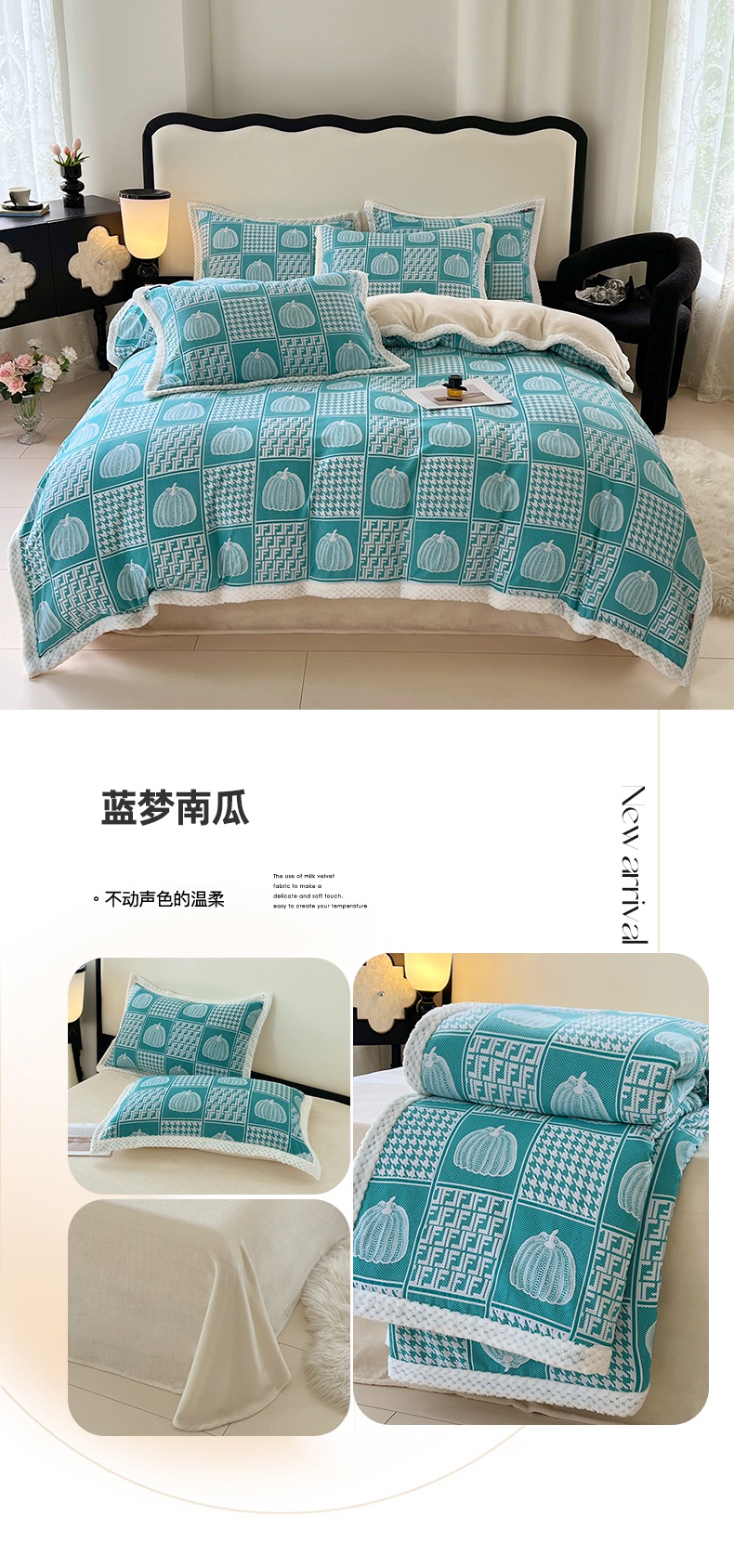 yyds网供 2025新款棉加绒四件套多功能盖毯被套牛奶绒四件套床单款-南瓜 蓝梦南瓜