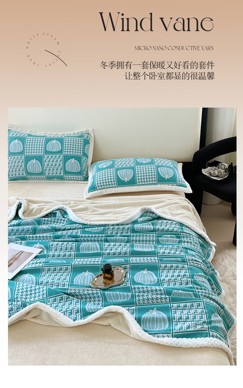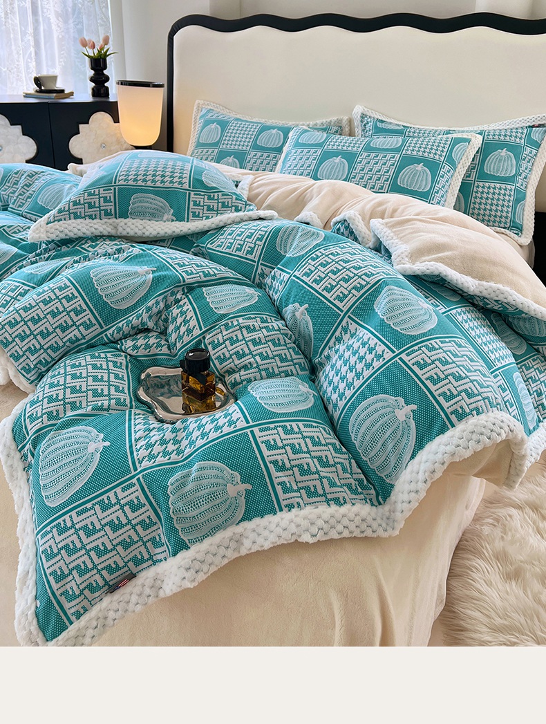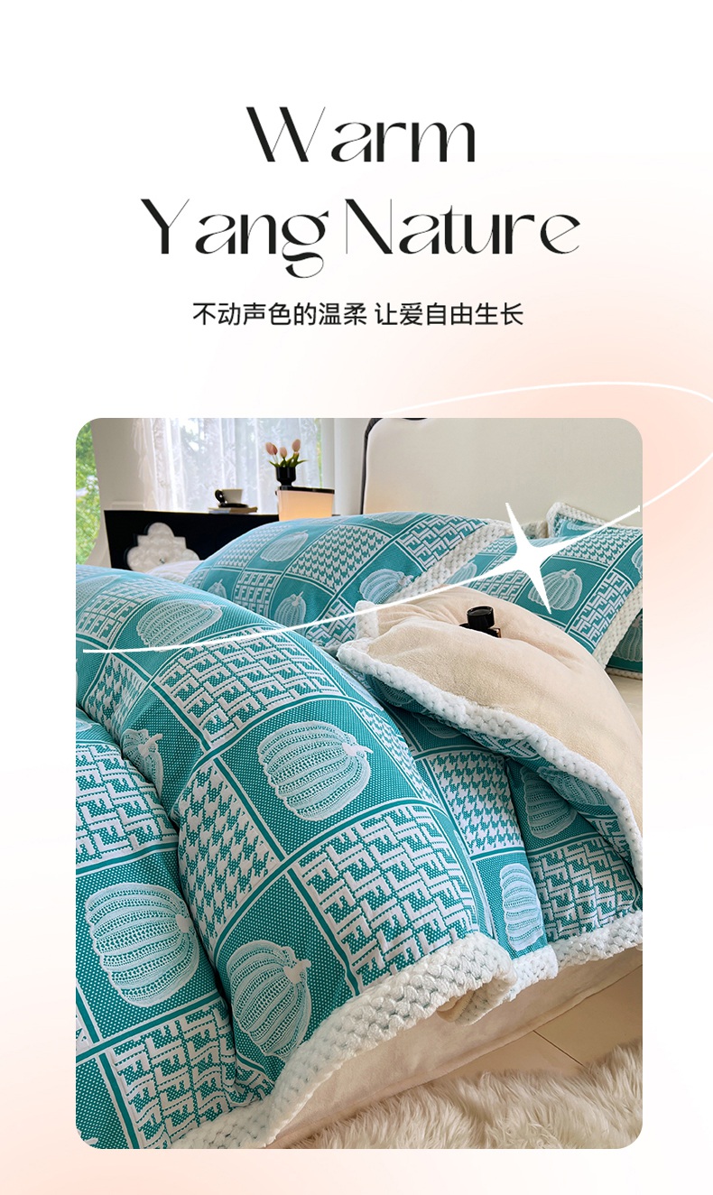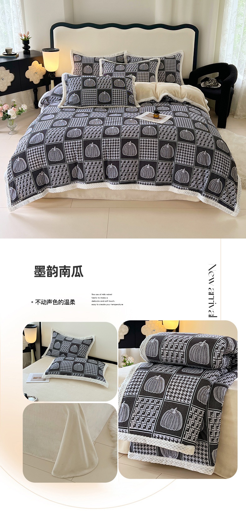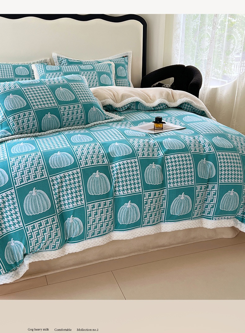 yyds网供 2025新款棉加绒四件套多功能盖毯被套牛奶绒四件套床单款-南瓜 蓝梦南瓜