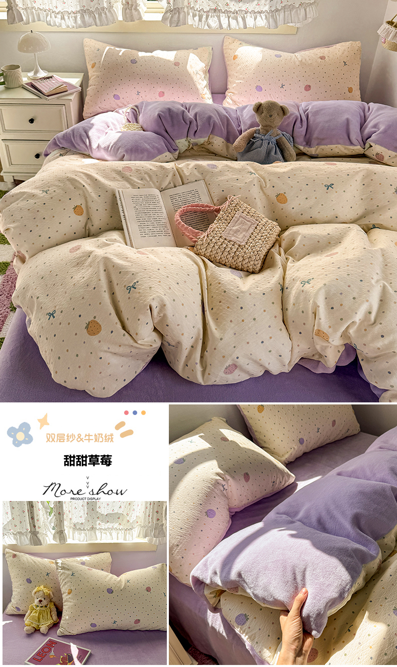(总)多品家纺 2025新款云感双层纱高克重牛奶绒四件套,甜甜草莓,黛西紫,可爱新新,空谷兰香,蓝大格,猫猫小姐,木兰蝶,七里花香,十里春风,珍妮公主,紫大格