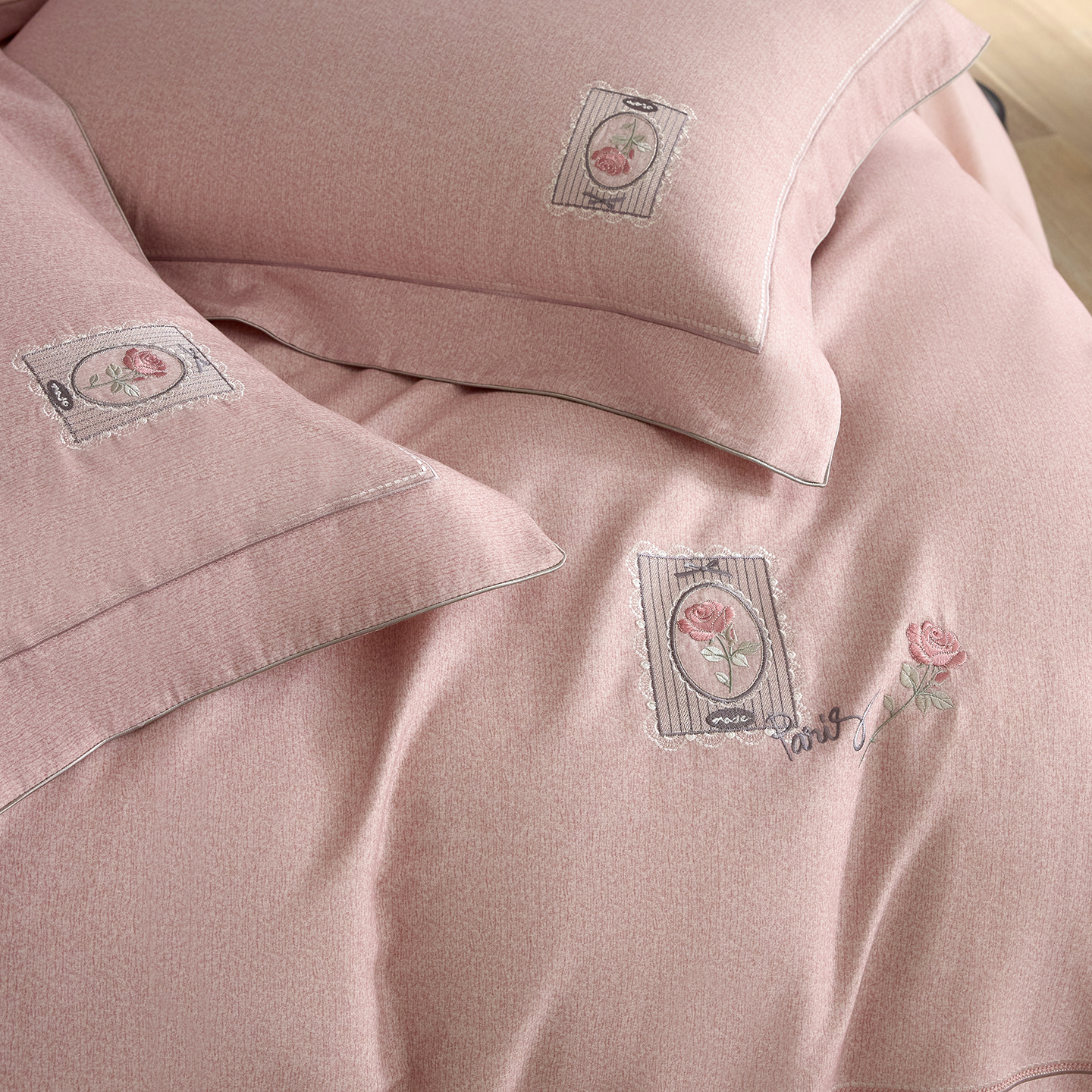 榻尚家居 2025秋冬新品纯棉贡缎磨毛绣花工艺款四件套-盛夏玫瑰(控价:398) 盛夏玫瑰 杏紫色