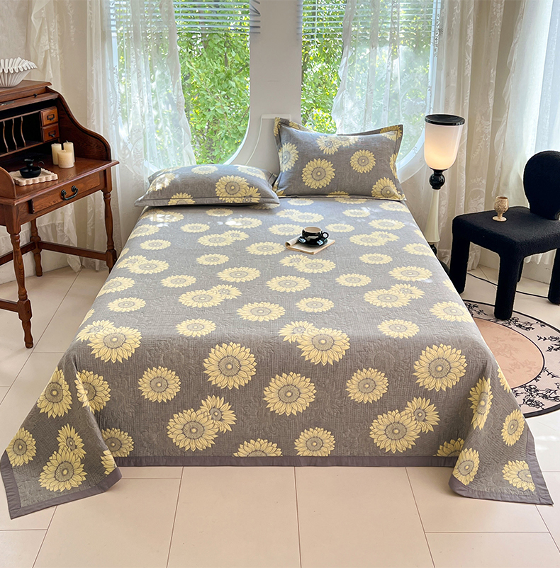 yyds网供 2025新款A类色织全棉三层纱布床盖三件套喷气夹棉盖毯夏被厚床单多功能榻榻米风格二 暖阳灰黄