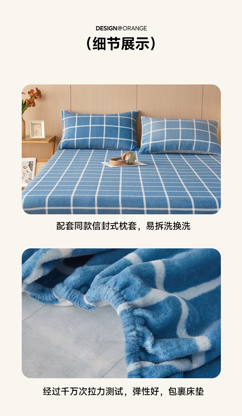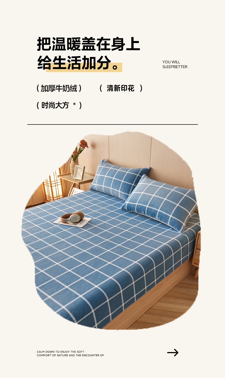 (总)一禾 2025新款简约印花高克重牛奶绒床笠,彩波点,简兮粉,简兮蓝,简兮绿,蓝大格,蓝小格,维卡蓝