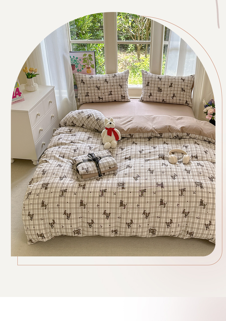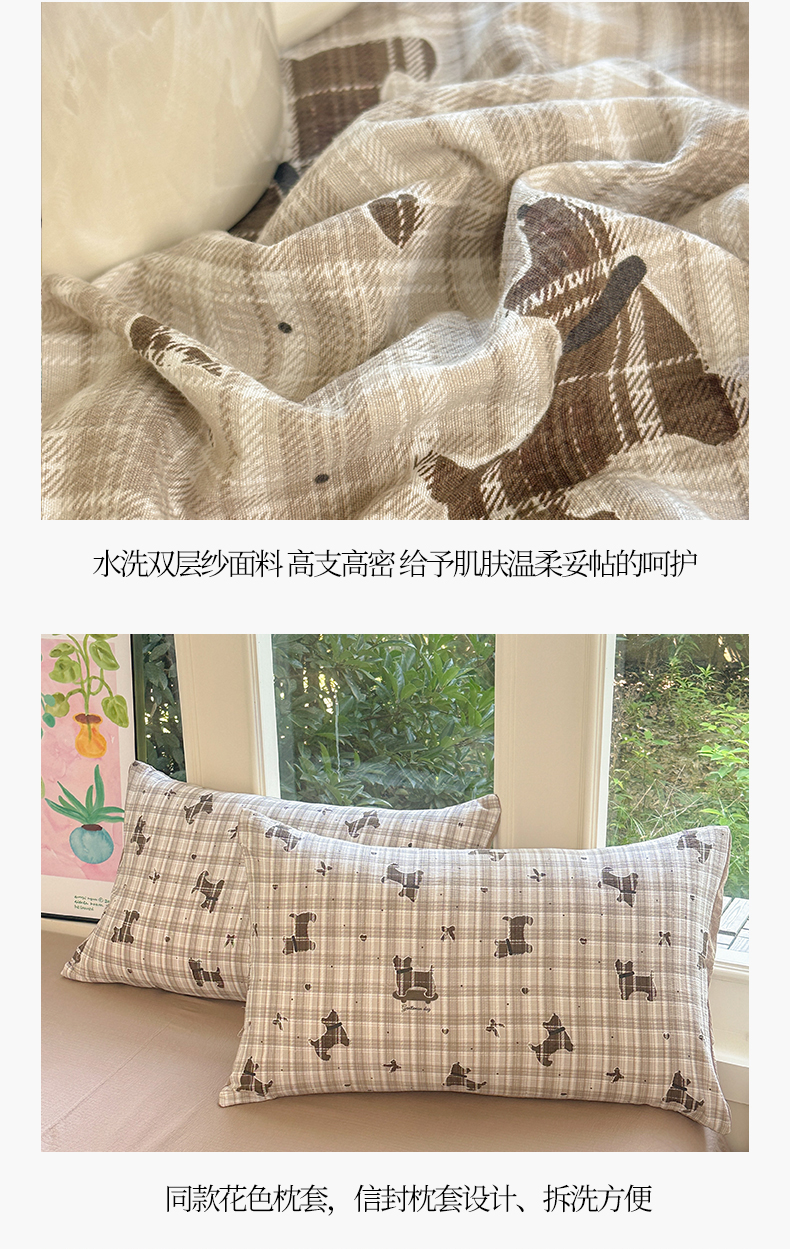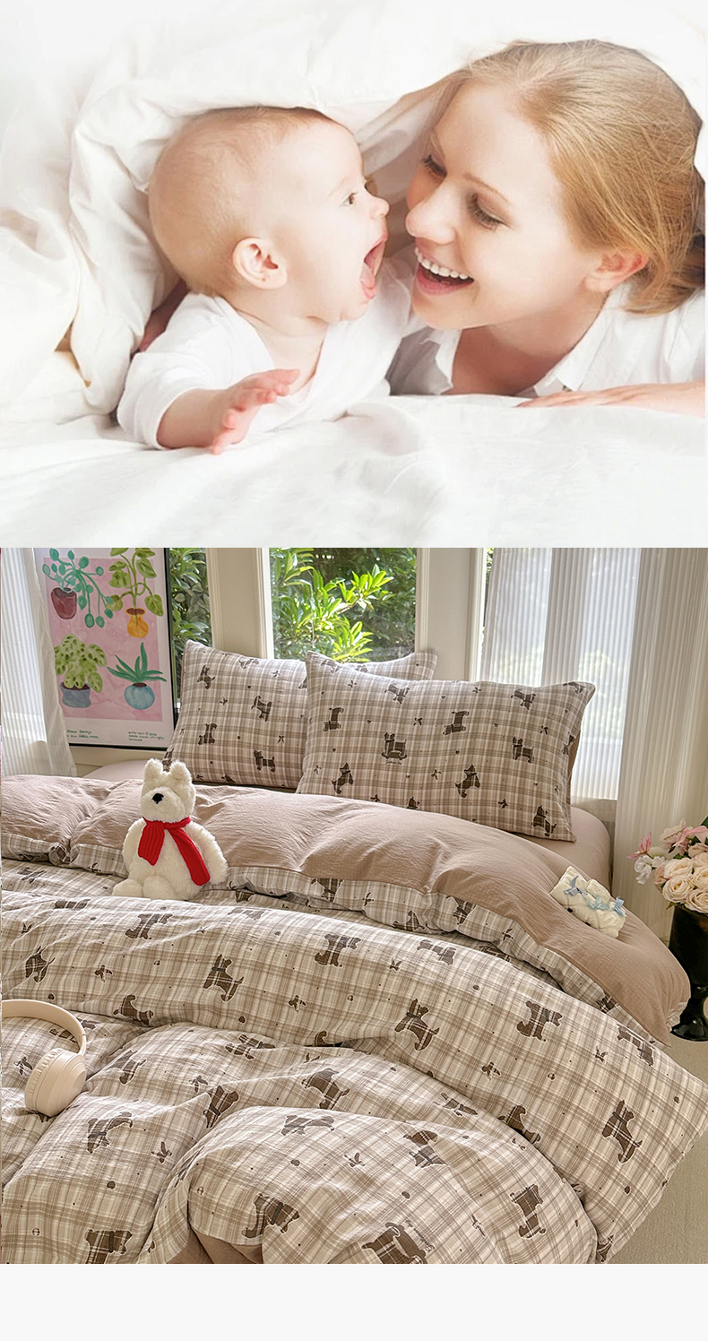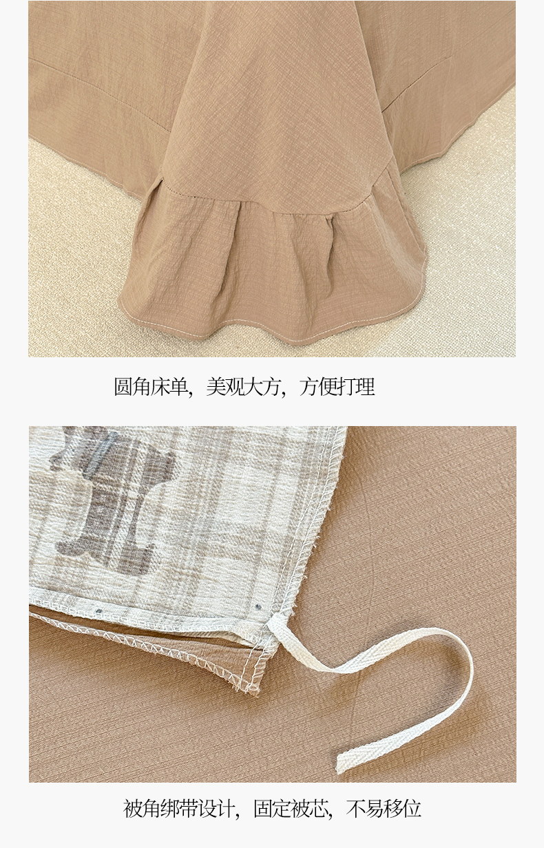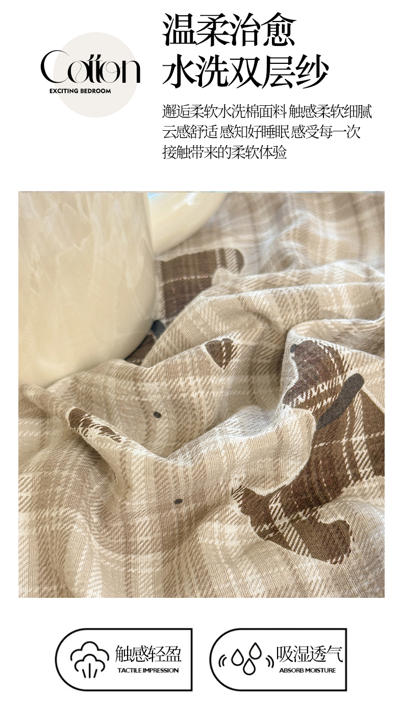 当前位置: 91家纺网 > 商品网购 > 床品套件 > 四件套 > 化纤普通四件套 > 桔禾家纺 2025新款小清新水洗棉有氧双层纱印花云感木棉皱皱纱四件套 巧克力饼干