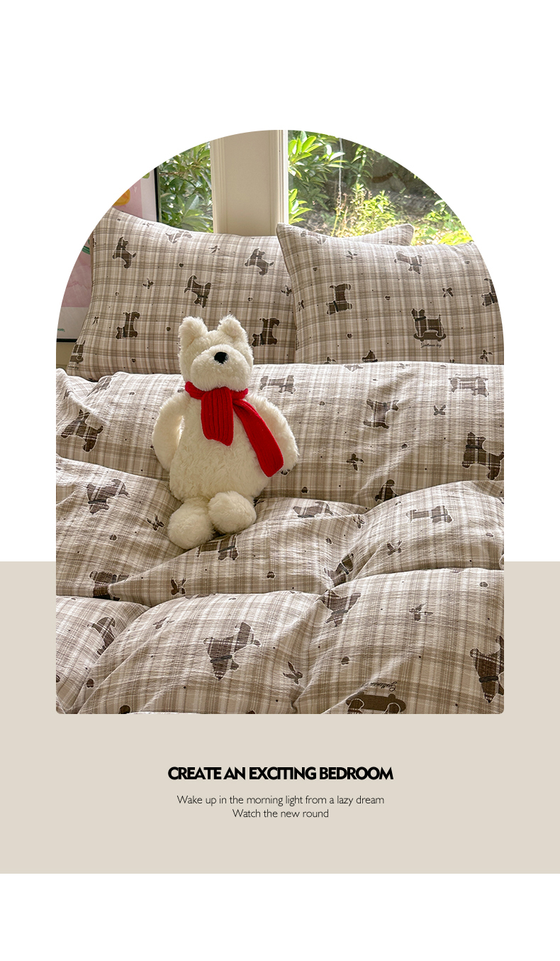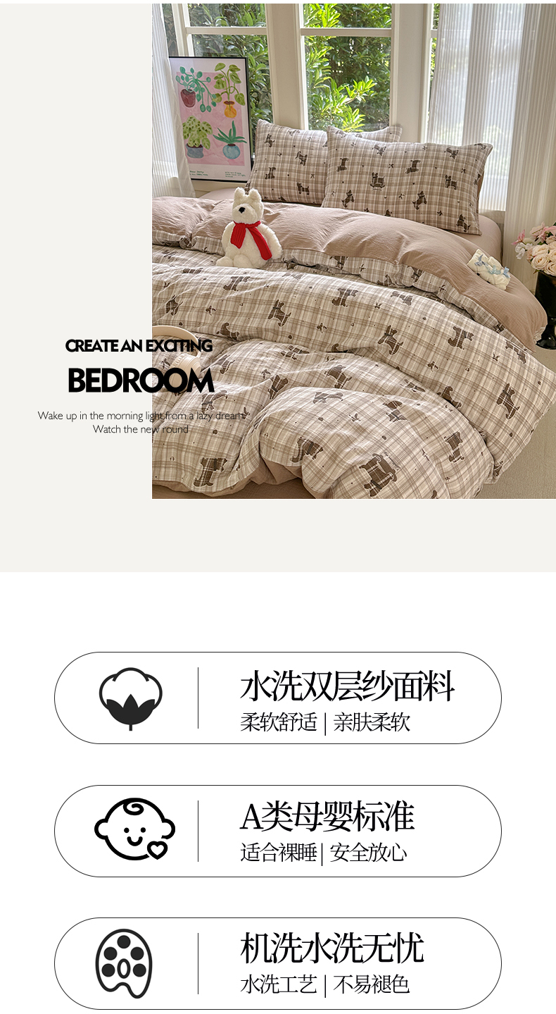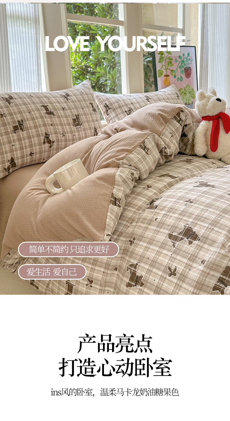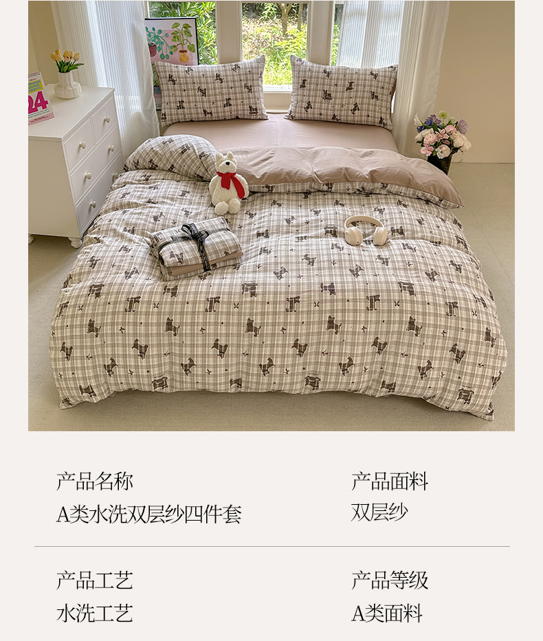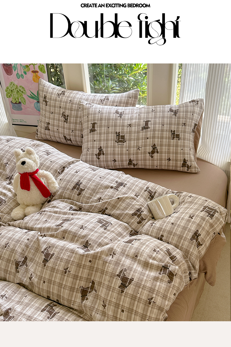 当前位置: 91家纺网 > 商品网购 > 床品套件 > 四件套 > 化纤普通四件套 > 桔禾家纺 2025新款小清新水洗棉有氧双层纱印花云感木棉皱皱纱四件套 巧克力饼干